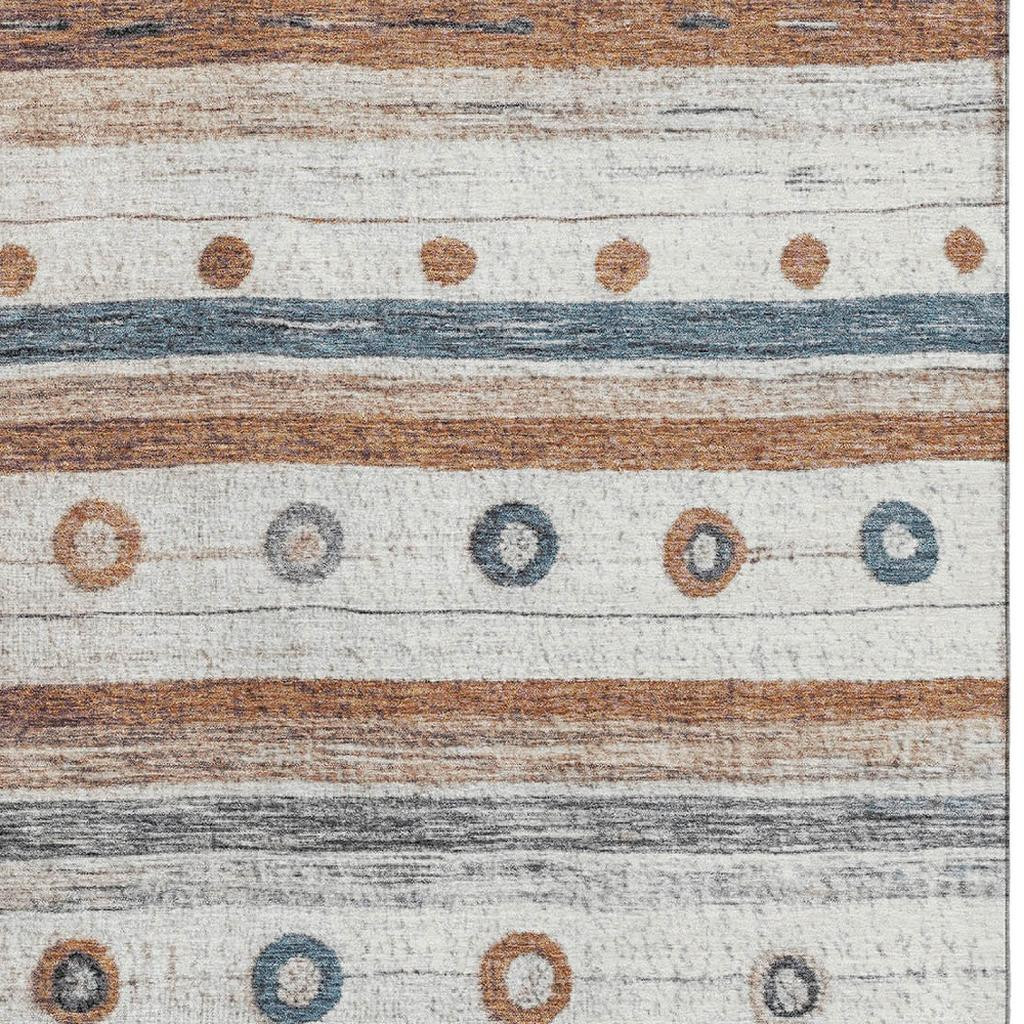 Add some artistry to your room with this 8-foot x 10-foot copper ivory and denim blue striped washable area rug with uv protection. Ideal for spaces with kids and pets, this rug is stain resistant to help repel dirt and spilled liquids. Built to last, this rug crafted from polyester fibers is known for its durability and long lasting appeal. Rugs are a great way to showcase your style, hide imperfections, warm your home and reduce noise. This larger sized, transitional styled rug is ready to create a focal point or statement piece in your room. 96.00-inch h x 120.00-inch w x 0.39-inch d.