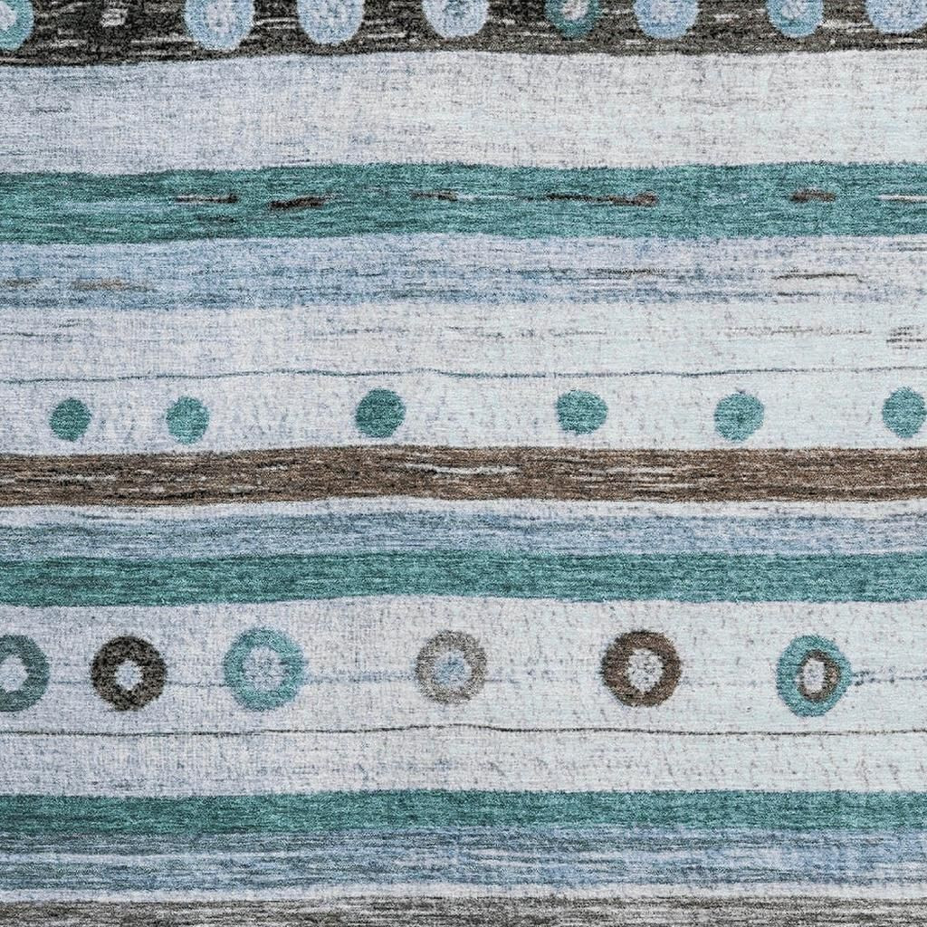 Add some artistry to your room with this 8-foot x 10-foot teal brown and ivory striped washable area rug with uv protection. Ideal for spaces with kids and pets, this rug is stain resistant to help repel dirt and spilled liquids. Built to last, this rug crafted from polyester fibers is known for its durability and long lasting appeal. Rugs are a great way to showcase your style, hide imperfections, warm your home and reduce noise. This larger sized, transitional styled rug is ready to create a focal point or statement piece in your room. 96.00-inch h x 120.00-inch w x 0.39-inch d.