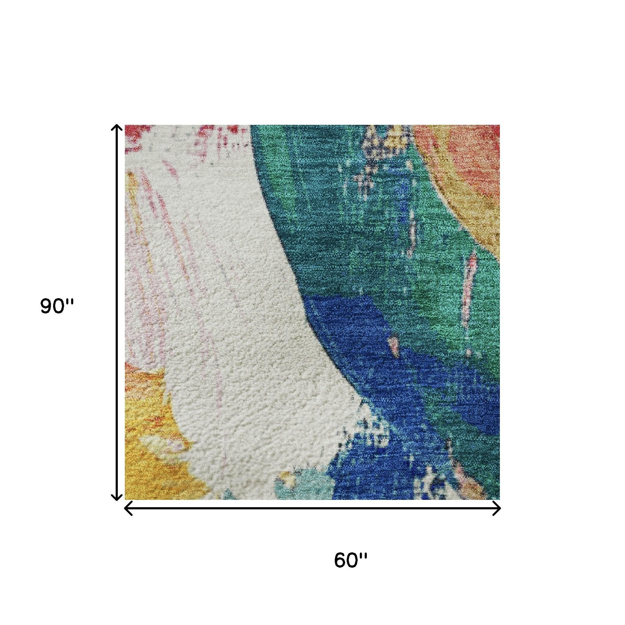 Add some artistry to your room with this 5-foot x 8-foot blush blue and emerald abstract washable area rug with uv protection. Ideal for spaces with kids and pets, this rug is stain resistant to help repel dirt and spilled liquids. Built to last, this rug crafted from polyester fibers is known for its durability and long lasting appeal. Rugs are a great way to showcase your style, hide imperfections, warm your home and reduce noise. This larger sized, transitional styled rug is ready to create a focal point or statement piece in your room. 60.00-inch h x 90.00-inch w x 0.39-inch d.