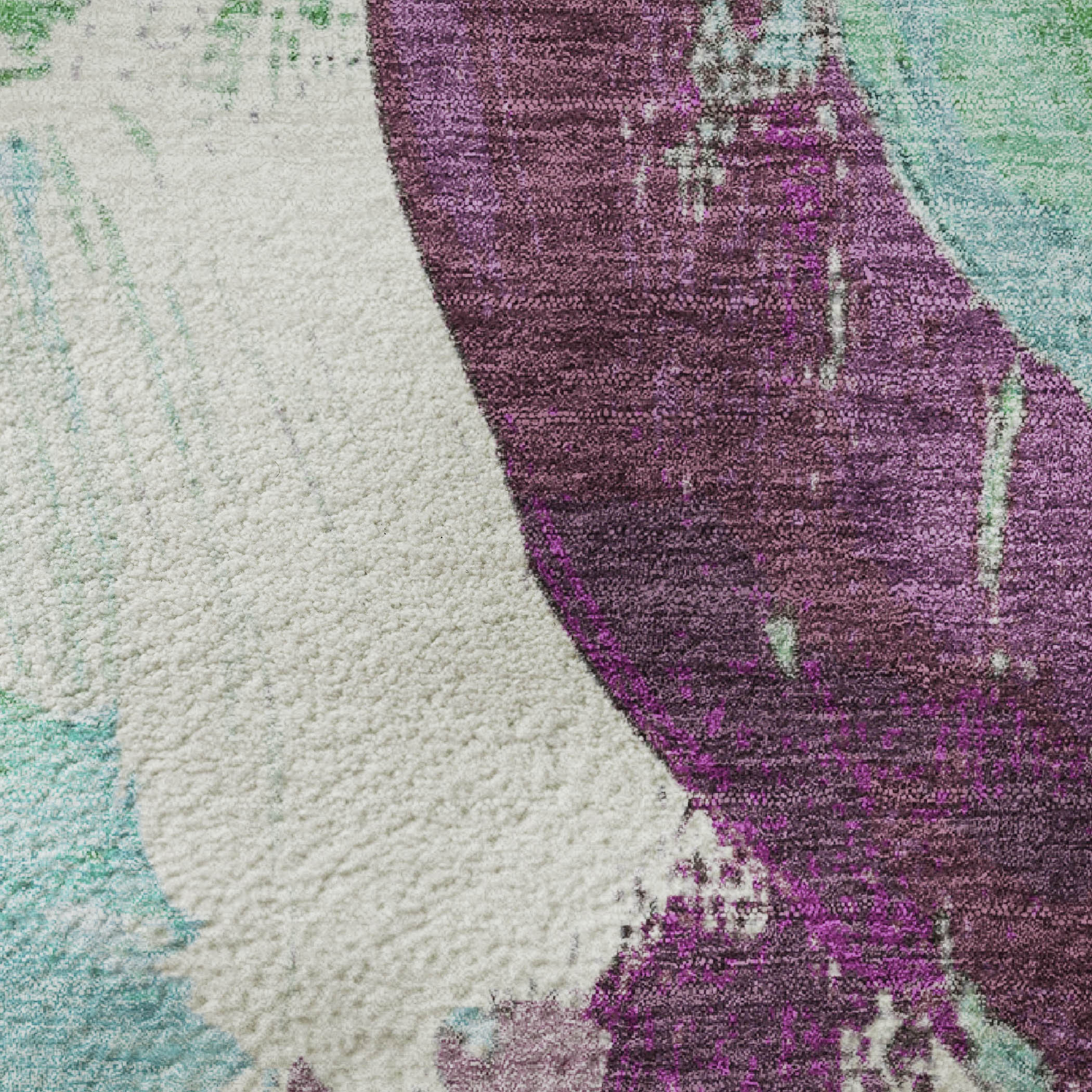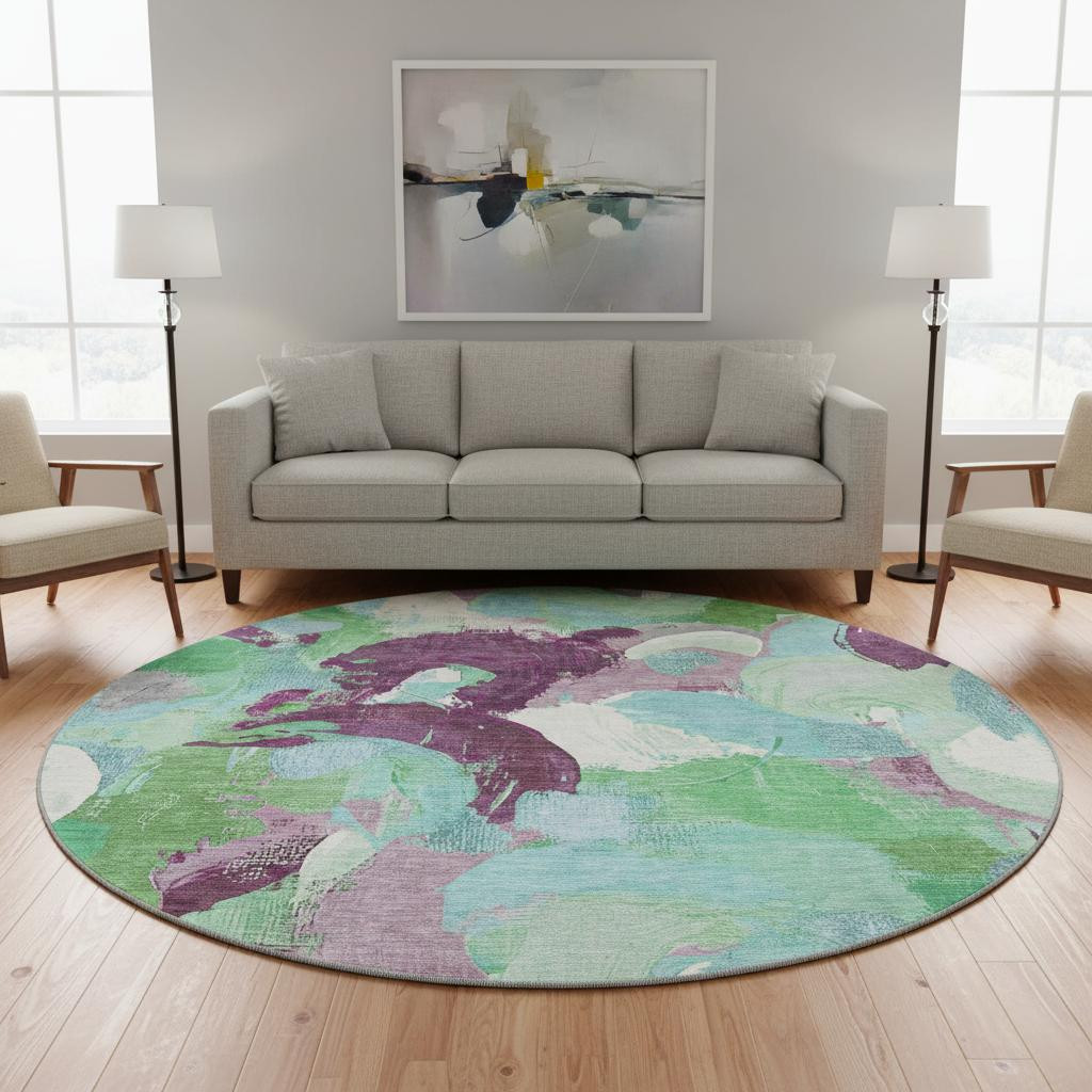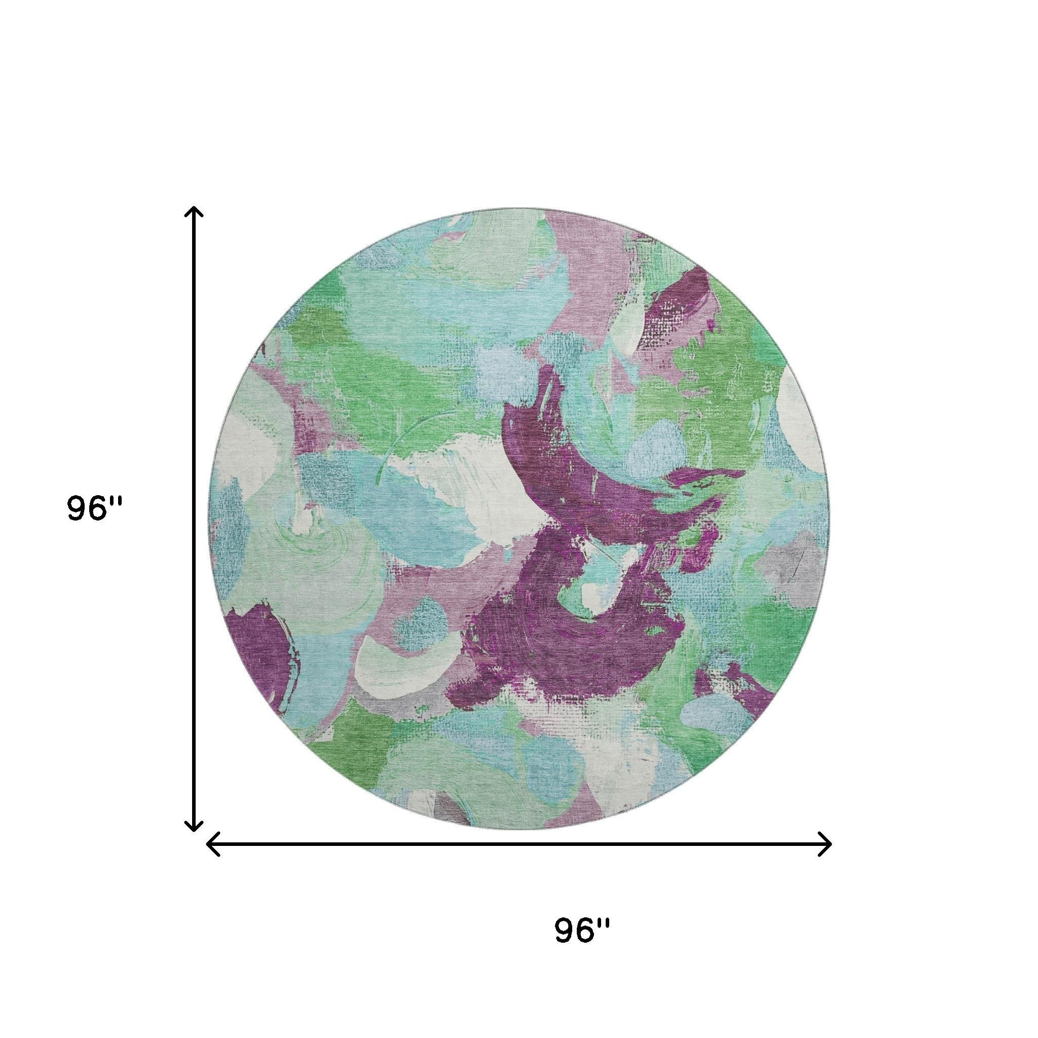 This 8-foot teal purple and green abstract washable round rug with uv protection, is a great way to add warmth to a room. Ideal for spaces with kids and pets, this rug is stain resistant to help repel dirt and spilled liquids. Built to last, this rug crafted from polyester fibers is known for its durability and long lasting appeal. Rugs are a great way to showcase your style, hide imperfections, warm your home and reduce noise. This larger sized, transitional styled rug is ready to create a focal point or statement piece in your room. 96.00-inch h x 96.00-inch w x 0.39-inch d.