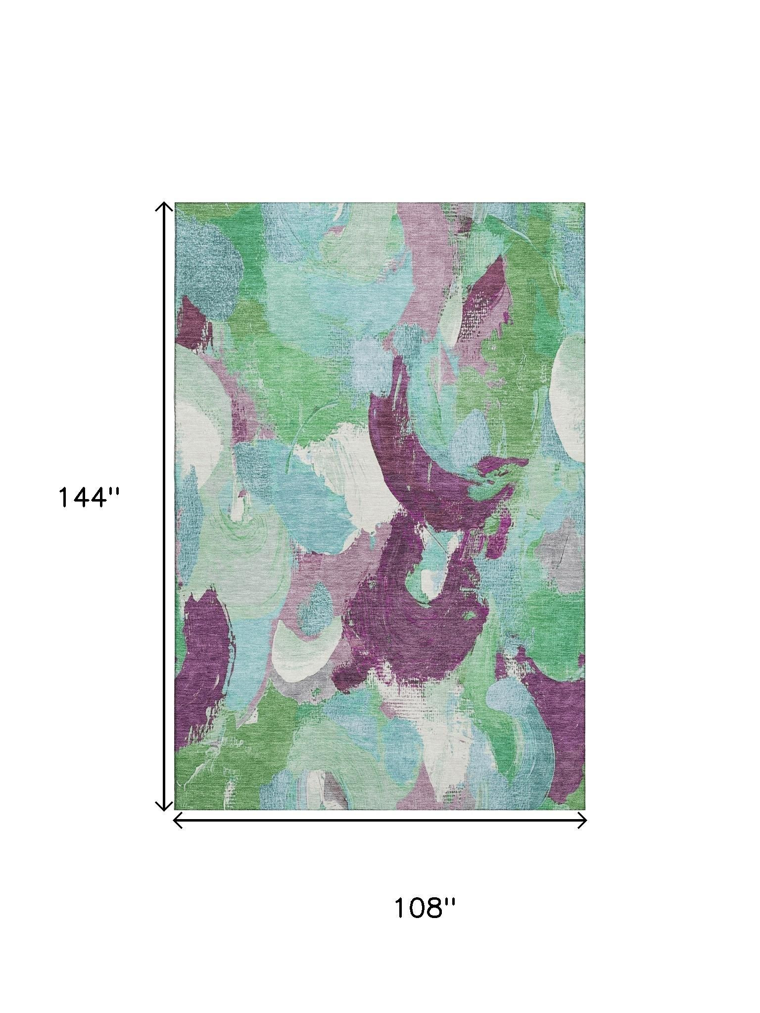 Add some artistry to your room with this 9-foot x 12-foot teal purple and green abstract washable area rug with uv protection. Ideal for spaces with kids and pets, this rug is stain resistant to help repel dirt and spilled liquids. Built to last, this rug crafted from polyester fibers is known for its durability and long lasting appeal. Rugs are a great way to showcase your style, hide imperfections, warm your home and reduce noise. This larger sized, transitional styled rug is ready to create a focal point or statement piece in your room. 108.00-inch h x 144.00-inch w x 0.39-inch d.