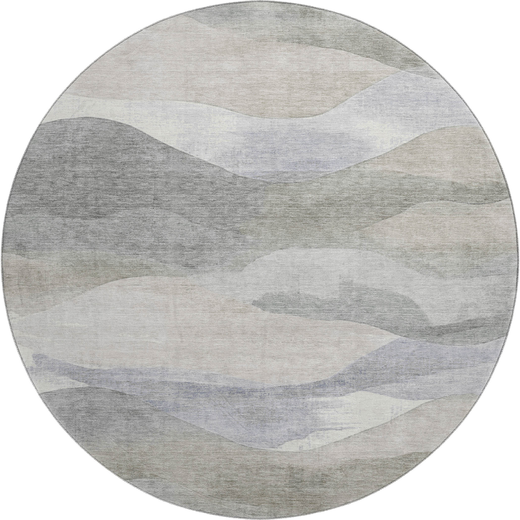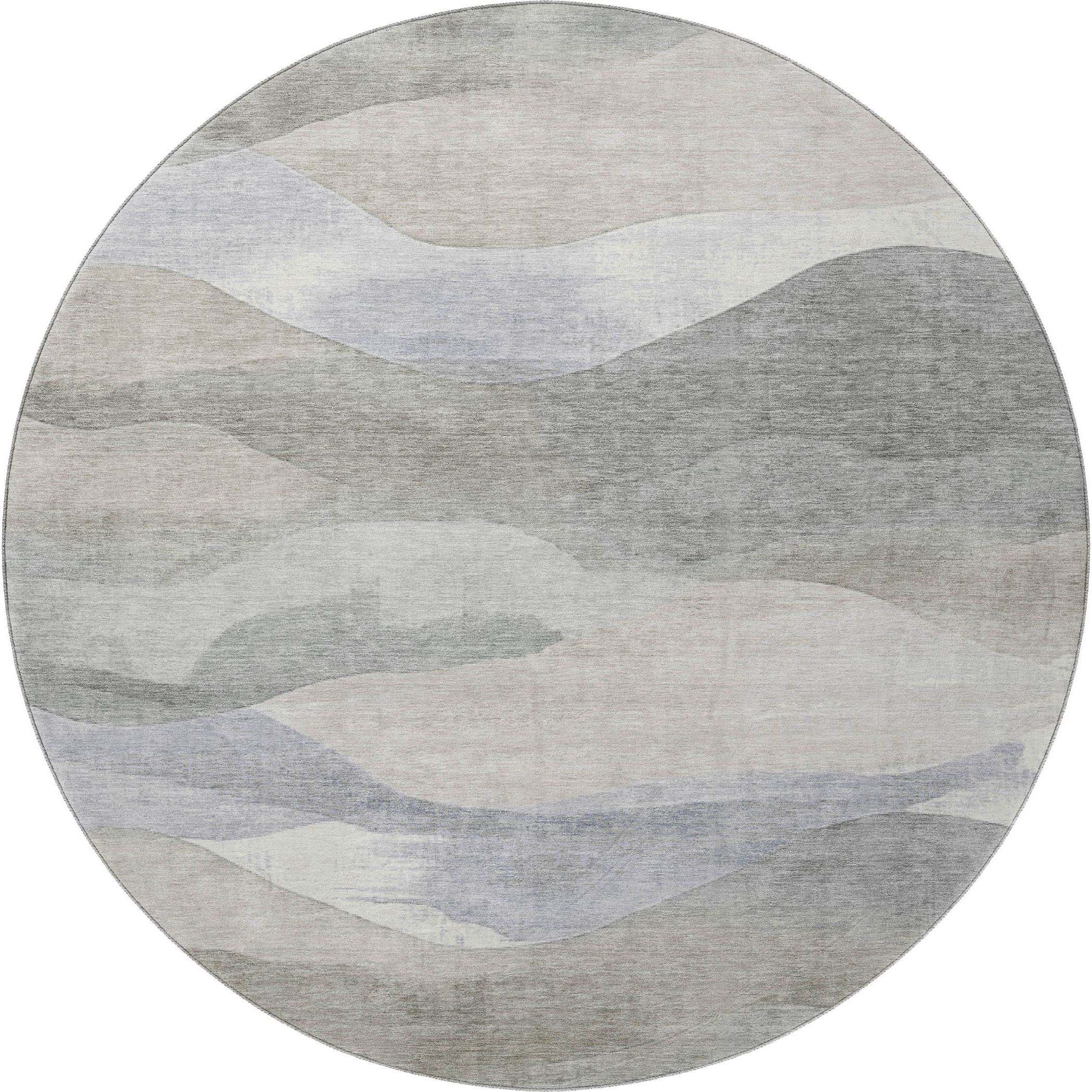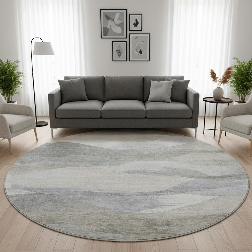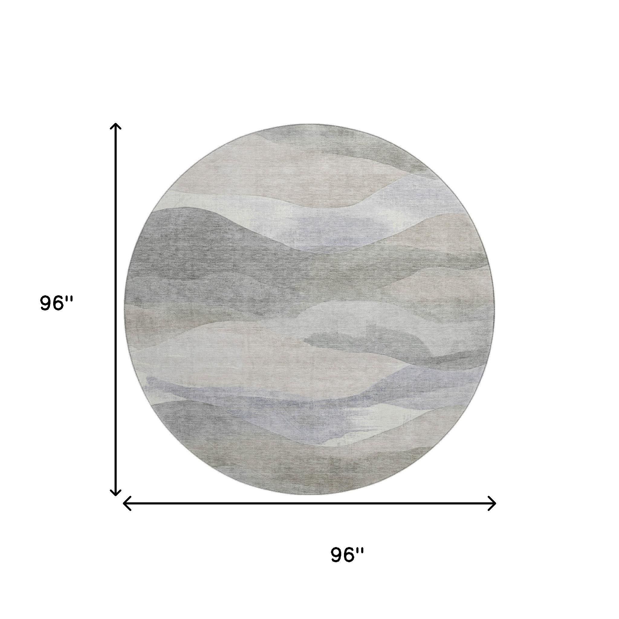 Set an inviting tone in your space with this 8-foot beige gray and ivory abstract washable round rug with uv protection. Ideal for spaces with kids and pets, this rug is stain resistant to help repel dirt and spilled liquids. Built to last, this rug crafted from polyester fibers is known for its durability and long lasting appeal. Rugs are a great way to showcase your style, hide imperfections, warm your home and reduce noise. This larger sized, transitional styled rug is ready to create a focal point or statement piece in your room. 96.00-inch h x 96.00-inch w x 0.39-inch d.