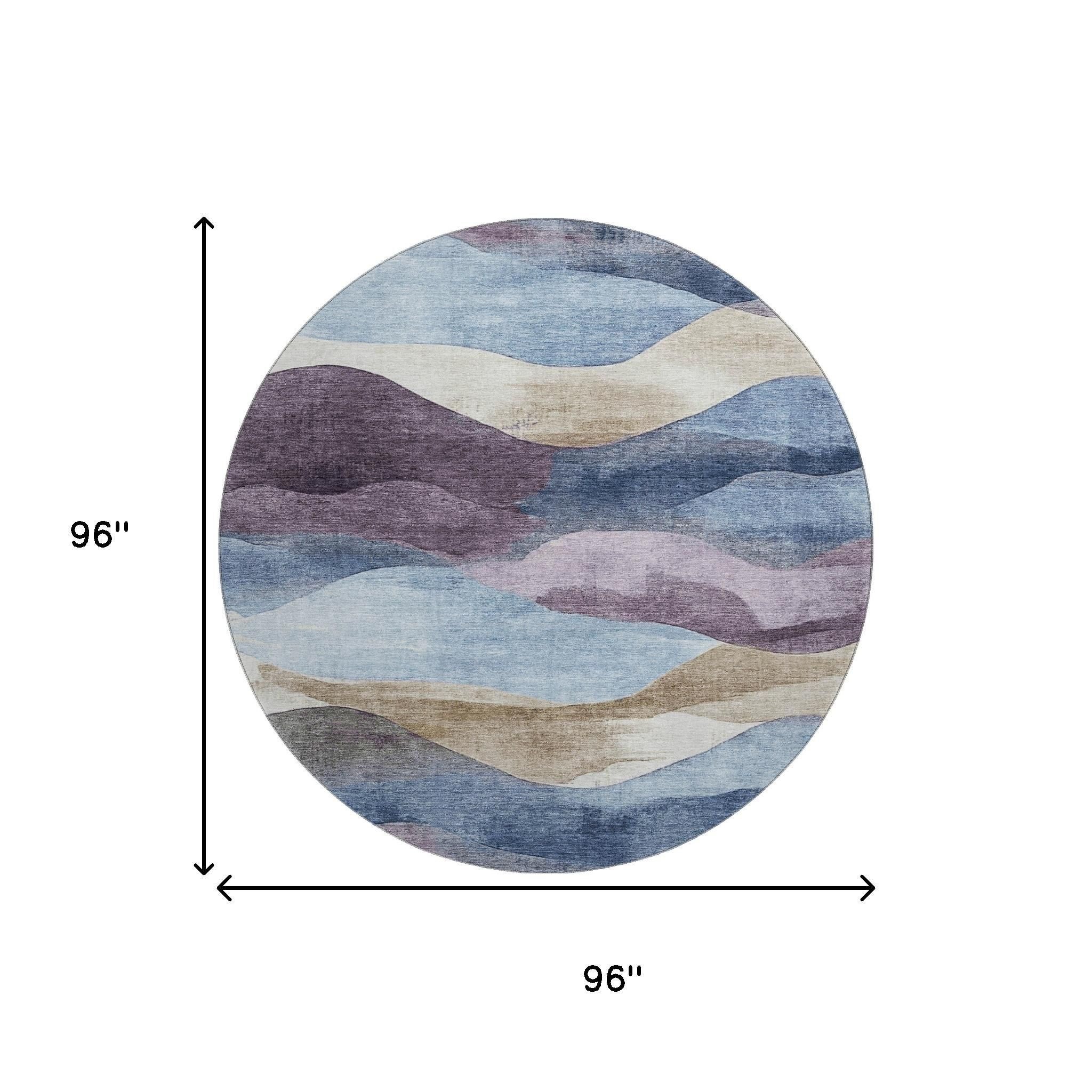 This 8-foot denim blue beige and eggplant abstract washable round rug with uv protection, is a great way to add warmth to a room. Ideal for spaces with kids and pets, this rug is stain resistant to help repel dirt and spilled liquids. Built to last, this rug crafted from polyester fibers is known for its durability and long lasting appeal. Rugs are a great way to showcase your style, hide imperfections, warm your home and reduce noise. This larger sized, transitional styled rug is ready to create a focal point or statement piece in your room. 96.00-inch h x 96.00-inch w x 0.39-inch d.