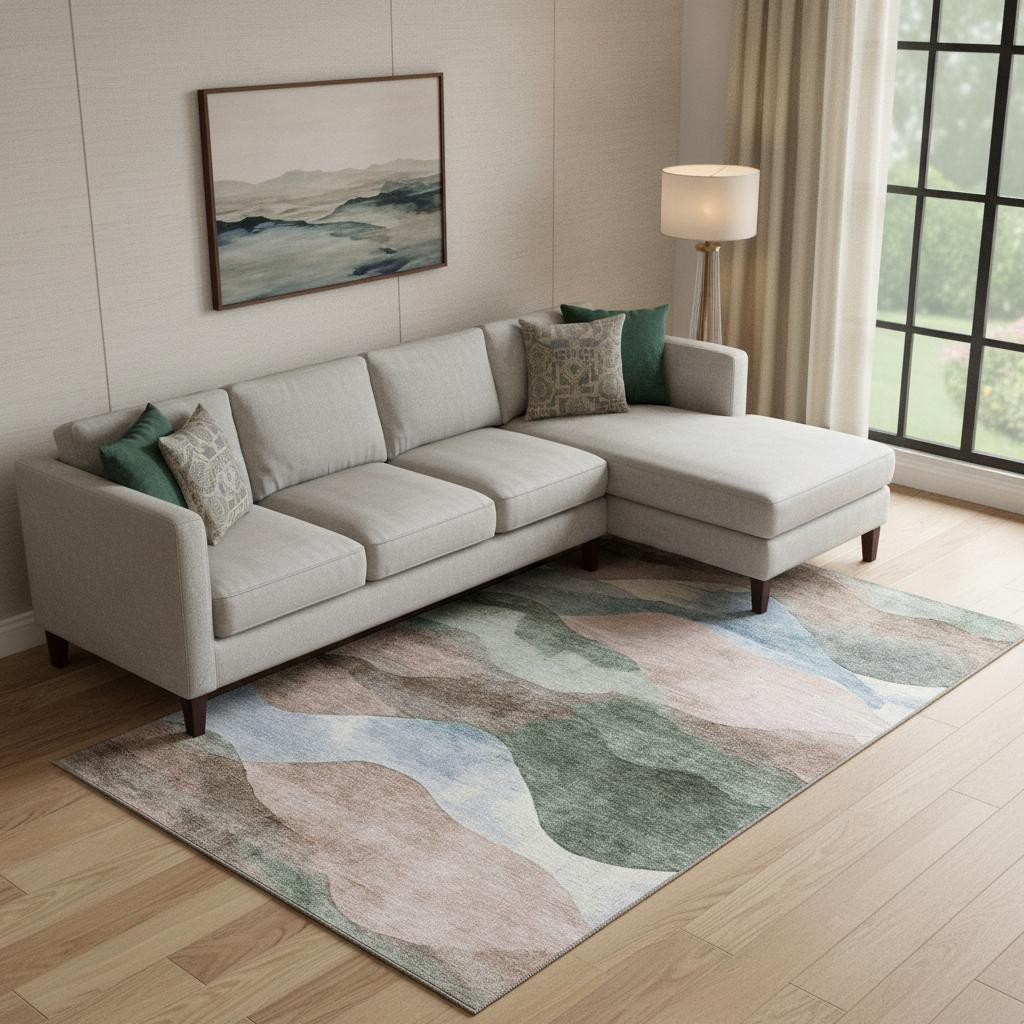 Add great coloration and comfortable texture to your space with this 9-foot x 12-foot salmon emerald and ivory abstract washable area rug with uv protection. Ideal for spaces with kids and pets, this rug is stain resistant to help repel dirt and spilled liquids. Built to last, this rug crafted from polyester fibers is known for its durability and long lasting appeal. Rugs are a great way to showcase your style, hide imperfections, warm your home and reduce noise. This larger sized, transitional styled rug is ready to create a focal point or statement piece in your room. 108.00-inch h x 144.00-inch w x 0.39-inch d.