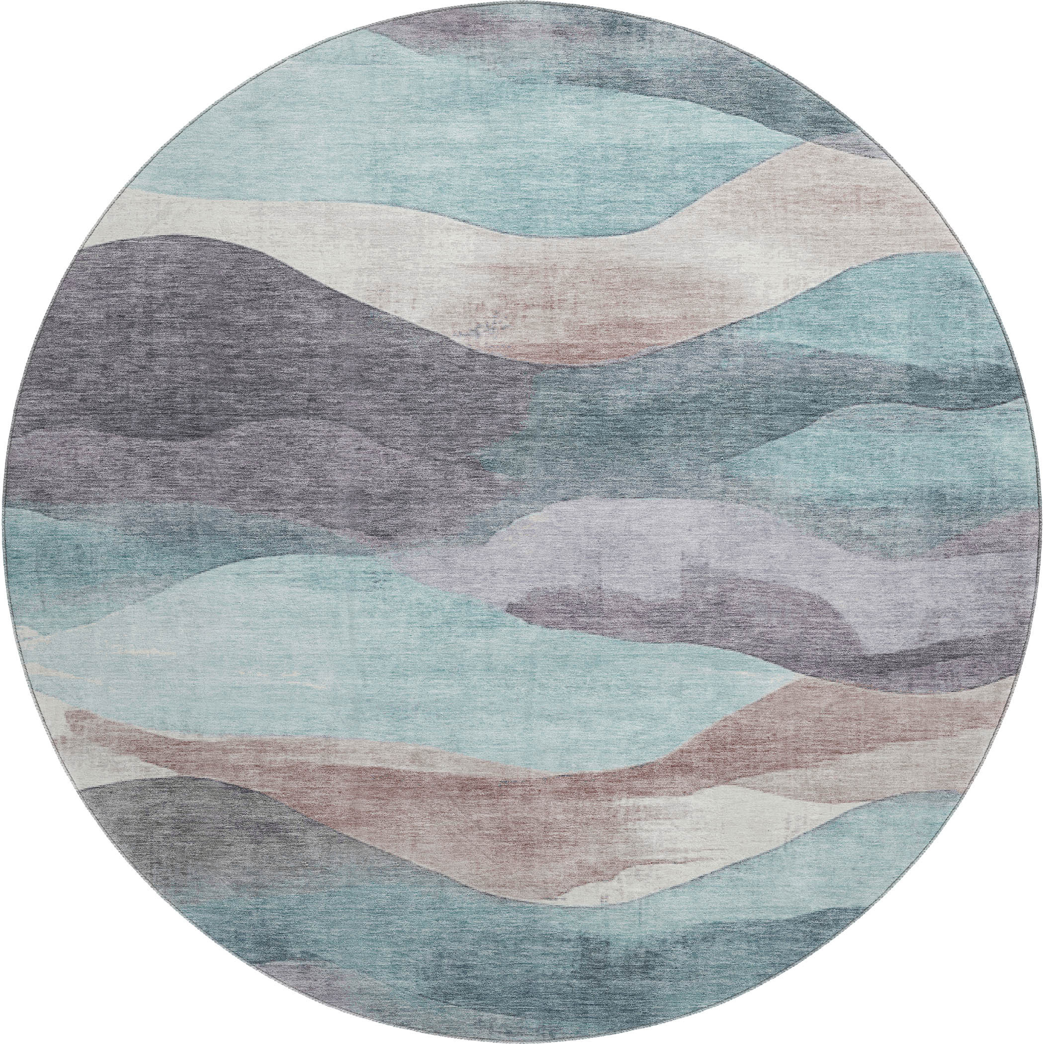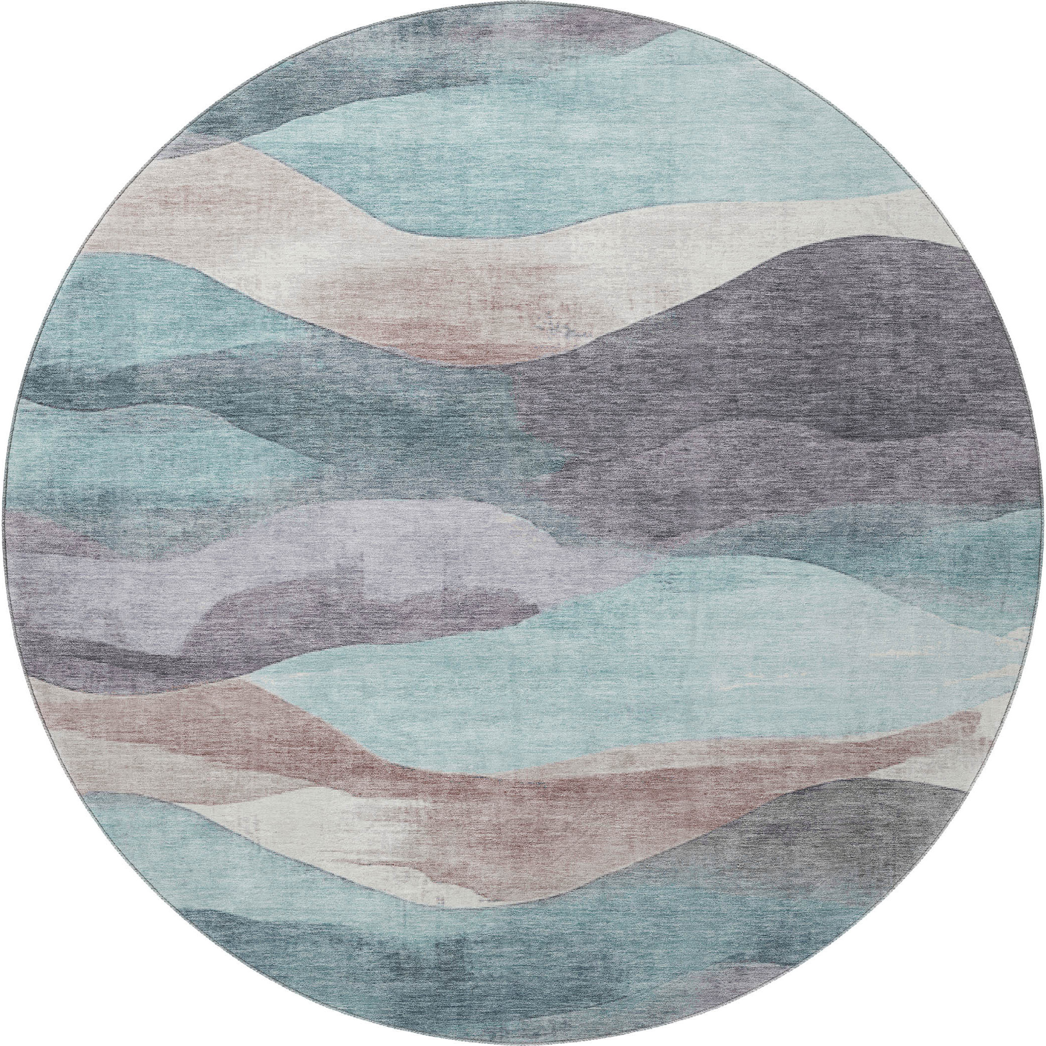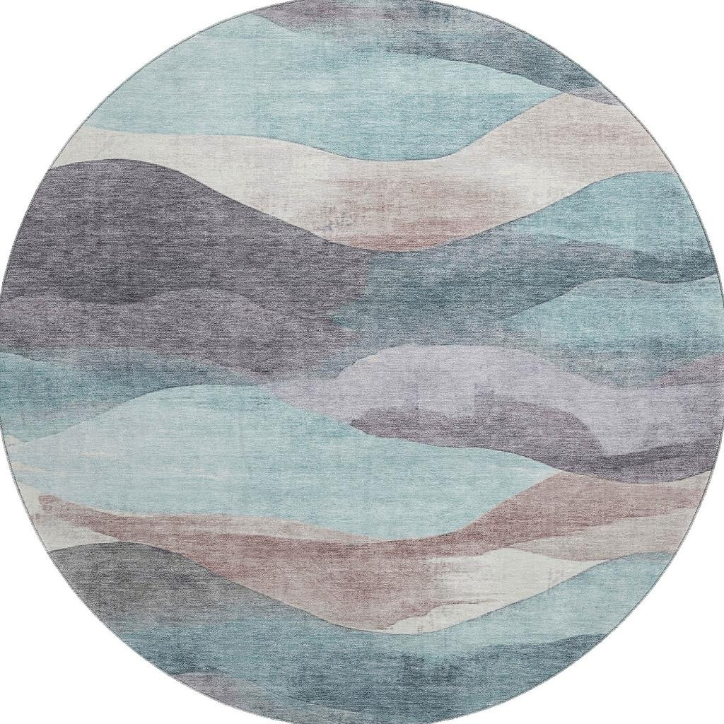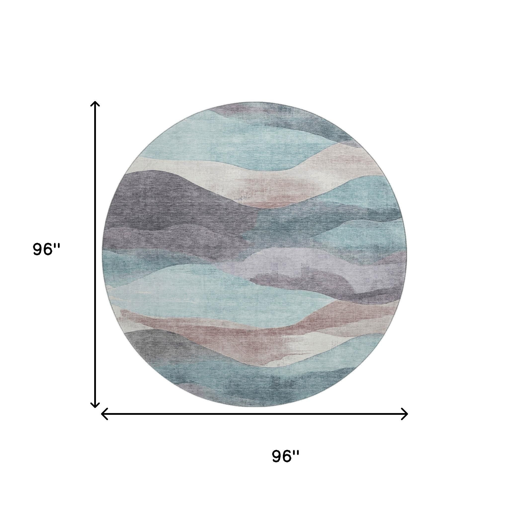 Add some artistry to your room with this 8-foot teal beige and ivory abstract washable round rug with uv protection. Ideal for spaces with kids and pets, this rug is stain resistant to help repel dirt and spilled liquids. Built to last, this rug crafted from polyester fibers is known for its durability and long lasting appeal. Rugs are a great way to showcase your style, hide imperfections, warm your home and reduce noise. This larger sized, transitional styled rug is ready to create a focal point or statement piece in your room. 96.00-inch h x 96.00-inch w x 0.39-inch d.