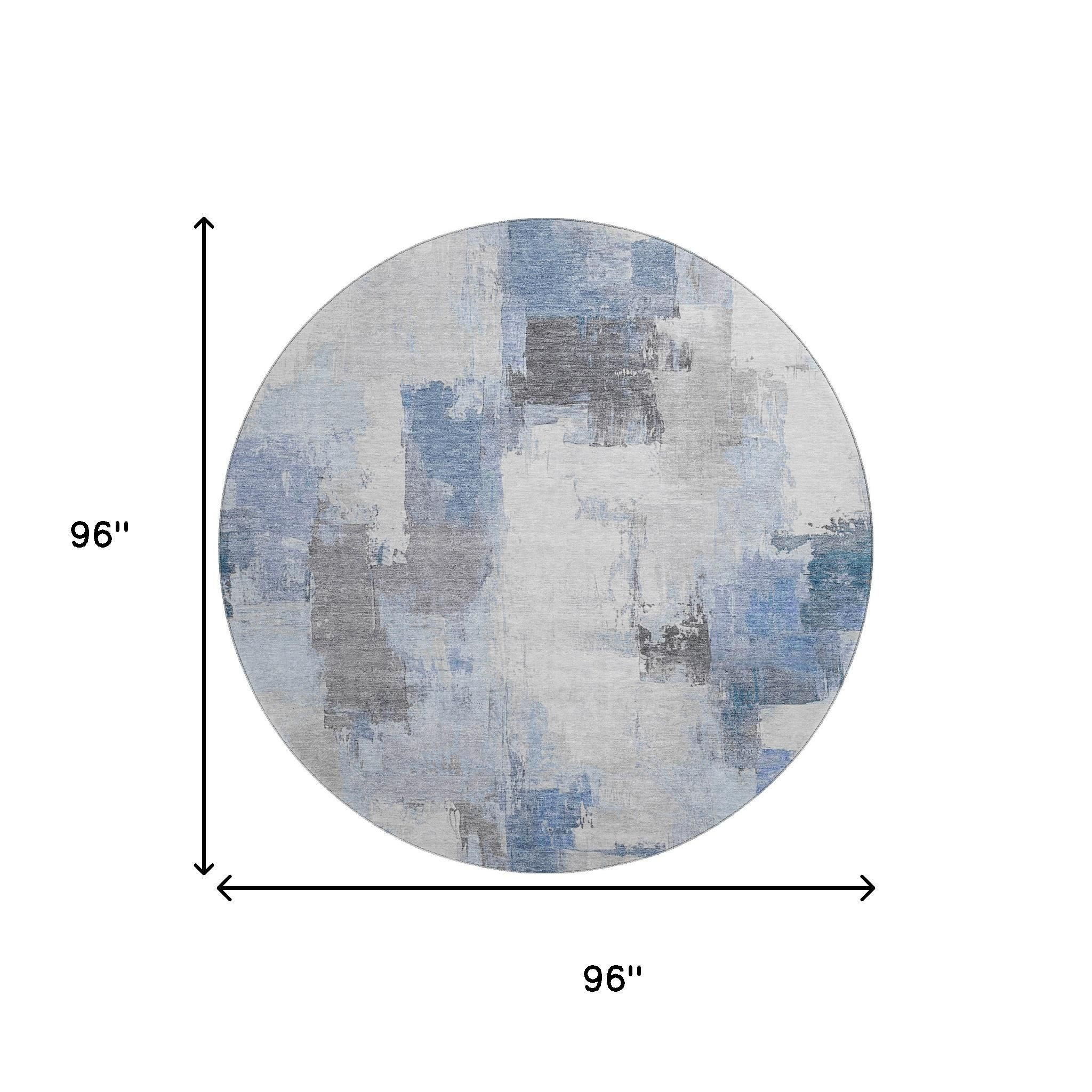Add great coloration and comfortable texture to your space with this 8-foot denim blue gray and ivory abstract washable round rug with uv protection. Ideal for spaces with kids and pets, this rug is stain resistant to help repel dirt and spilled liquids. Built to last, this rug crafted from polyester fibers is known for its durability and long lasting appeal. Rugs are a great way to showcase your style, hide imperfections, warm your home and reduce noise. This larger sized, transitional styled rug is ready to create a focal point or statement piece in your room. 96.00-inch h x 96.00-inch w x 0.39-inch d.