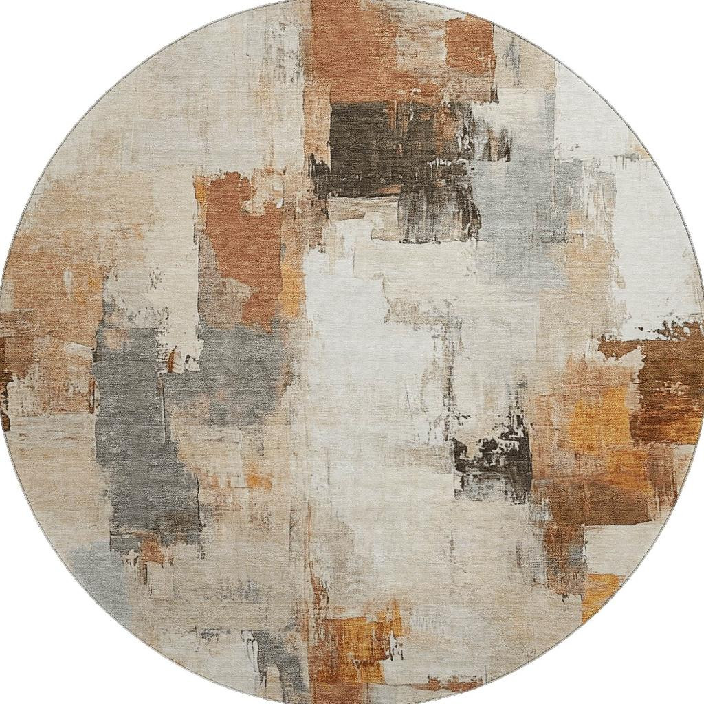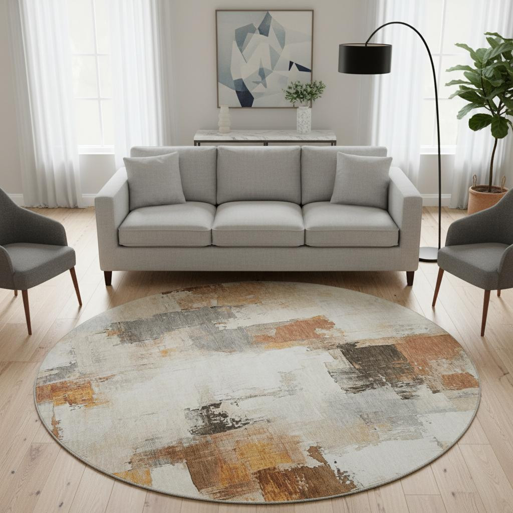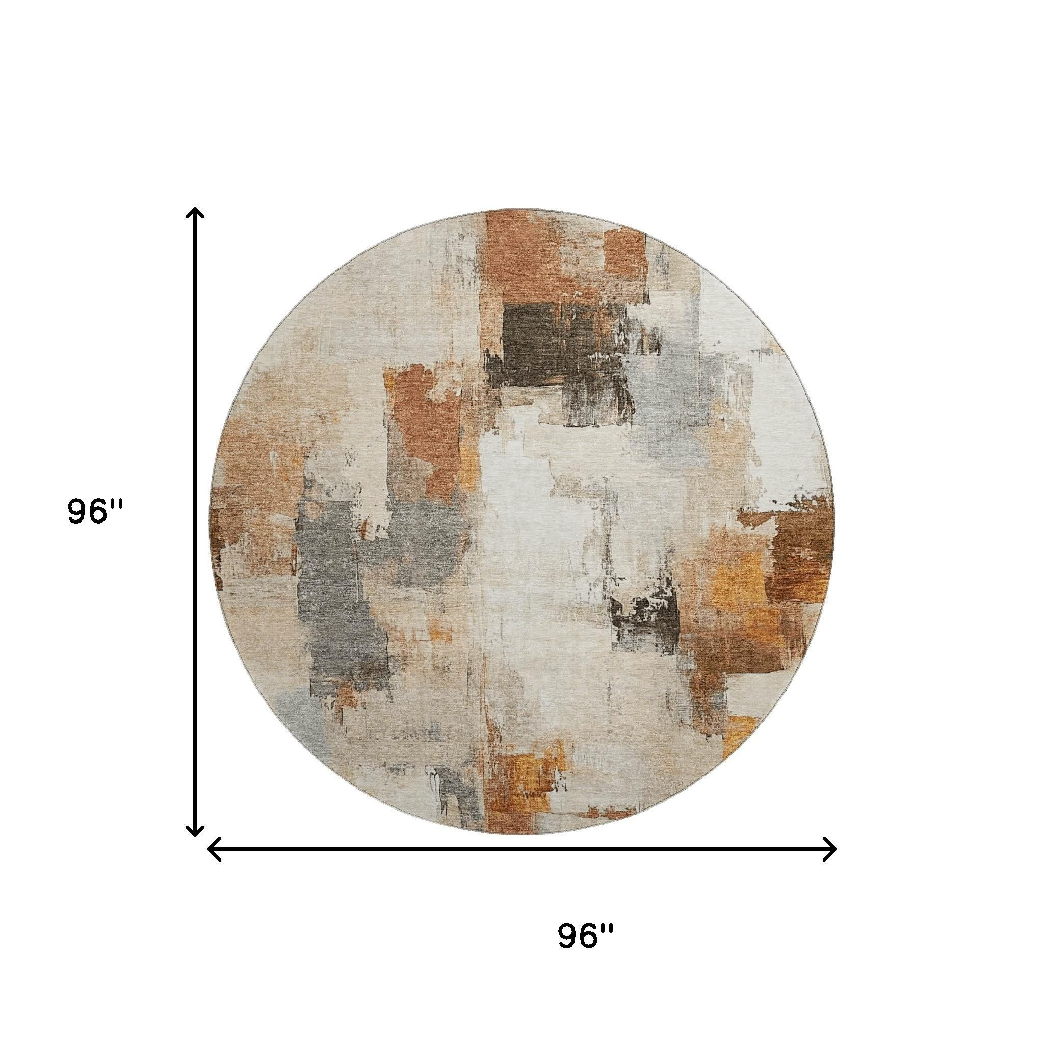 Add great coloration and comfortable texture to your space with this 8-foot ivory rust and beige abstract washable round rug with uv protection. Ideal for spaces with kids and pets, this rug is stain resistant to help repel dirt and spilled liquids. Built to last, this rug crafted from polyester fibers is known for its durability and long lasting appeal. Rugs are a great way to showcase your style, hide imperfections, warm your home and reduce noise. This larger sized, transitional styled rug is ready to create a focal point or statement piece in your room. 96.00-inch h x 96.00-inch w x 0.39-inch d.