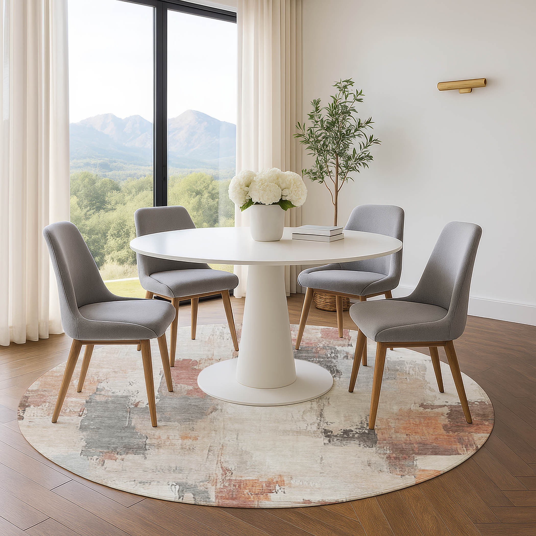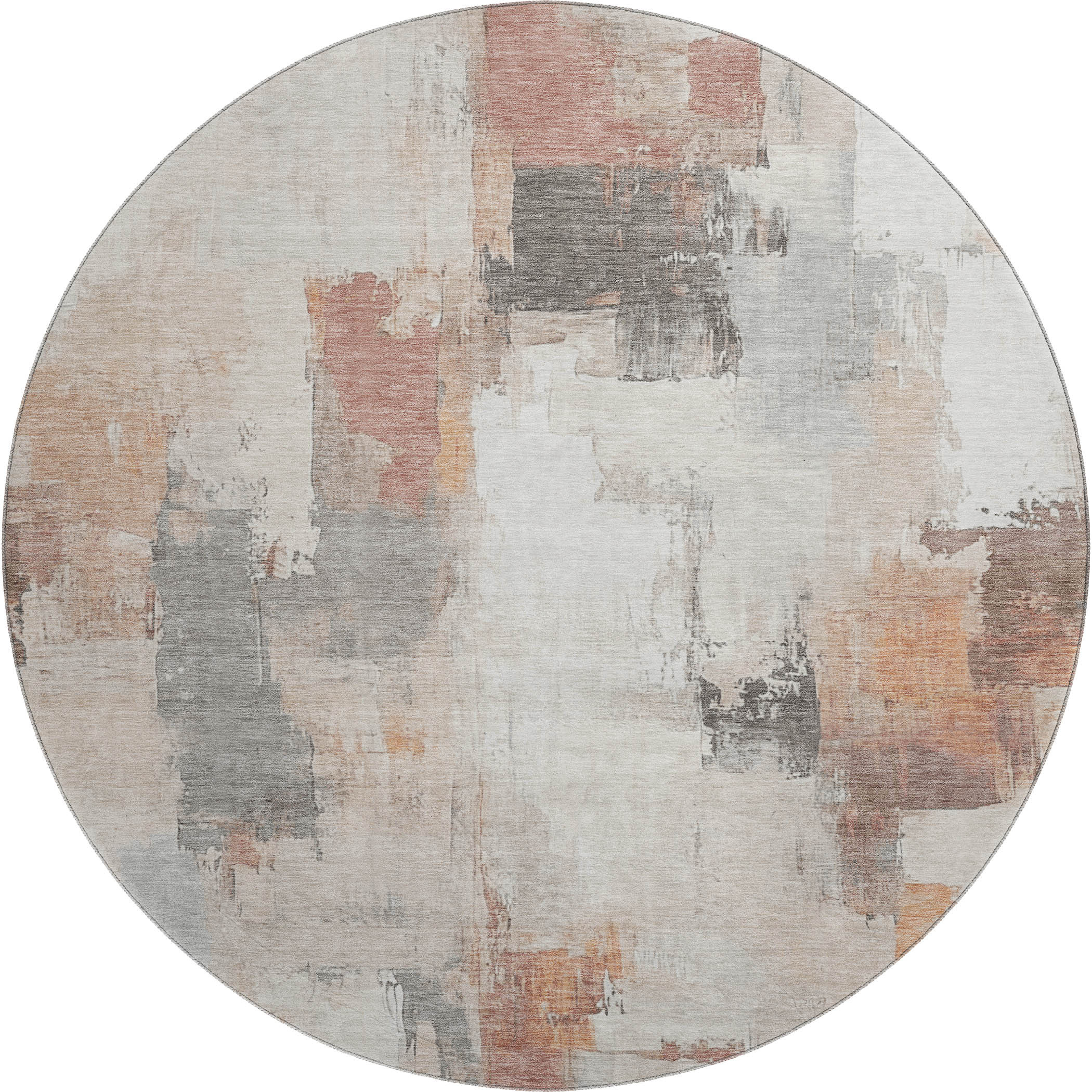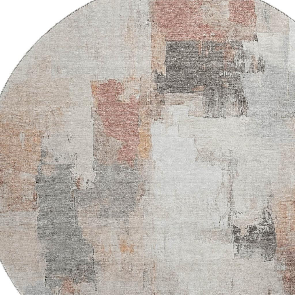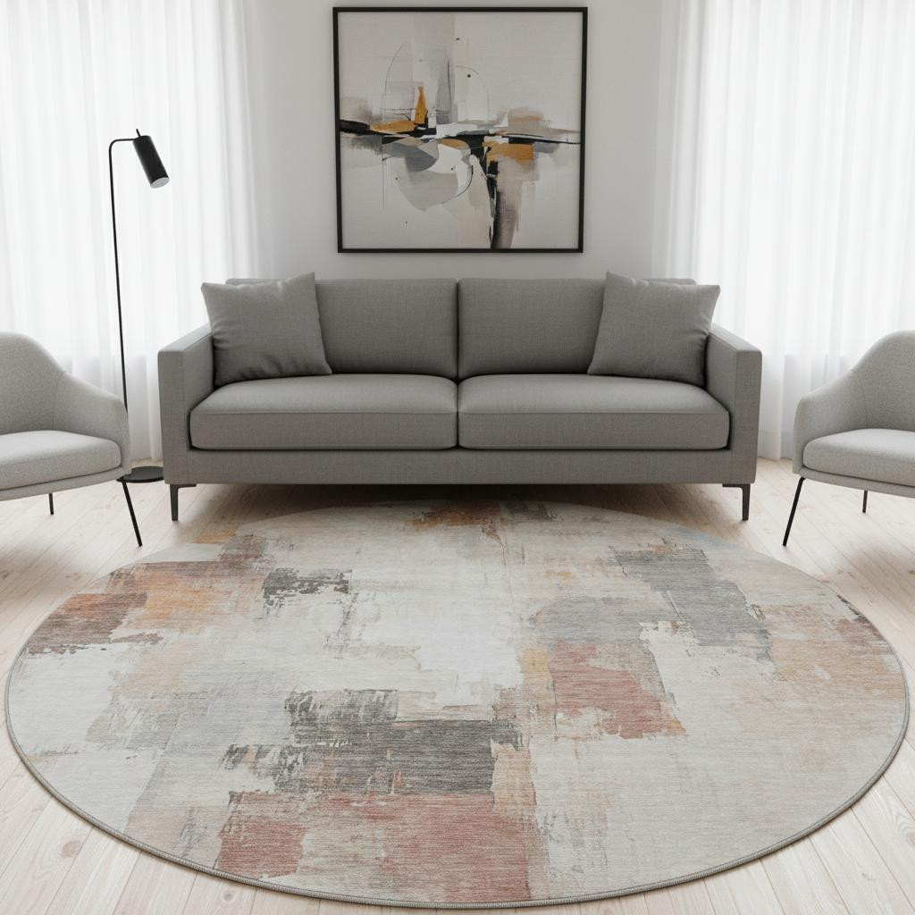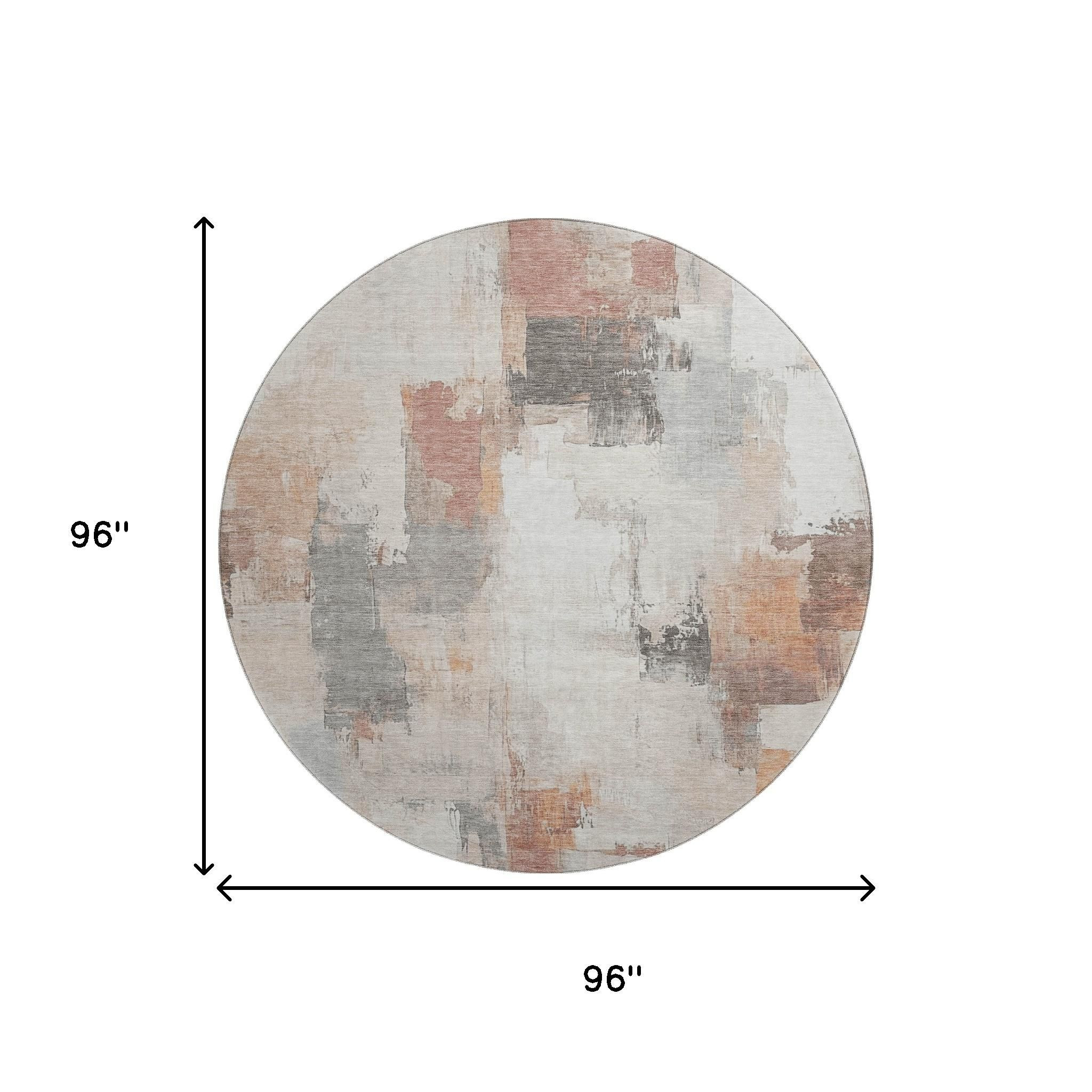 This 8-foot rust gray and ivory abstract washable round rug with uv protection, is a great way to add warmth to a room. Ideal for spaces with kids and pets, this rug is stain resistant to help repel dirt and spilled liquids. Built to last, this rug crafted from polyester fibers is known for its durability and long lasting appeal. Rugs are a great way to showcase your style, hide imperfections, warm your home and reduce noise. This larger sized, transitional styled rug is ready to create a focal point or statement piece in your room. 96.00-inch h x 96.00-inch w x 0.39-inch d.