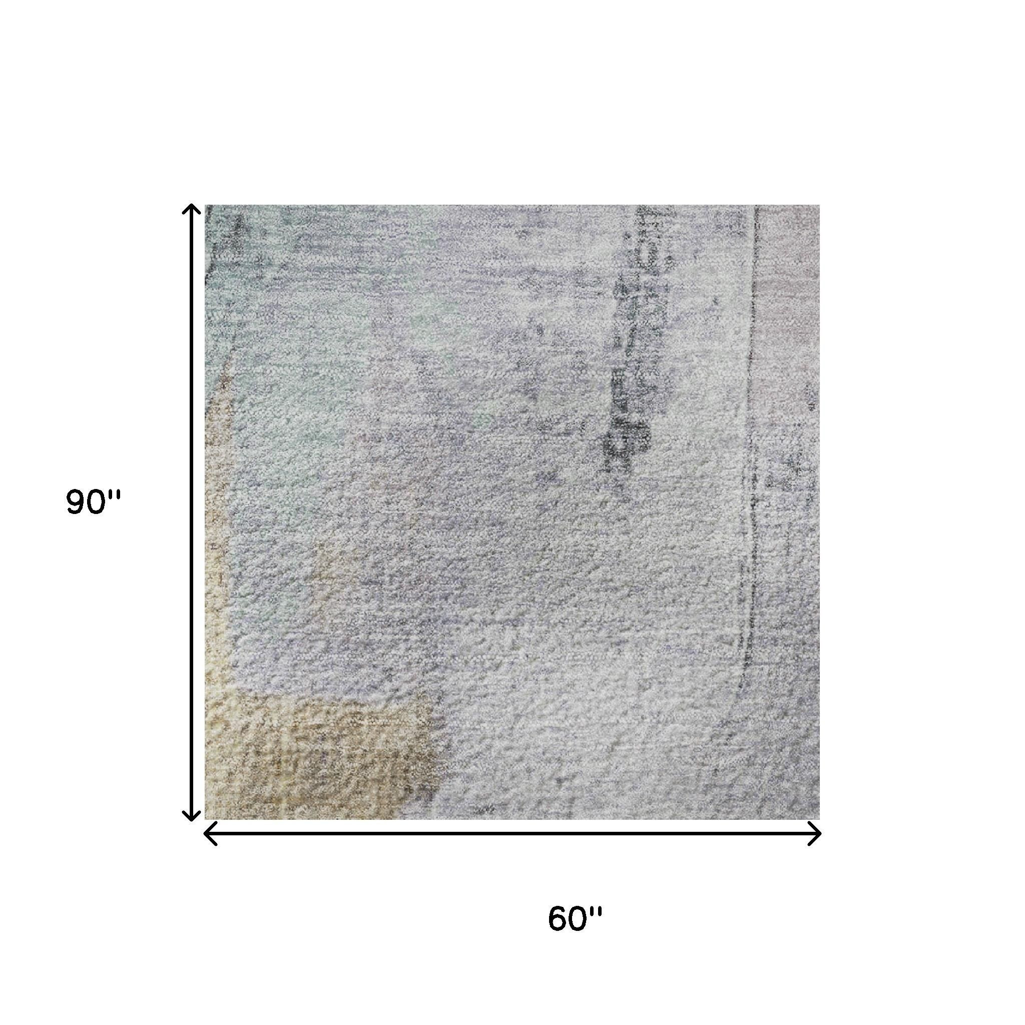 This 5-foot x 8-foot lavender gold and charcoal abstract washable area rug with uv protection, is a great way to add warmth to a room. Ideal for spaces with kids and pets, this rug is stain resistant to help repel dirt and spilled liquids. Built to last, this rug crafted from polyester fibers is known for its durability and long lasting appeal. Rugs are a great way to showcase your style, hide imperfections, warm your home and reduce noise. This larger sized, transitional styled rug is ready to create a focal point or statement piece in your room. 60.00-inch h x 90.00-inch w x 0.39-inch d.
