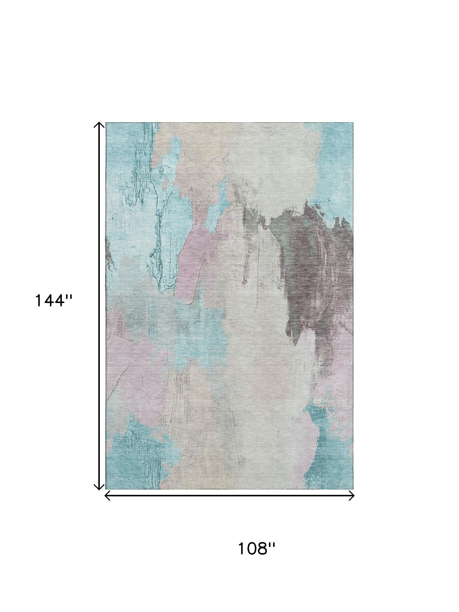 Add some artistry to your room with this 9-foot x 12-foot teal beige and gray abstract washable area rug with uv protection. Ideal for spaces with kids and pets, this rug is stain resistant to help repel dirt and spilled liquids. Built to last, this rug crafted from polyester fibers is known for its durability and long lasting appeal. Rugs are a great way to showcase your style, hide imperfections, warm your home and reduce noise. This larger sized, transitional styled rug is ready to create a focal point or statement piece in your room. 108.00-inch h x 144.00-inch w x 0.39-inch d.