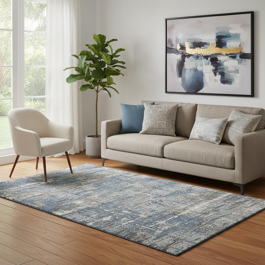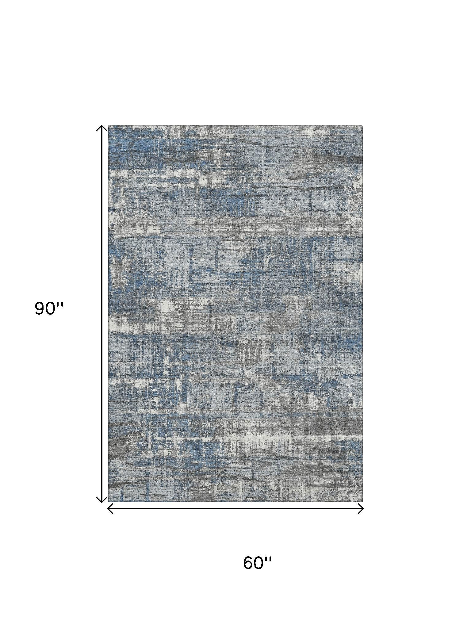 This 5-foot x 8-foot denim blue gray and ivory geometric washable area rug with uv protection, is a great way to add warmth to a room. Ideal for spaces with kids and pets, this rug is stain resistant to help repel dirt and spilled liquids. Built to last, this rug crafted from polyester fibers is known for its durability and long lasting appeal. Rugs are a great way to showcase your style, hide imperfections, warm your home and reduce noise. This larger sized, transitional styled rug is ready to create a focal point or statement piece in your room. 60.00-inch h x 90.00-inch w x 0.39-inch d.