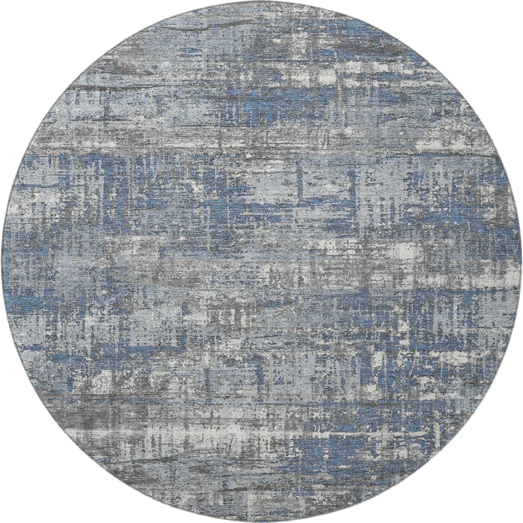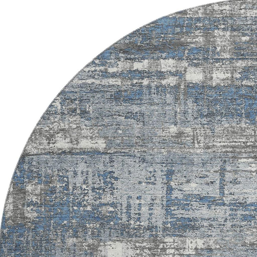 Add some artistry to your room with this 8-foot denim blue gray and ivory geometric washable round rug with uv protection. Ideal for spaces with kids and pets, this rug is stain resistant to help repel dirt and spilled liquids. Built to last, this rug crafted from polyester fibers is known for its durability and long lasting appeal. Rugs are a great way to showcase your style, hide imperfections, warm your home and reduce noise. This larger sized, transitional styled rug is ready to create a focal point or statement piece in your room. 96.00-inch h x 96.00-inch w x 0.39-inch d.