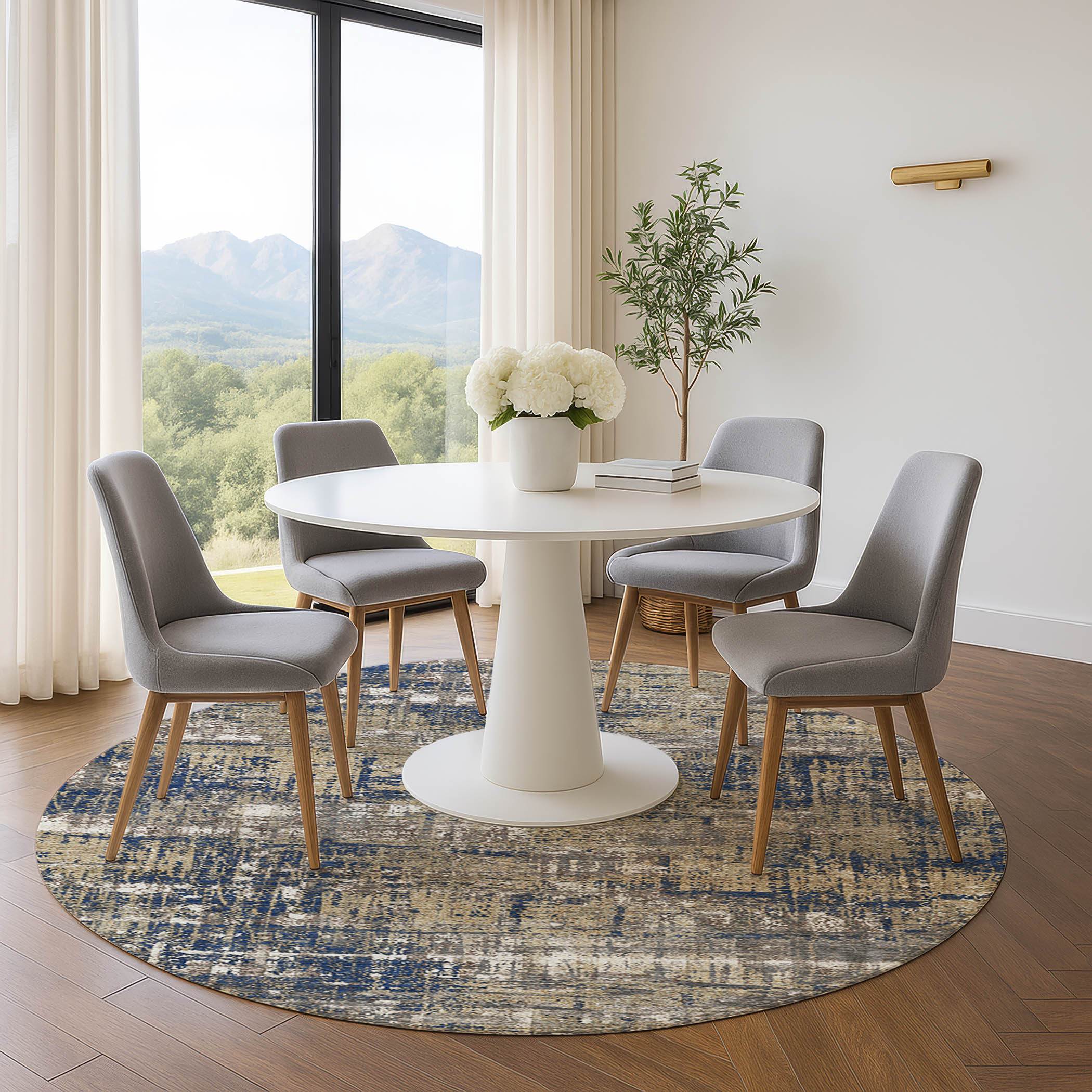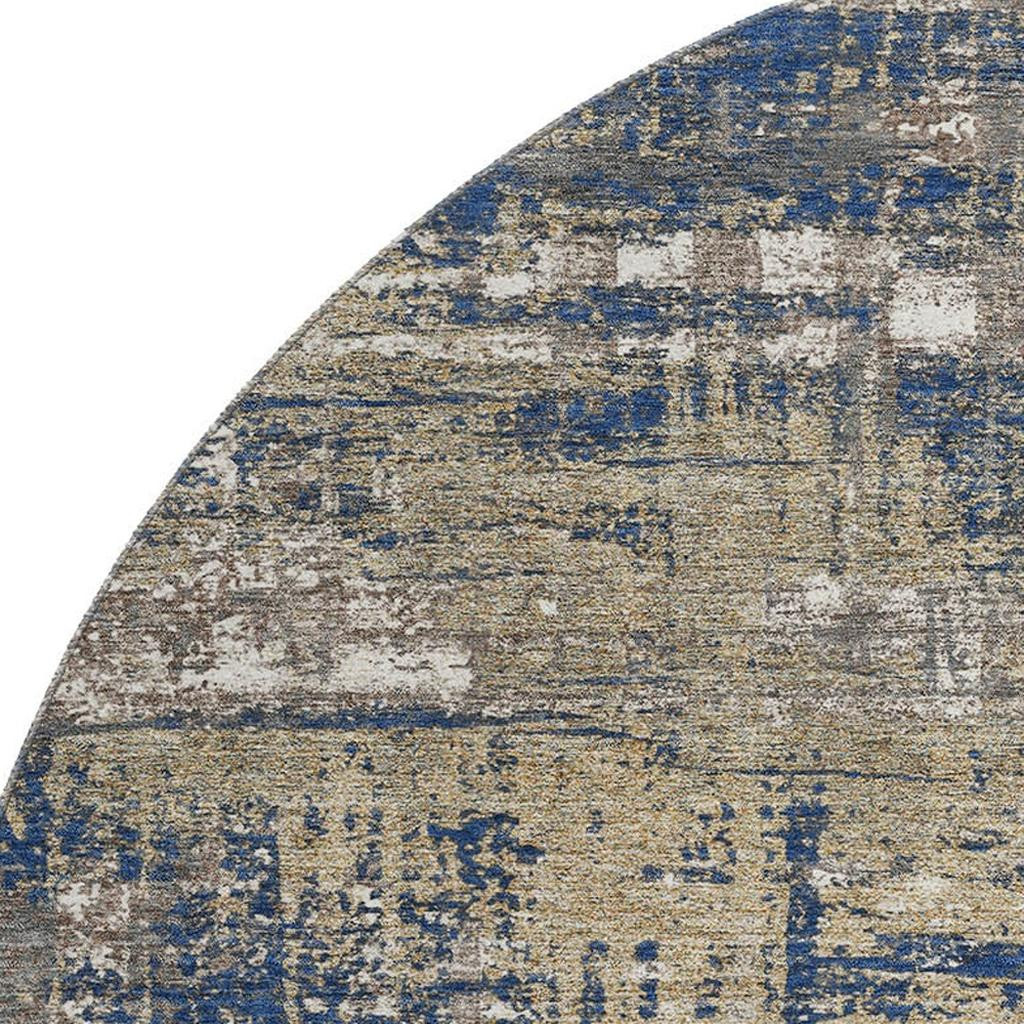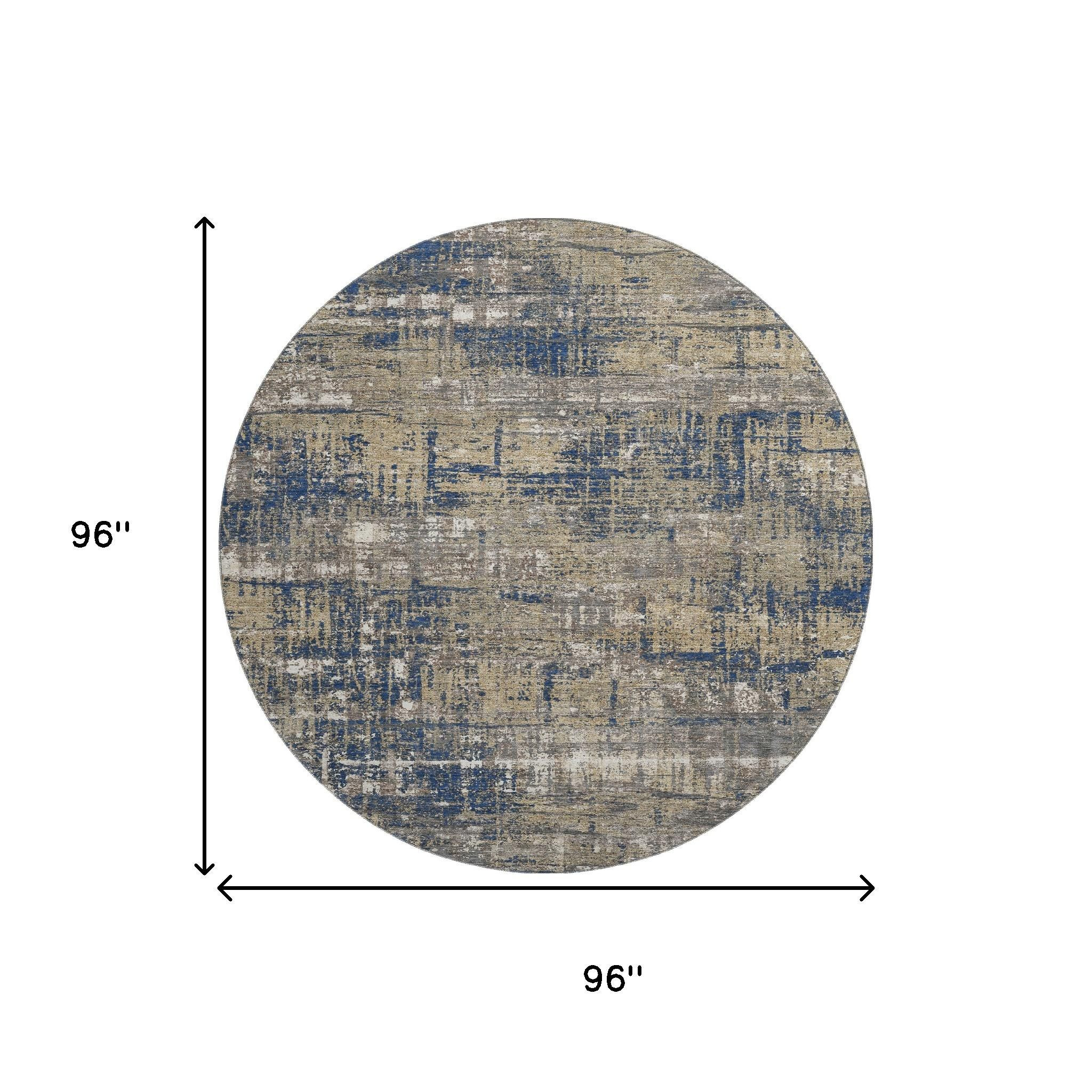 Add some artistry to your room with this 8-foot navy blue taupe and beige geometric washable round rug with uv protection. Ideal for spaces with kids and pets, this rug is stain resistant to help repel dirt and spilled liquids. Built to last, this rug crafted from polyester fibers is known for its durability and long lasting appeal. Rugs are a great way to showcase your style, hide imperfections, warm your home and reduce noise. This larger sized, transitional styled rug is ready to create a focal point or statement piece in your room. 96.00-inch h x 96.00-inch w x 0.39-inch d.