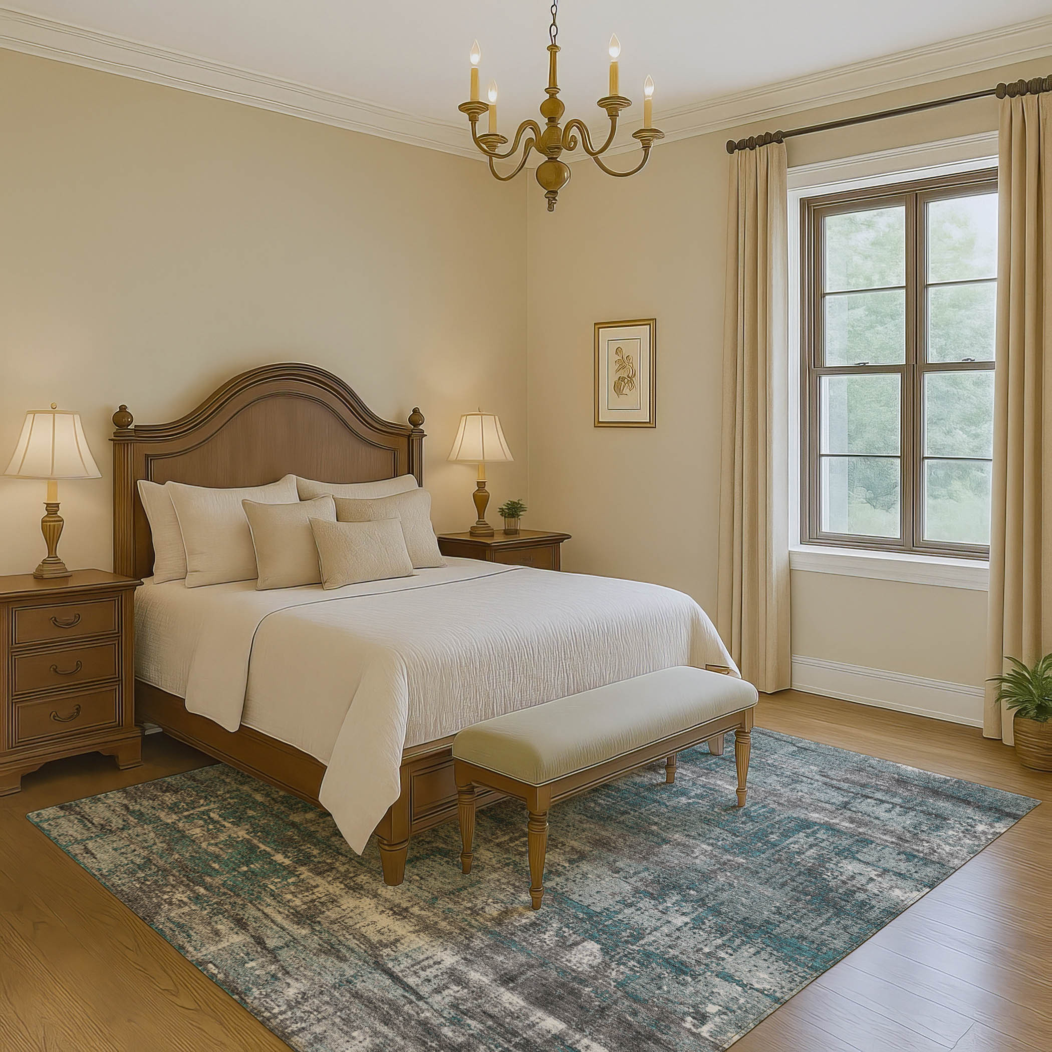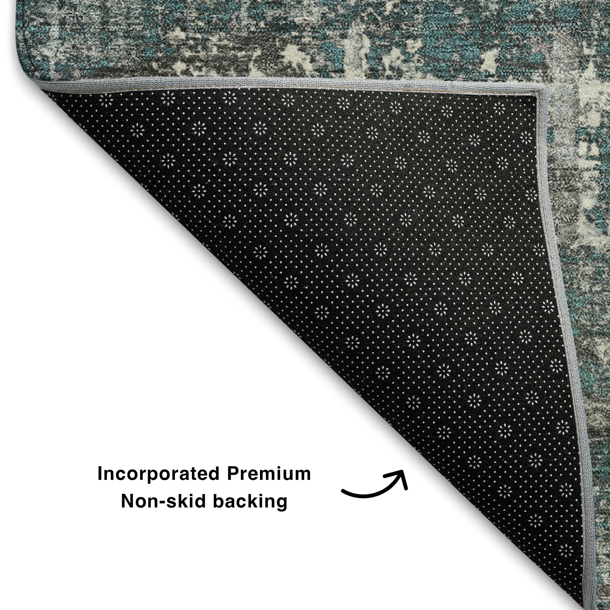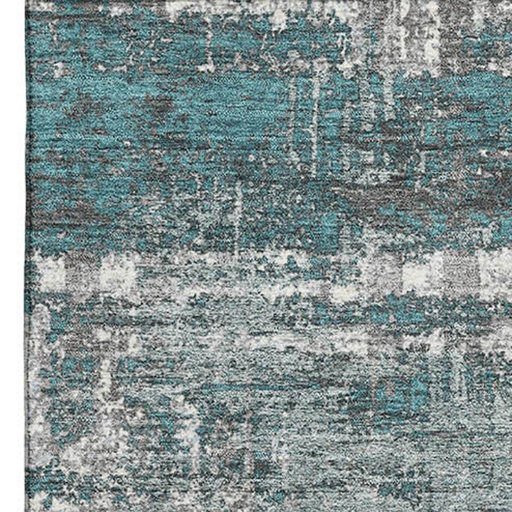 Set an inviting tone in your space with this 9-foot x 12-foot teal gray and ivory geometric washable area rug with uv protection. Ideal for spaces with kids and pets, this rug is stain resistant to help repel dirt and spilled liquids. Built to last, this rug crafted from polyester fibers is known for its durability and long lasting appeal. Rugs are a great way to showcase your style, hide imperfections, warm your home and reduce noise. This larger sized, transitional styled rug is ready to create a focal point or statement piece in your room. 108.00-inch h x 144.00-inch w x 0.39-inch d.