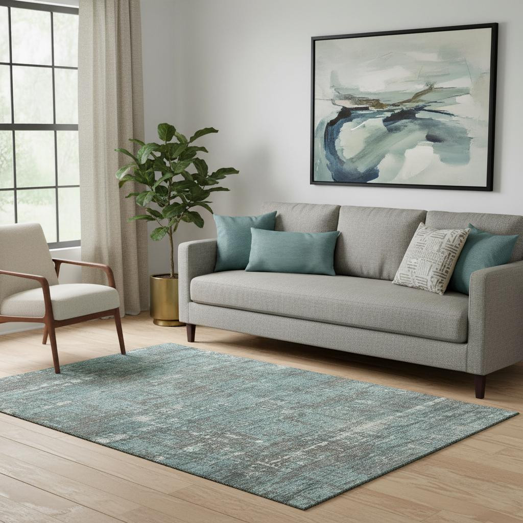 This 5-foot x 8-foot taupe teal and ivory geometric washable area rug with uv protection, is a great way to add warmth to a room. Ideal for spaces with kids and pets, this rug is stain resistant to help repel dirt and spilled liquids. Built to last, this rug crafted from polyester fibers is known for its durability and long lasting appeal. Rugs are a great way to showcase your style, hide imperfections, warm your home and reduce noise. This larger sized, transitional styled rug is ready to create a focal point or statement piece in your room. 60.00-inch h x 90.00-inch w x 0.39-inch d.