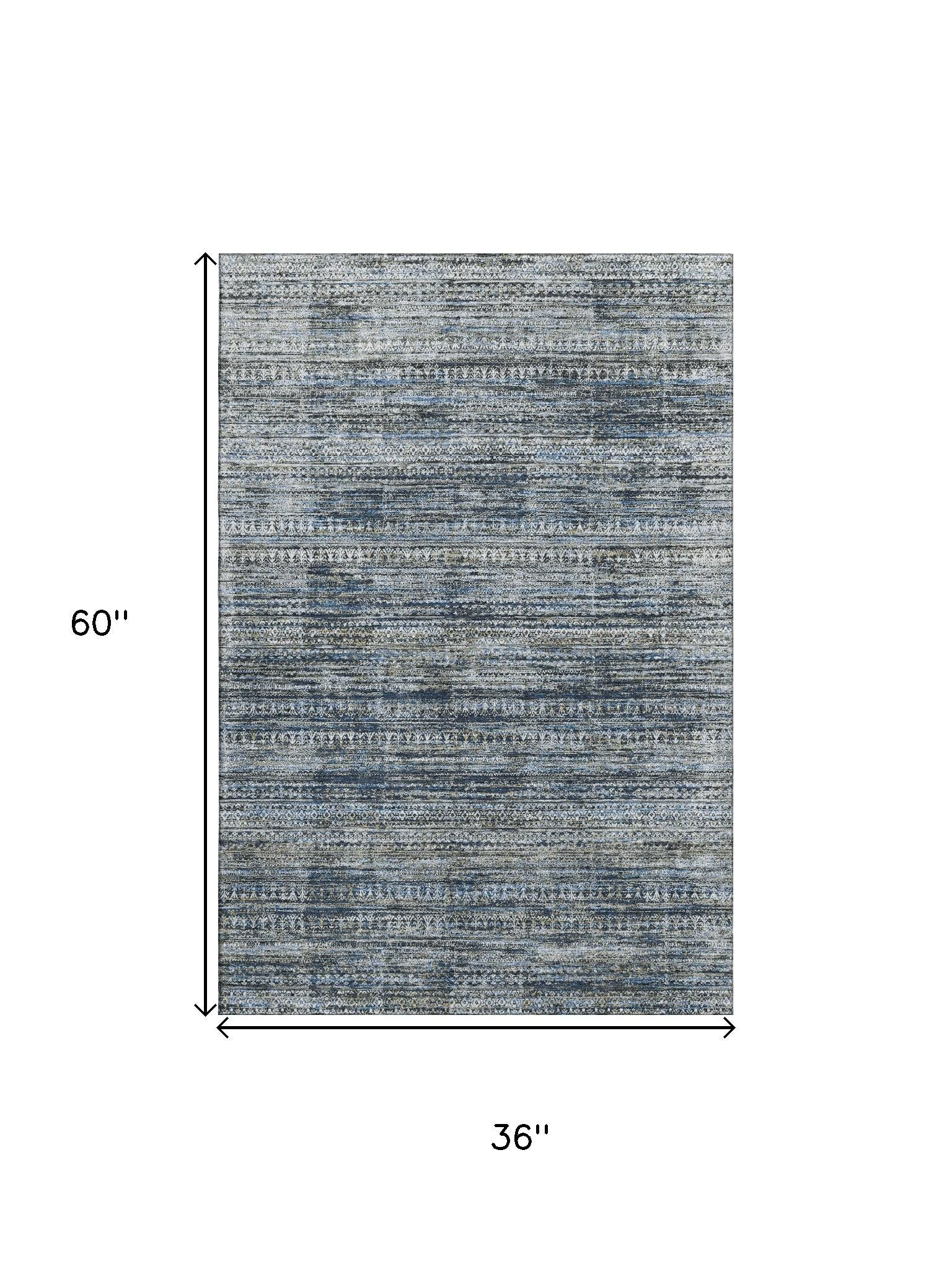 Add some artistry to your room with this 3-foot x 5-foot denim blue ivory and khaki striped washable area rug with uv protection. Ideal for spaces with kids and pets, this rug is stain resistant to help repel dirt and spilled liquids. Built to last, this rug crafted from polyester fibers is known for its durability and long lasting appeal. Rugs are a great way to showcase your style, hide imperfections, warm your home and reduce noise. This smaller sized, transitional styled rug is just what you need for your walkway, bedside, in front of door, cabinet, refrigerator, or chair. 36.00-inch h x 60.00-inch w x 0.39-inch d.