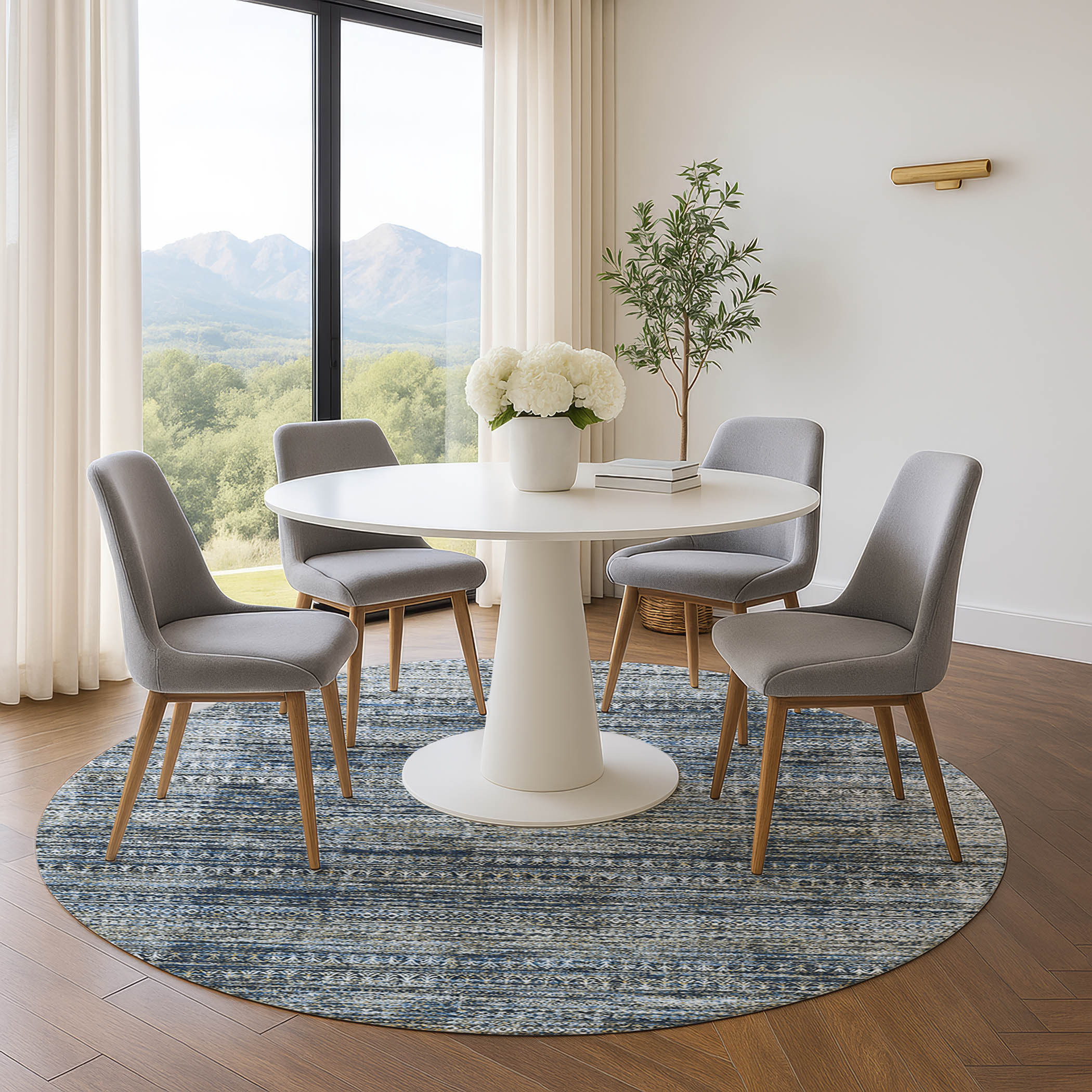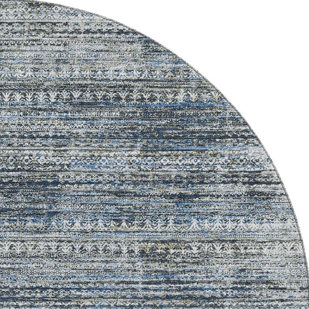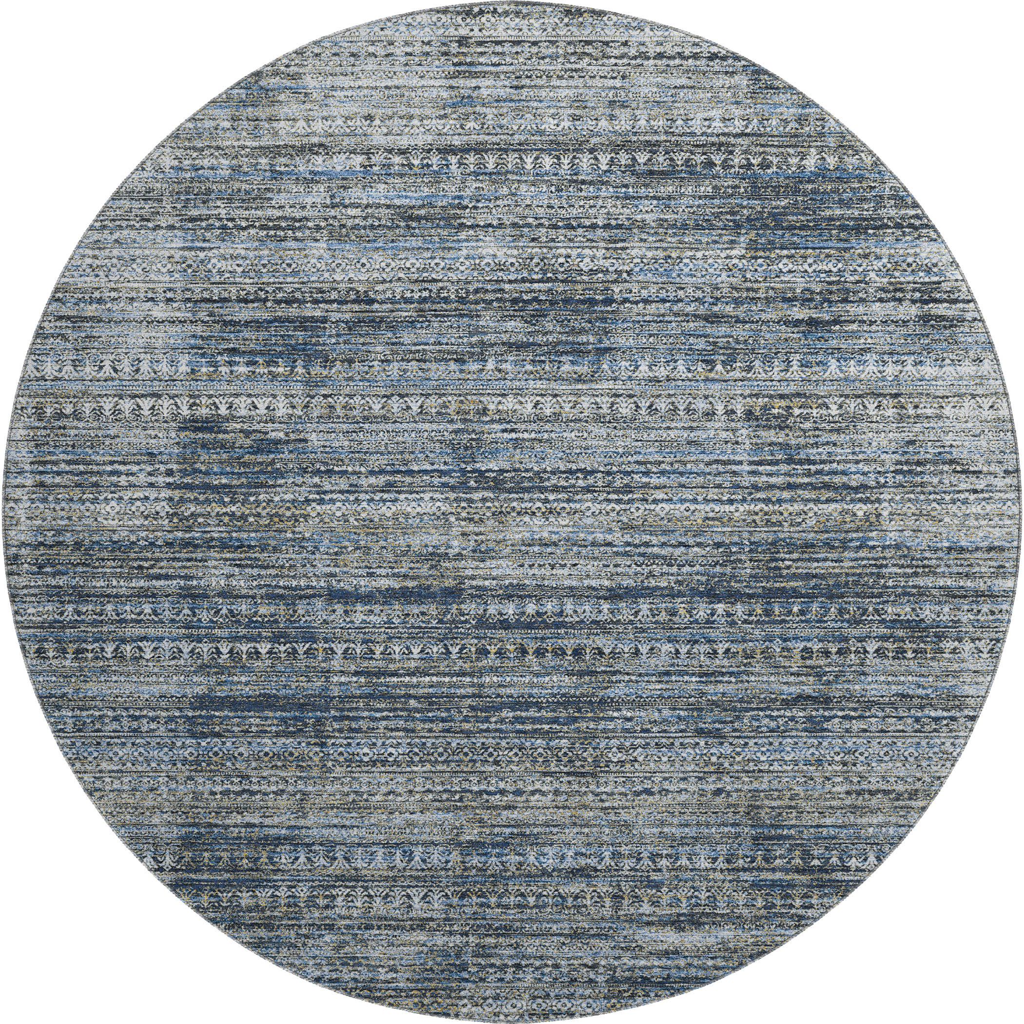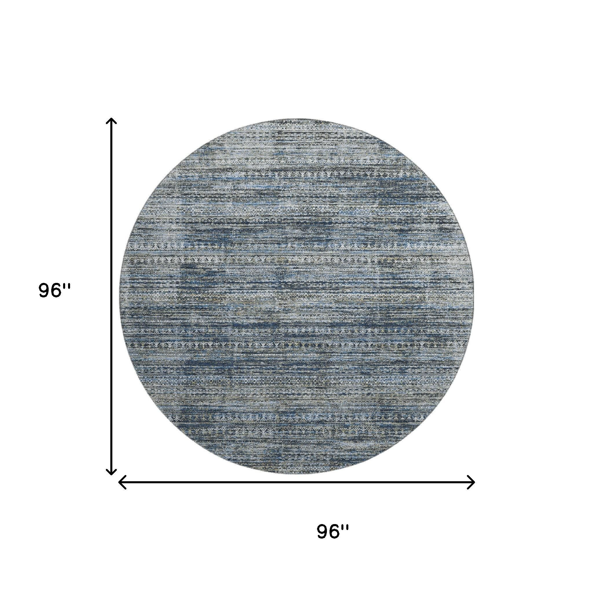 This 8-foot denim blue ivory and khaki striped washable round rug with uv protection, is a great way to add warmth to a room. Ideal for spaces with kids and pets, this rug is stain resistant to help repel dirt and spilled liquids. Built to last, this rug crafted from polyester fibers is known for its durability and long lasting appeal. Rugs are a great way to showcase your style, hide imperfections, warm your home and reduce noise. This larger sized, transitional styled rug is ready to create a focal point or statement piece in your room. 96.00-inch h x 96.00-inch w x 0.39-inch d.