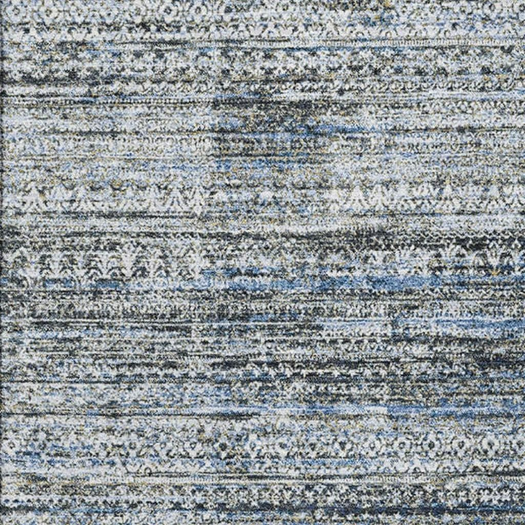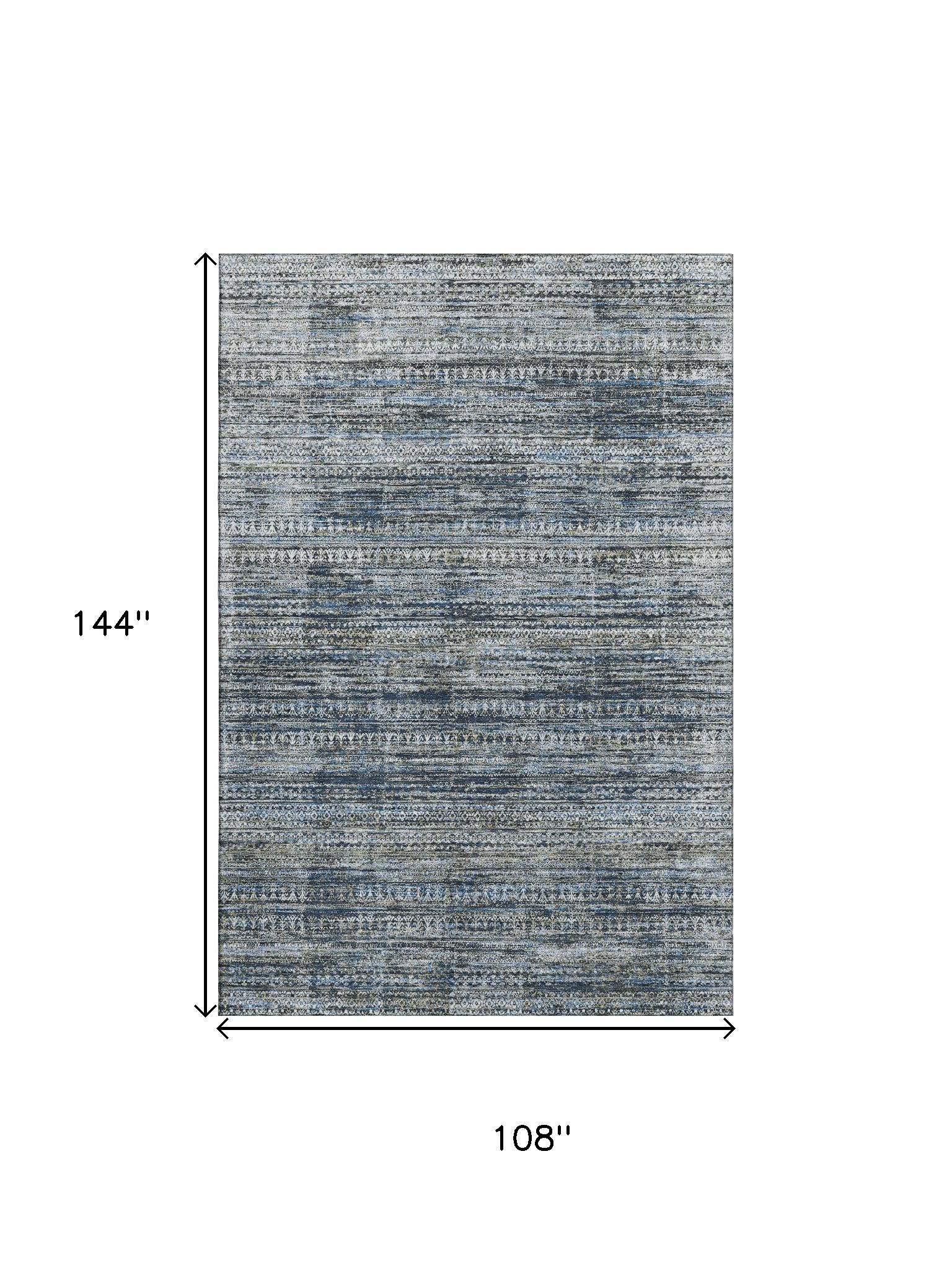 Add some artistry to your room with this 9-foot x 12-foot denim blue ivory and khaki striped washable area rug with uv protection. Ideal for spaces with kids and pets, this rug is stain resistant to help repel dirt and spilled liquids. Built to last, this rug crafted from polyester fibers is known for its durability and long lasting appeal. Rugs are a great way to showcase your style, hide imperfections, warm your home and reduce noise. This larger sized, transitional styled rug is ready to create a focal point or statement piece in your room. 108.00-inch h x 144.00-inch w x 0.39-inch d.
