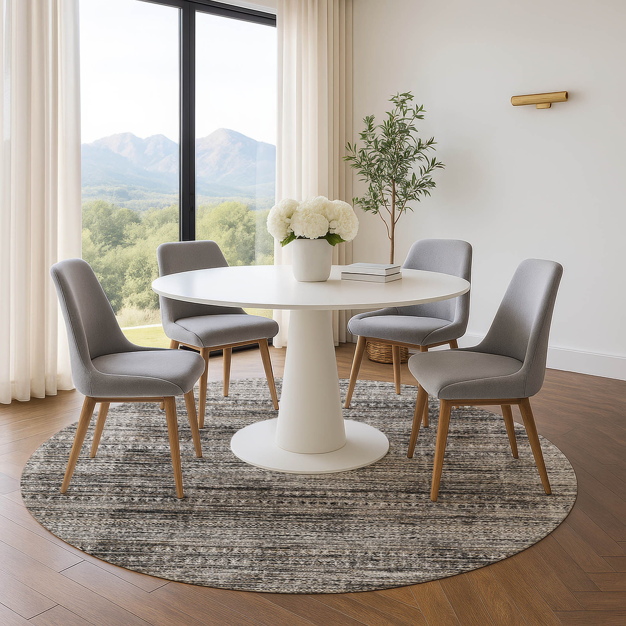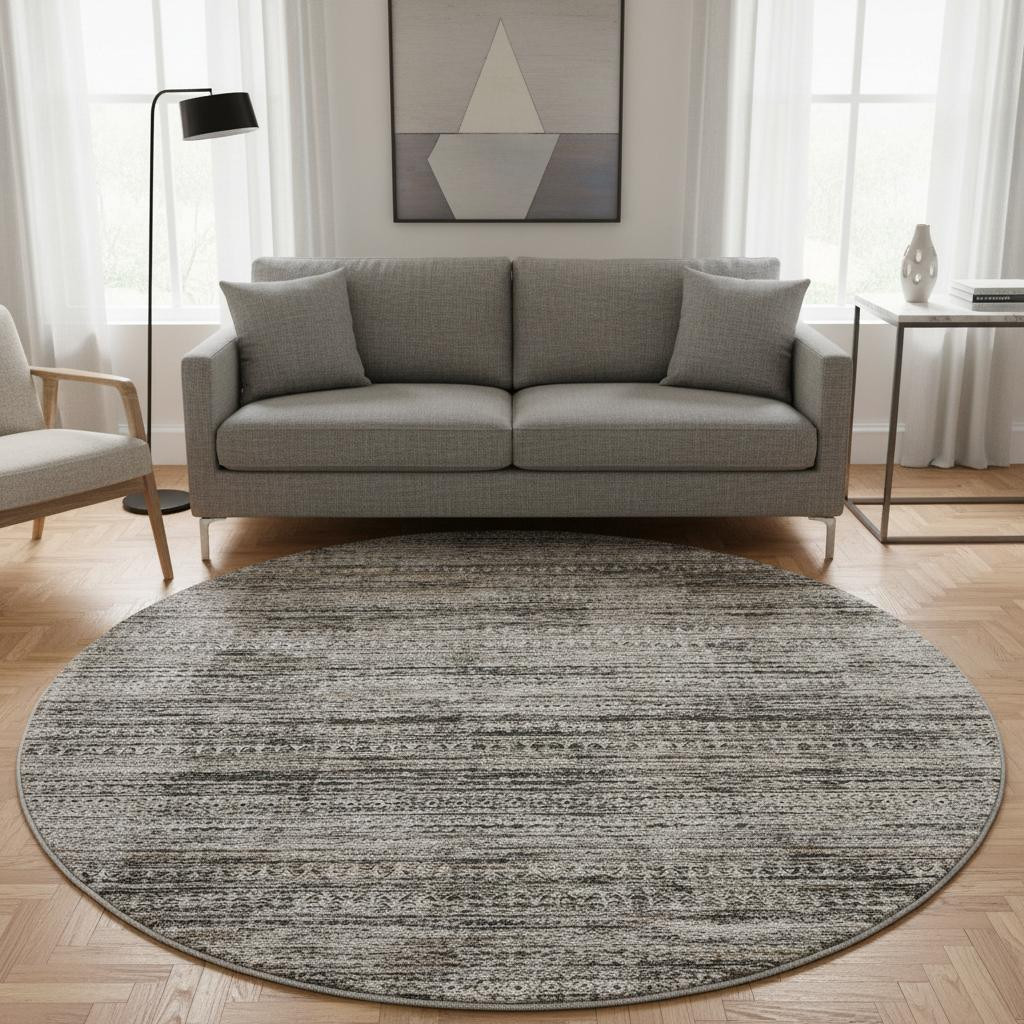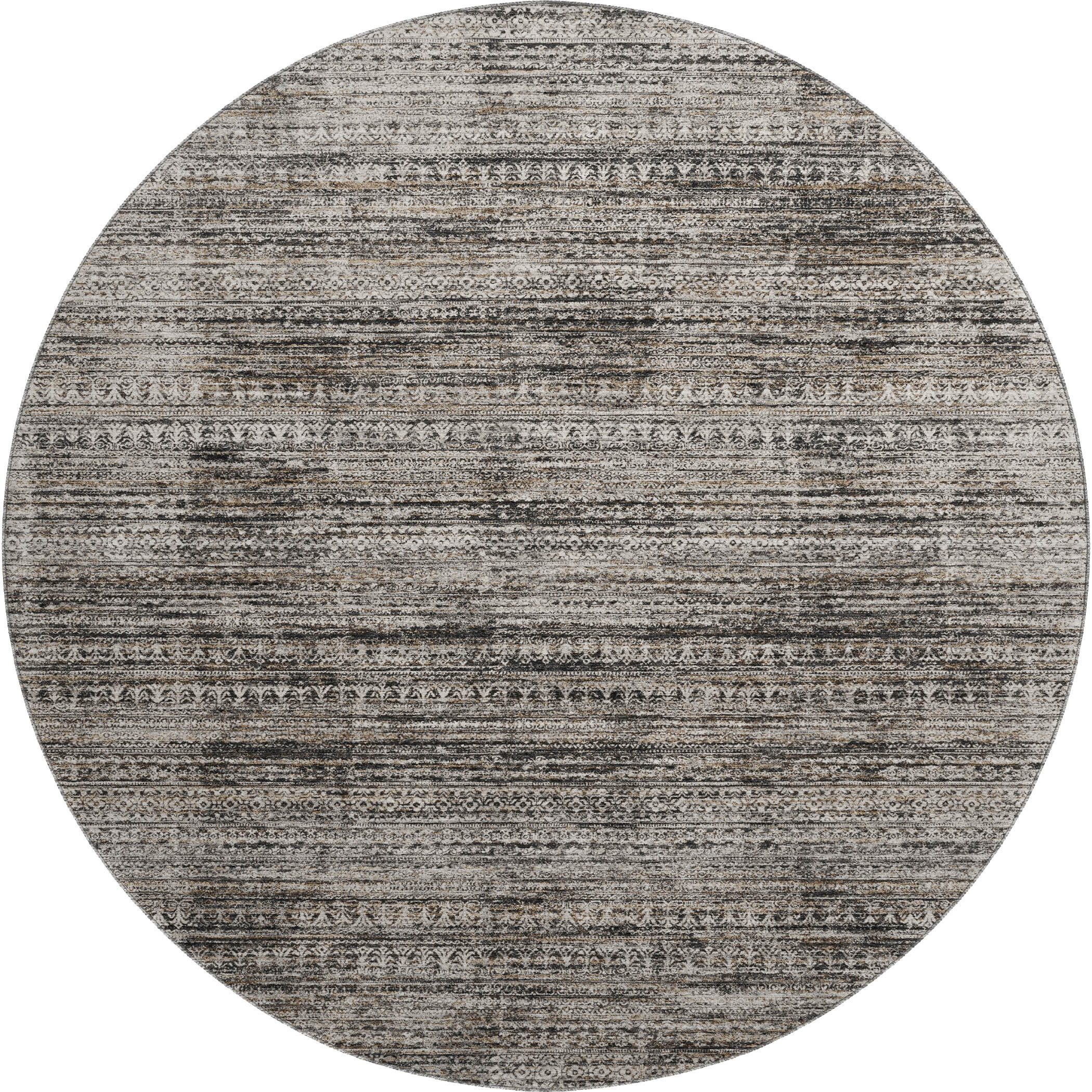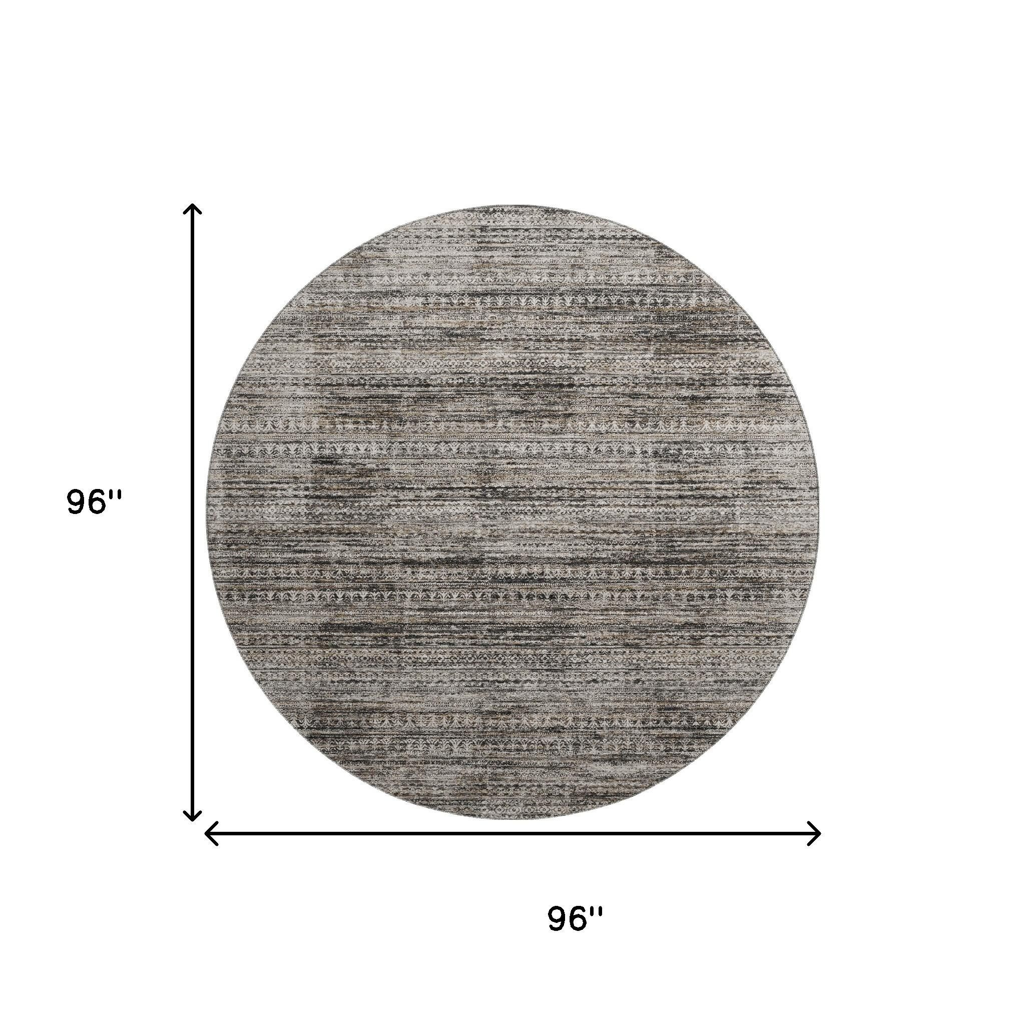 This 8-foot taupe brown and ivory striped washable round rug with uv protection, is a great way to add warmth to a room. Ideal for spaces with kids and pets, this rug is stain resistant to help repel dirt and spilled liquids. Built to last, this rug crafted from polyester fibers is known for its durability and long lasting appeal. Rugs are a great way to showcase your style, hide imperfections, warm your home and reduce noise. This larger sized, transitional styled rug is ready to create a focal point or statement piece in your room. 96.00-inch h x 96.00-inch w x 0.39-inch d.