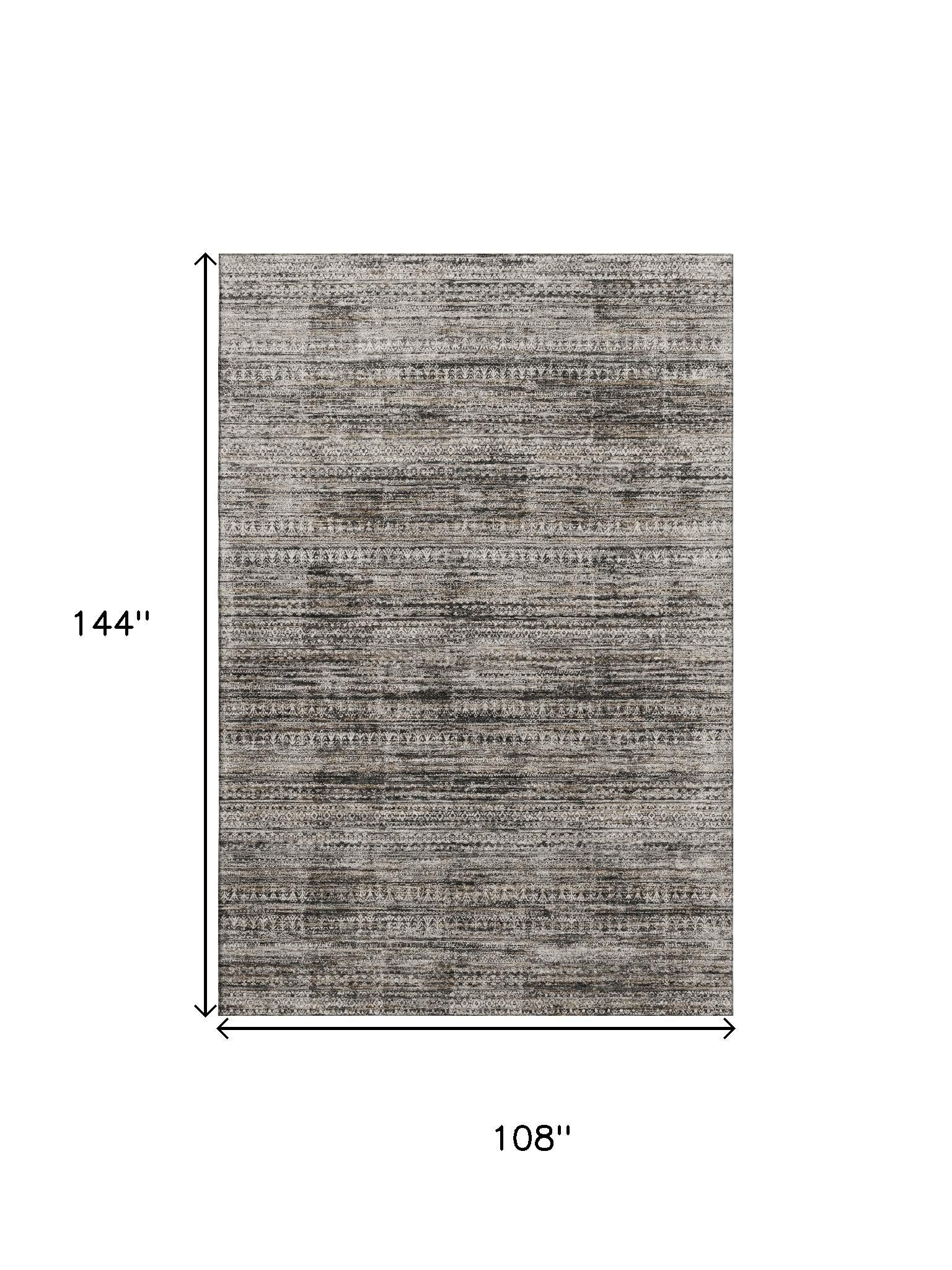 This 9-foot x 12-foot taupe brown and ivory striped washable area rug with uv protection, is a great way to add warmth to a room. Ideal for spaces with kids and pets, this rug is stain resistant to help repel dirt and spilled liquids. Built to last, this rug crafted from polyester fibers is known for its durability and long lasting appeal. Rugs are a great way to showcase your style, hide imperfections, warm your home and reduce noise. This larger sized, transitional styled rug is ready to create a focal point or statement piece in your room. 108.00-inch h x 144.00-inch w x 0.39-inch d.