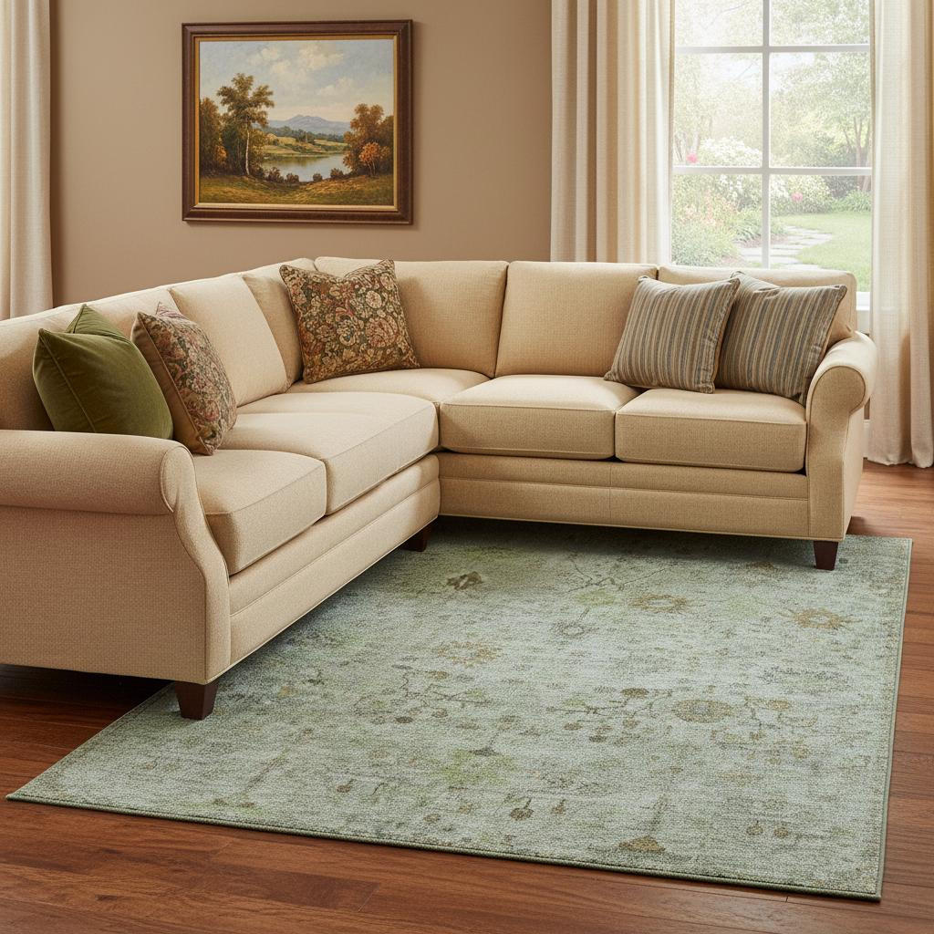 This 8-foot x 10-foot artichoke green copper and gray oriental washable area rug with uv protection, is a great way to add warmth to a room. Ideal for spaces with kids and pets, this rug is stain resistant to help repel dirt and spilled liquids. Built to last, this rug crafted from polyester fibers is known for its durability and long lasting appeal. Rugs are a great way to showcase your style, hide imperfections, warm your home and reduce noise. This larger sized, traditional styled rug is ready to create a focal point or statement piece in your room. 96.00-inch h x 120.00-inch w x 0.39-inch d.