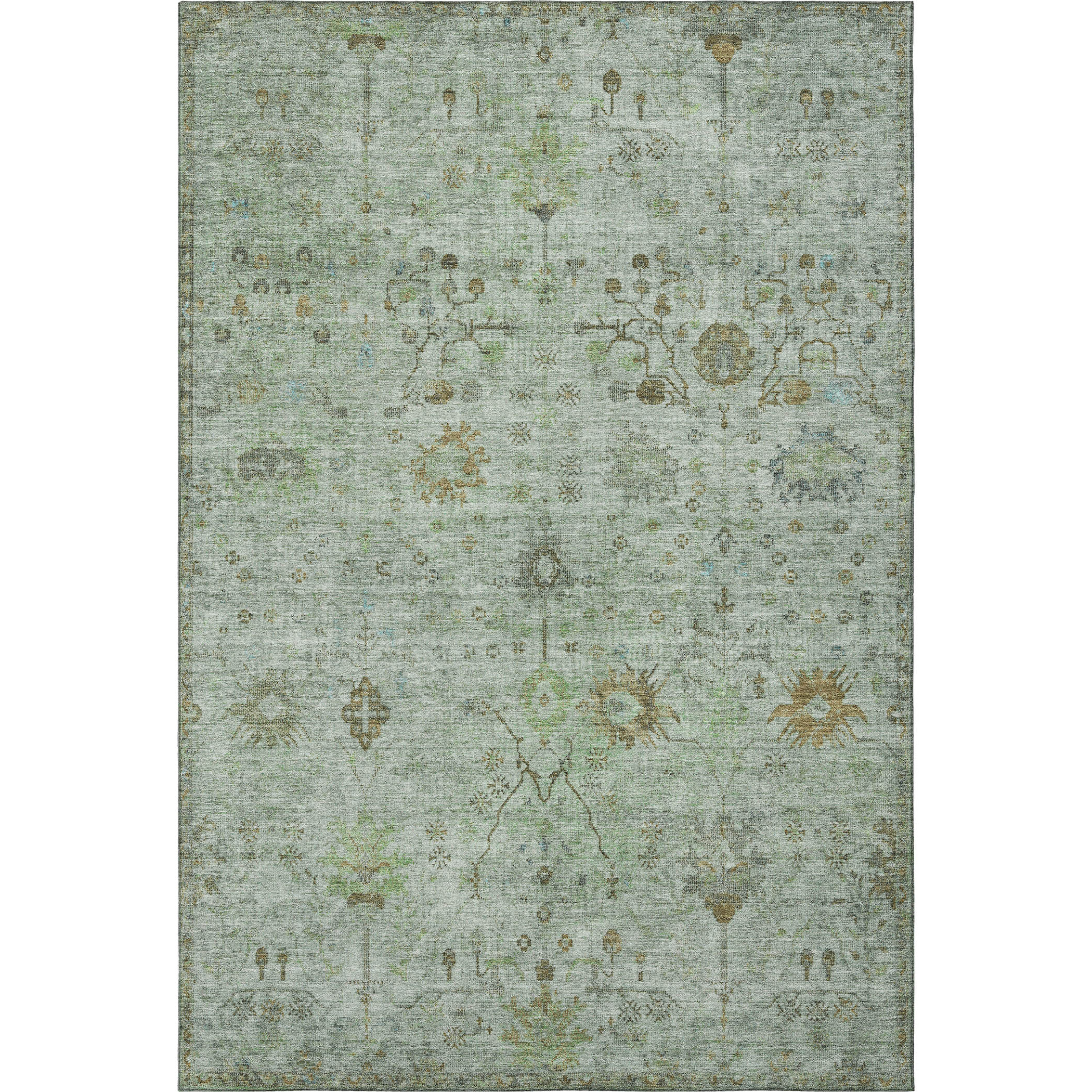 Add great coloration and comfortable texture to your space with this 10-foot x 14-foot artichoke green copper and gray oriental washable area rug with uv protection. Ideal for spaces with kids and pets, this rug is stain resistant to help repel dirt and spilled liquids. Built to last, this rug crafted from polyester fibers is known for its durability and long lasting appeal. Rugs are a great way to showcase your style, hide imperfections, warm your home and reduce noise. This larger sized, traditional styled rug is ready to create a focal point or statement piece in your room. 120.00-inch h x 168.00-inch w x 0.39-inch d.