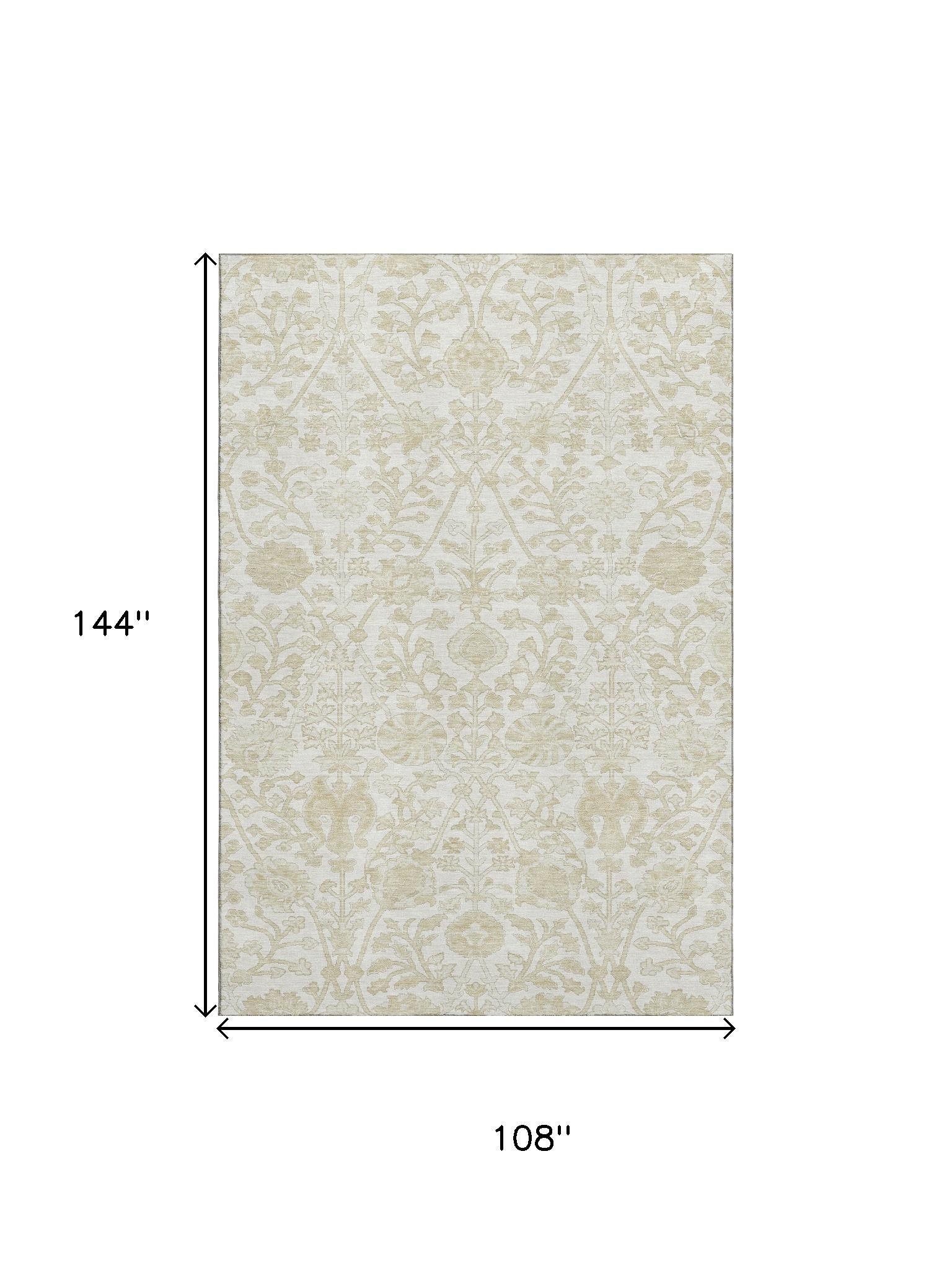 Add some artistry to your room with this 9-foot x 12-foot ivory and beige floral washable area rug with uv protection. Ideal for spaces with kids and pets, this rug is stain resistant to help repel dirt and spilled liquids. Built to last, this rug crafted from polyester fibers is known for its durability and long lasting appeal. Rugs are a great way to showcase your style, hide imperfections, warm your home and reduce noise. This larger sized, traditional styled rug is ready to create a focal point or statement piece in your room. 108.00-inch h x 144.00-inch w x 0.39-inch d.