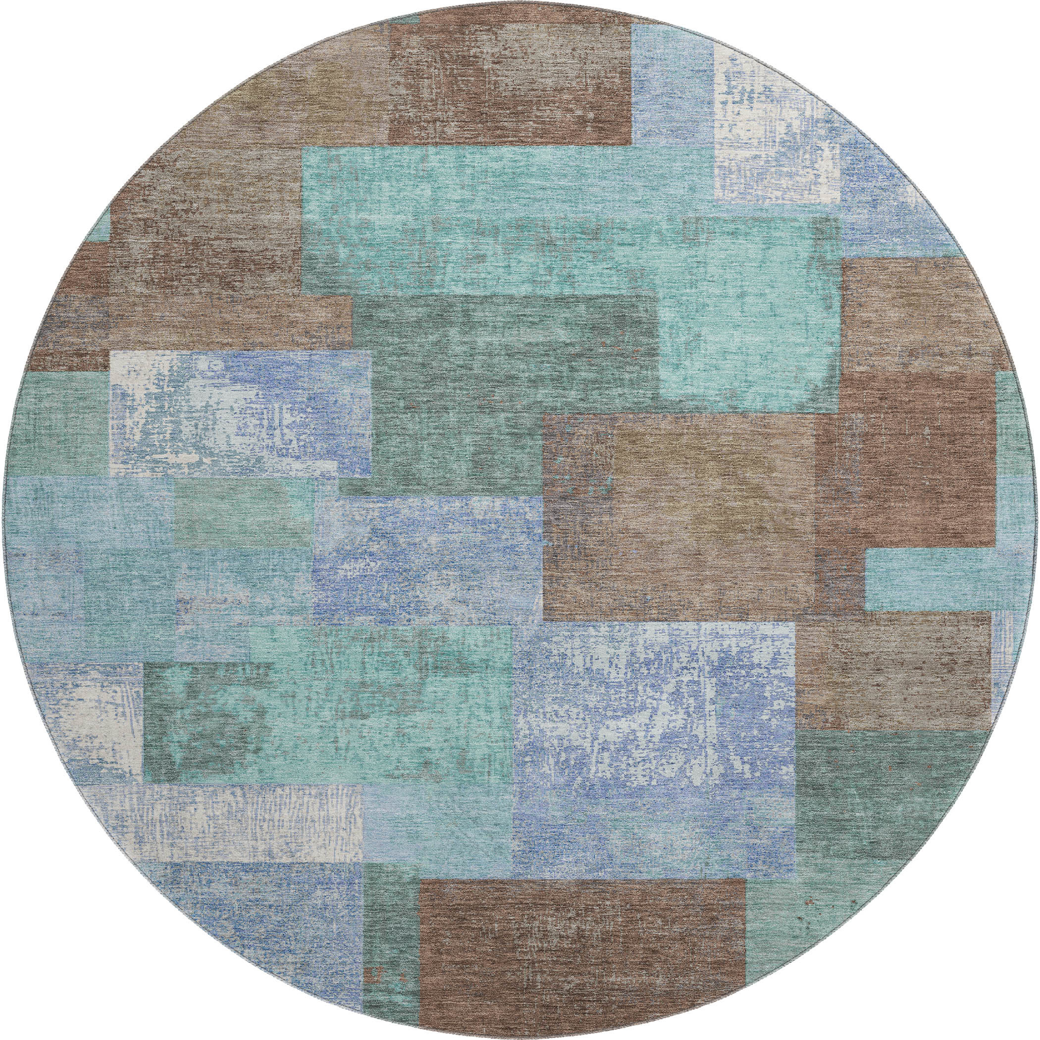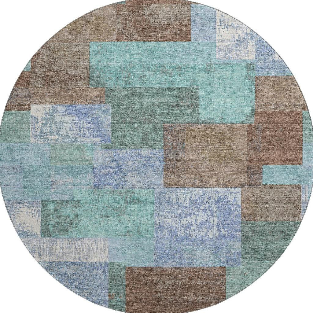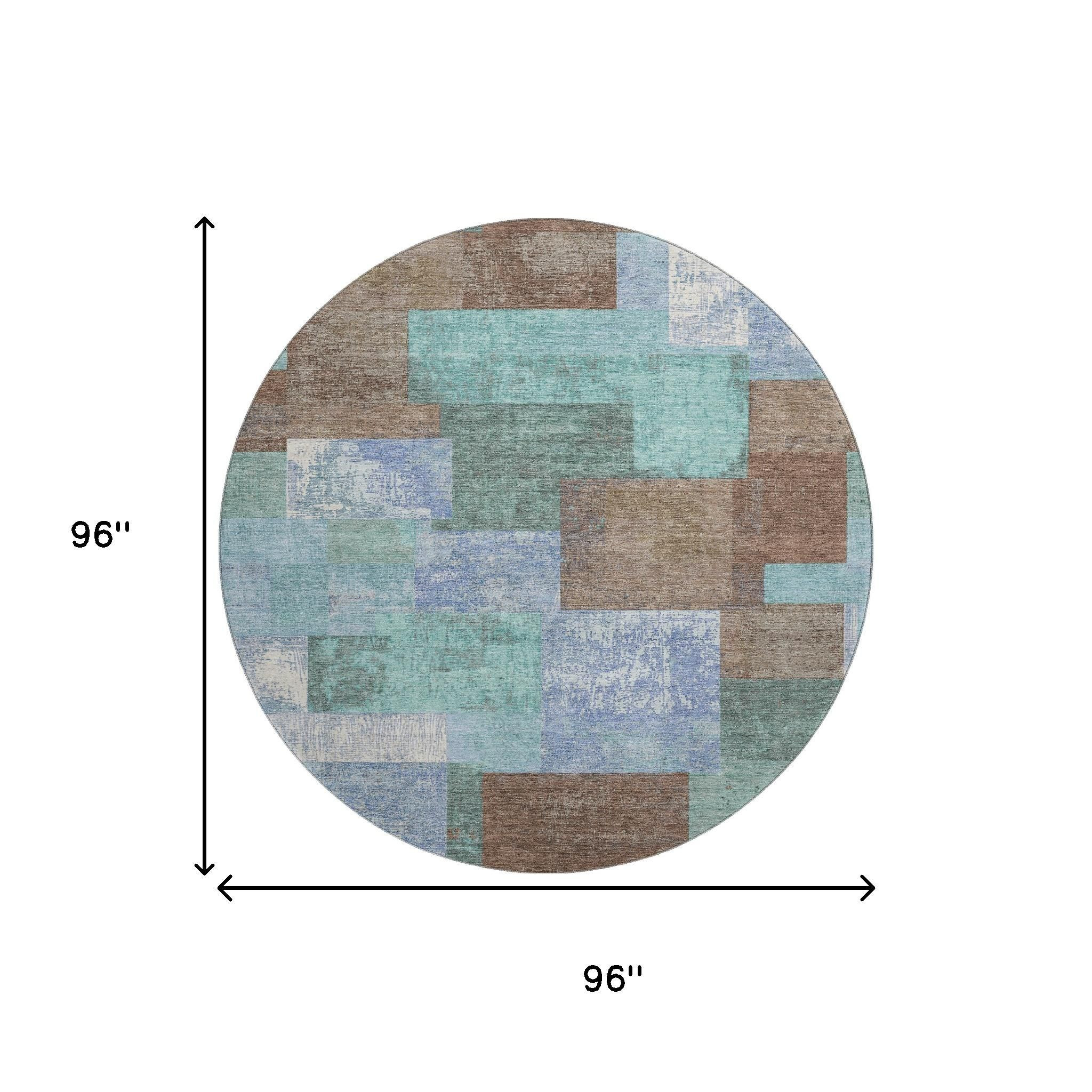 This 8-foot brown teal and ivory geometric washable round rug with uv protection, is a great way to add warmth to a room. Ideal for spaces with kids and pets, this rug is stain resistant to help repel dirt and spilled liquids. Built to last, this rug crafted from polyester fibers is known for its durability and long lasting appeal. Rugs are a great way to showcase your style, hide imperfections, warm your home and reduce noise. This larger sized, traditional styled rug is ready to create a focal point or statement piece in your room. 96.00-inch h x 96.00-inch w x 0.39-inch d.