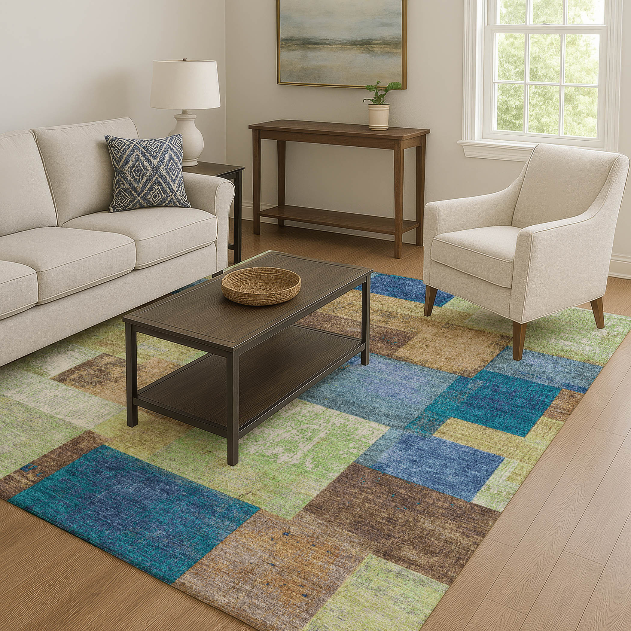 Add great coloration and comfortable texture to your space with this 3-foot x 5-foot blue green and beige geometric washable area rug with uv protection. Ideal for spaces with kids and pets, this rug is stain resistant to help repel dirt and spilled liquids. Built to last, this rug crafted from polyester fibers is known for its durability and long lasting appeal. Rugs are a great way to showcase your style, hide imperfections, warm your home and reduce noise. This smaller sized, traditional styled rug is just what you need for your walkway, bedside, in front of door, cabinet, refrigerator, or chair. 36.00-inch h x 60.00-inch w x 0.39-inch d.