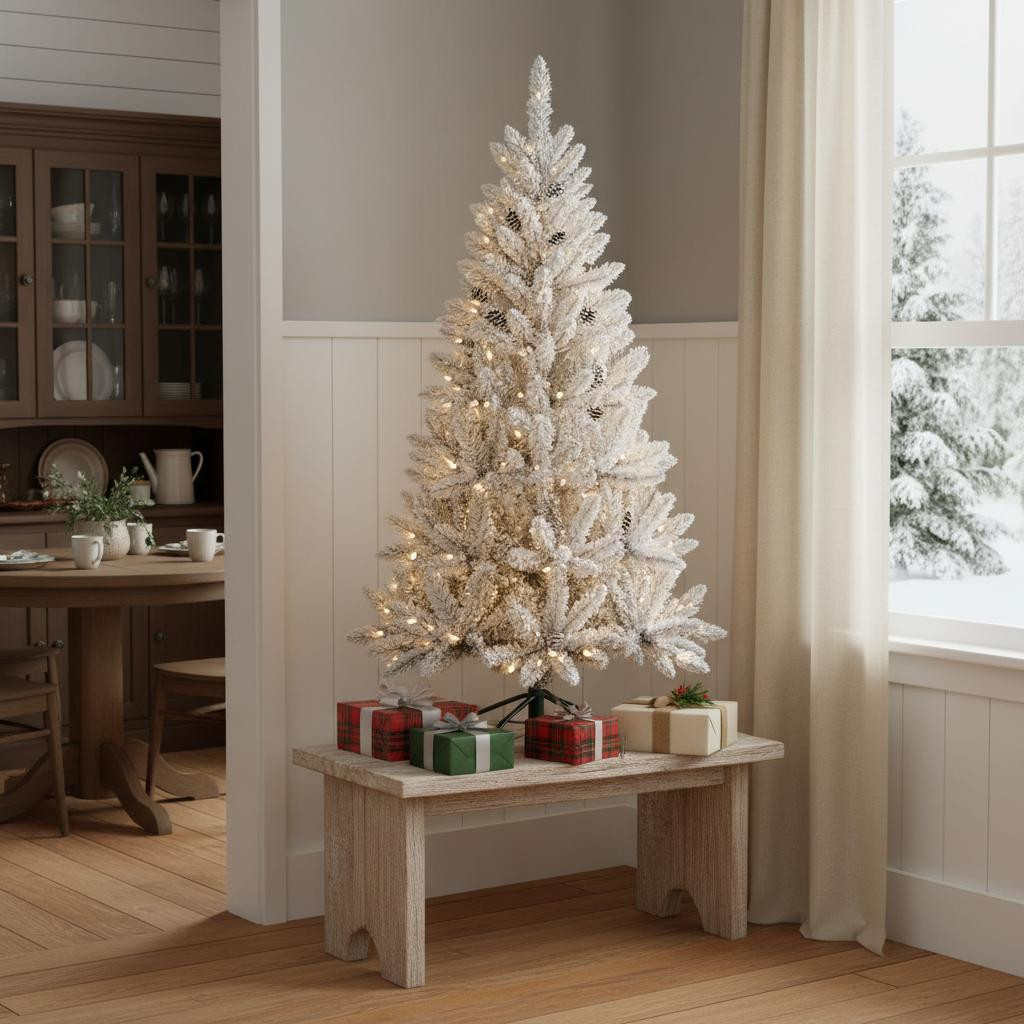 Decorate and celebrate in style with this festive 4.5-foot pre lit full flocked spruce christmas tree. This artificial tree features a beautiful green needle color that captures the essence of a natural evergreen. With its regular fullness and flocked branches, it offers a stunning visual appeal that enhances any holiday setting. The included led lights emit a warm and inviting clear white glow, creating a cozy atmosphere. Designed for easy setup, the tree comes with a sturdy stand, ensuring stability during the festive season. With 250 lights and 498 tips, this tree is perfect for showcasing your favorite ornaments and holiday memories. 54.00-inch h x 35.00-inch w x 35.00-inch d.