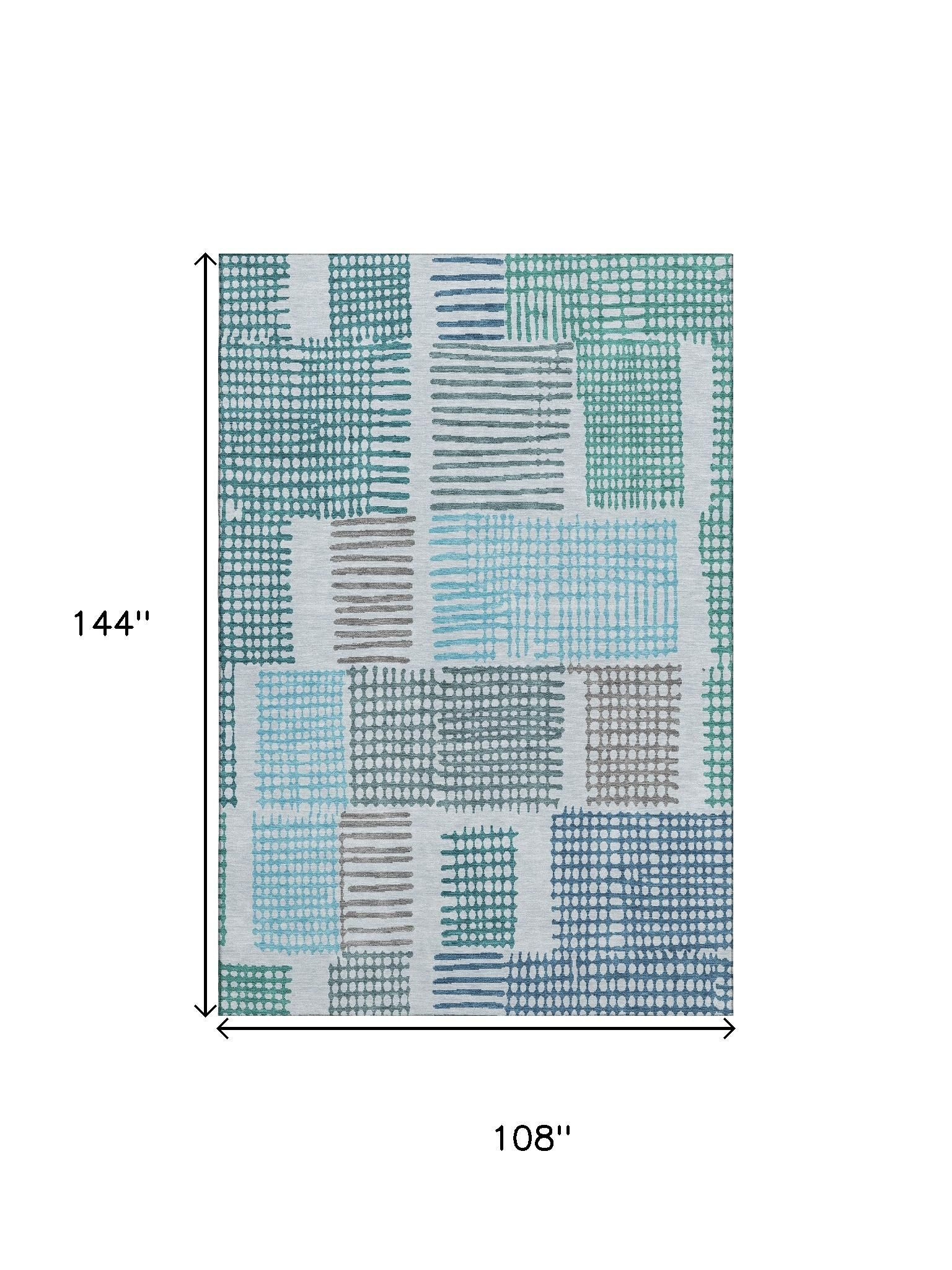 Add great coloration and comfortable texture to your space with this 9-foot x 12-foot aqua teal and ivory geometric washable area rug with uv protection. Ideal for spaces with kids and pets, this rug is stain resistant to help repel dirt and spilled liquids. Built to last, this rug crafted from polyester fibers is known for its durability and long lasting appeal. Rugs are a great way to showcase your style, hide imperfections, warm your home and reduce noise. This larger sized, transitional styled rug is ready to create a focal point or statement piece in your room. 108.00-inch h x 144.00-inch w x 0.39-inch d.