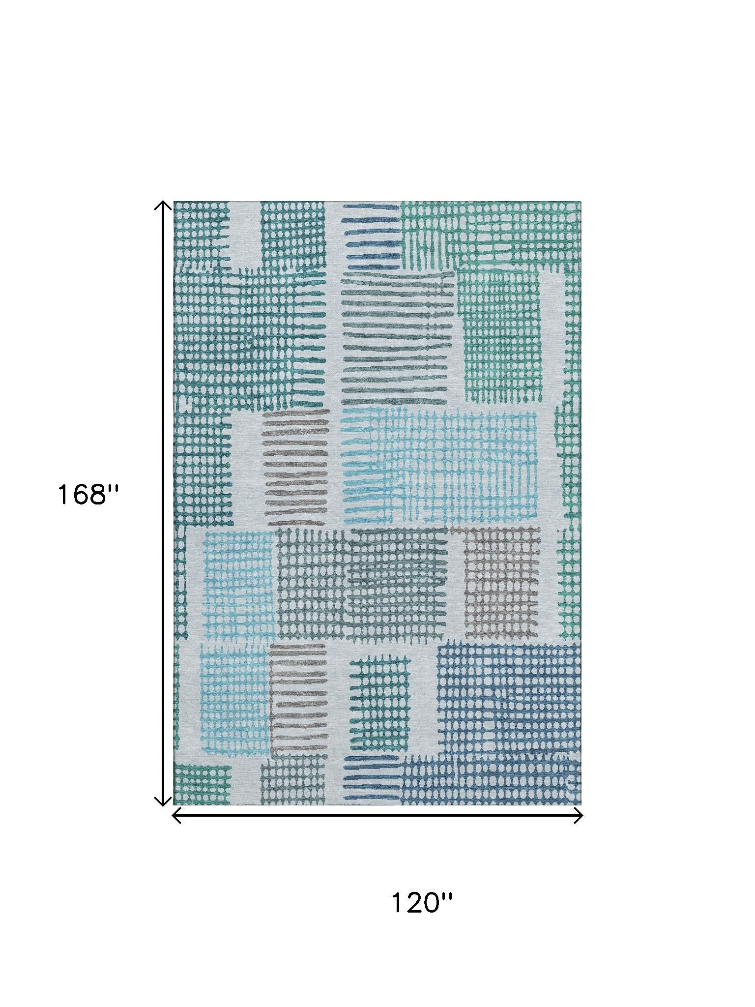 This 10-foot x 14-foot aqua teal and ivory geometric washable area rug with uv protection, is a great way to add warmth to a room. Ideal for spaces with kids and pets, this rug is stain resistant to help repel dirt and spilled liquids. Built to last, this rug crafted from polyester fibers is known for its durability and long lasting appeal. Rugs are a great way to showcase your style, hide imperfections, warm your home and reduce noise. This larger sized, transitional styled rug is ready to create a focal point or statement piece in your room. 120.00-inch h x 168.00-inch w x 0.39-inch d.