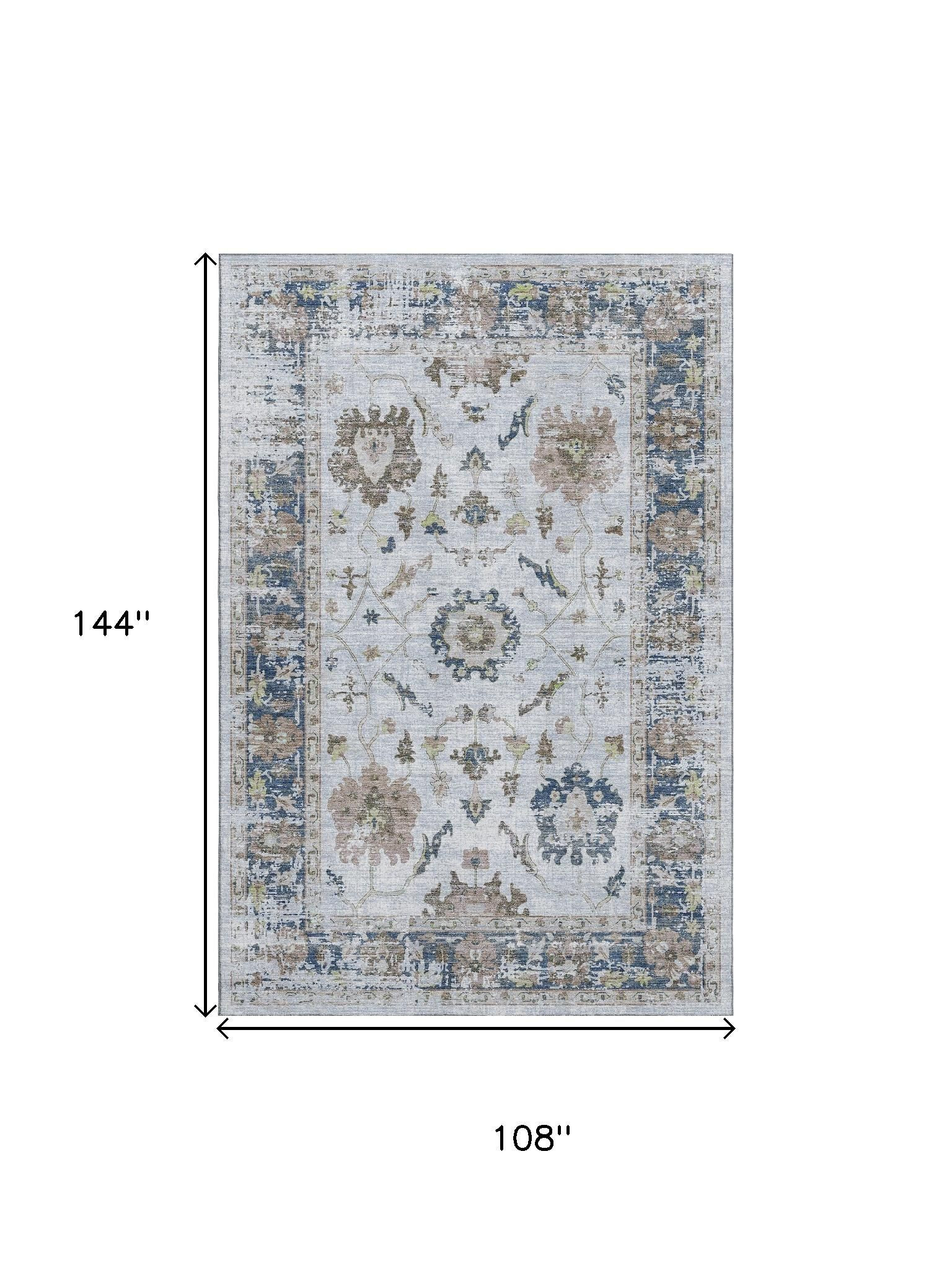 Add great coloration and comfortable texture to your space with this 9-foot x 12-foot blue gray and taupe oriental washable area rug with uv protection. Ideal for spaces with kids and pets, this rug is stain resistant to help repel dirt and spilled liquids. Built to last, this rug crafted from polyester fibers is known for its durability and long lasting appeal. Rugs are a great way to showcase your style, hide imperfections, warm your home and reduce noise. This larger sized, traditional styled rug is ready to create a focal point or statement piece in your room. 108.00-inch h x 144.00-inch w x 0.39-inch d.