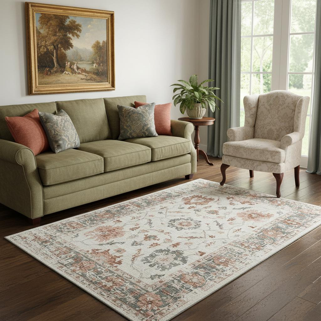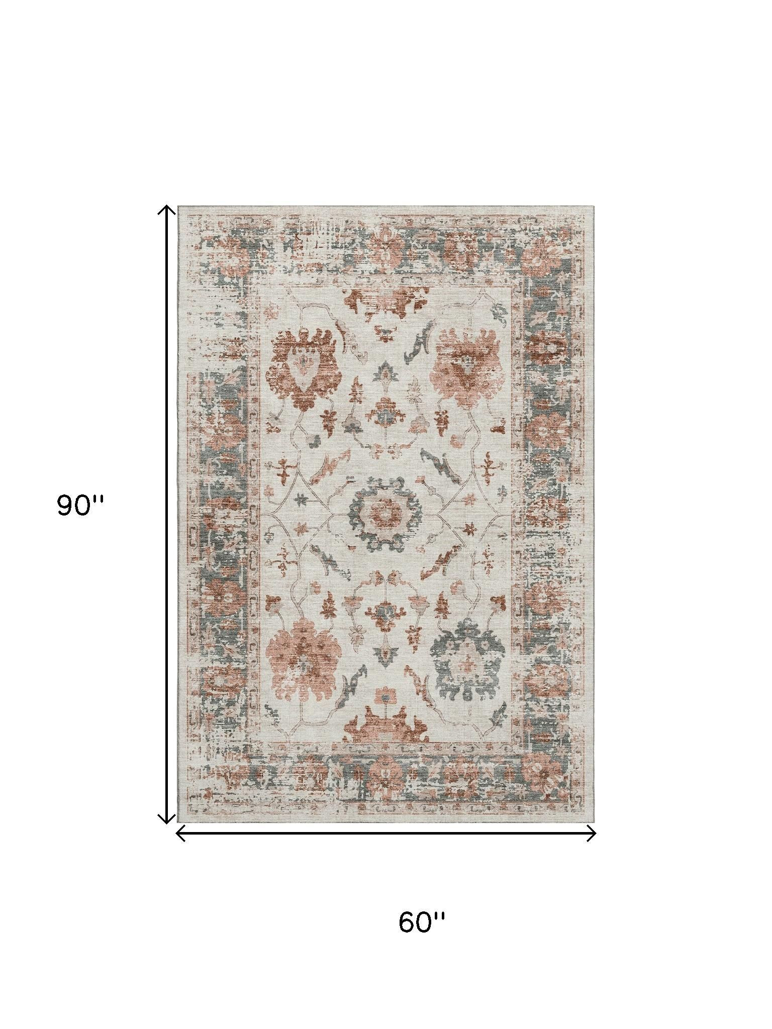Set an inviting tone in your space with this 5-foot x 8-foot linen ivory and salmon oriental washable area rug with uv protection. Ideal for spaces with kids and pets, this rug is stain resistant to help repel dirt and spilled liquids. Built to last, this rug crafted from polyester fibers is known for its durability and long lasting appeal. Rugs are a great way to showcase your style, hide imperfections, warm your home and reduce noise. This larger sized, traditional styled rug is ready to create a focal point or statement piece in your room. 60.00-inch h x 90.00-inch w x 0.39-inch d.