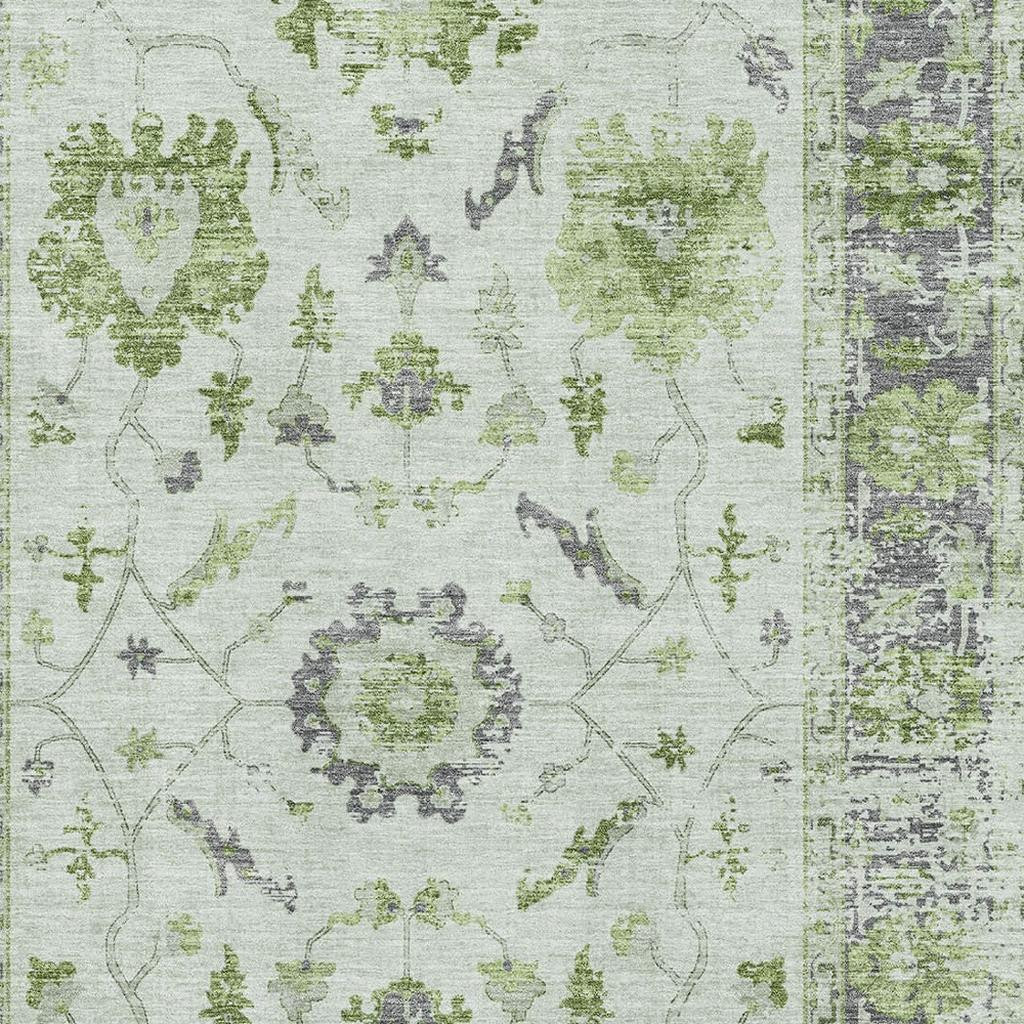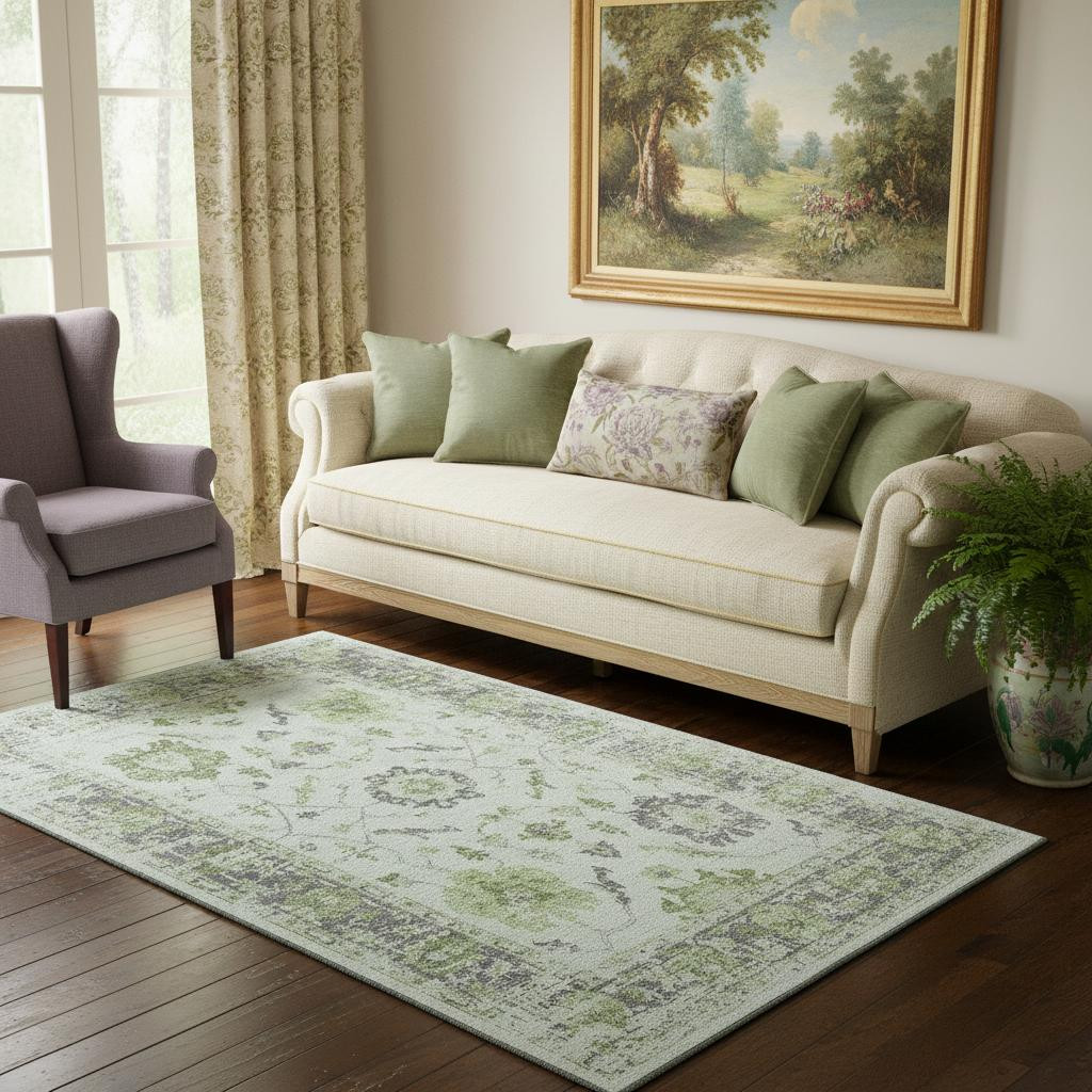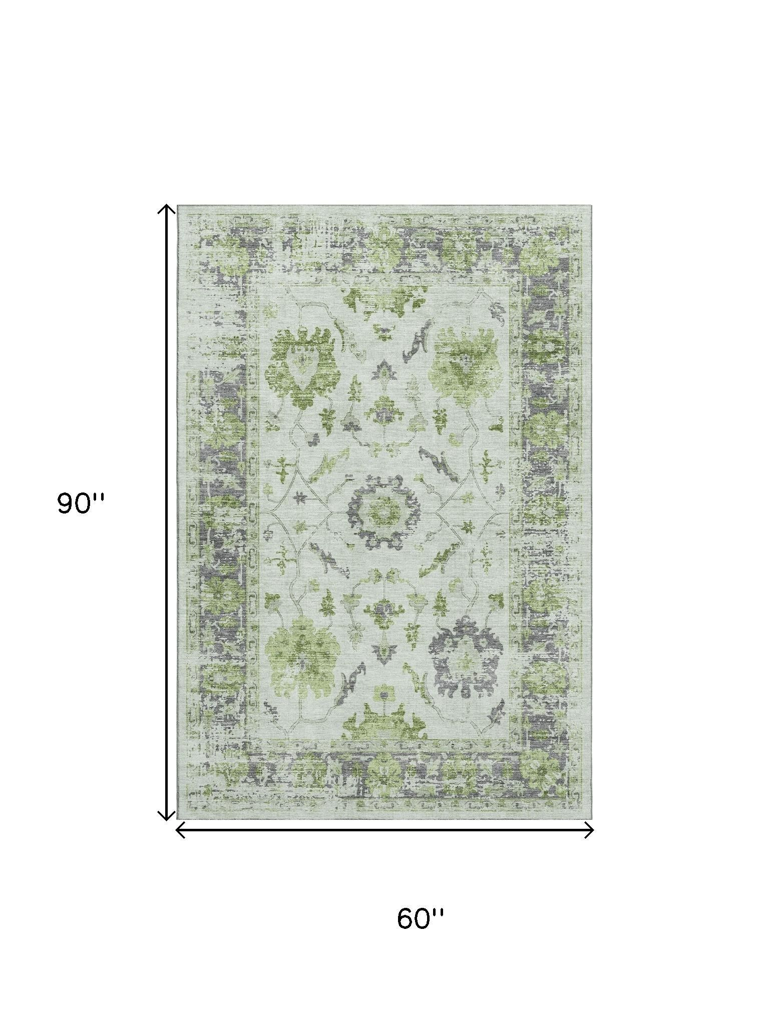 This 5-foot x 8-foot mint green and gray oriental washable area rug with uv protection, is a great way to add warmth to a room. Ideal for spaces with kids and pets, this rug is stain resistant to help repel dirt and spilled liquids. Built to last, this rug crafted from polyester fibers is known for its durability and long lasting appeal. Rugs are a great way to showcase your style, hide imperfections, warm your home and reduce noise. This larger sized, traditional styled rug is ready to create a focal point or statement piece in your room. 60.00-inch h x 90.00-inch w x 0.39-inch d.