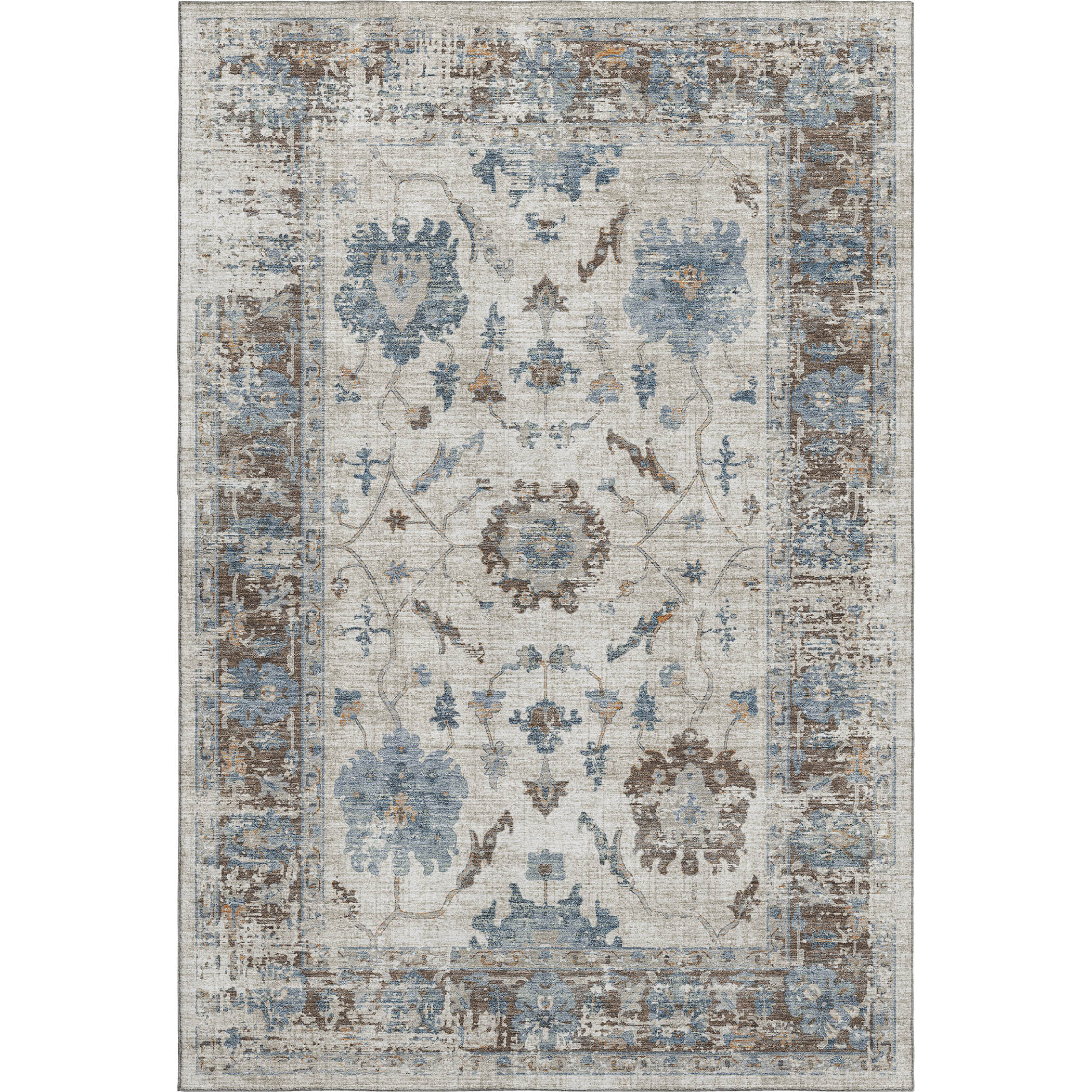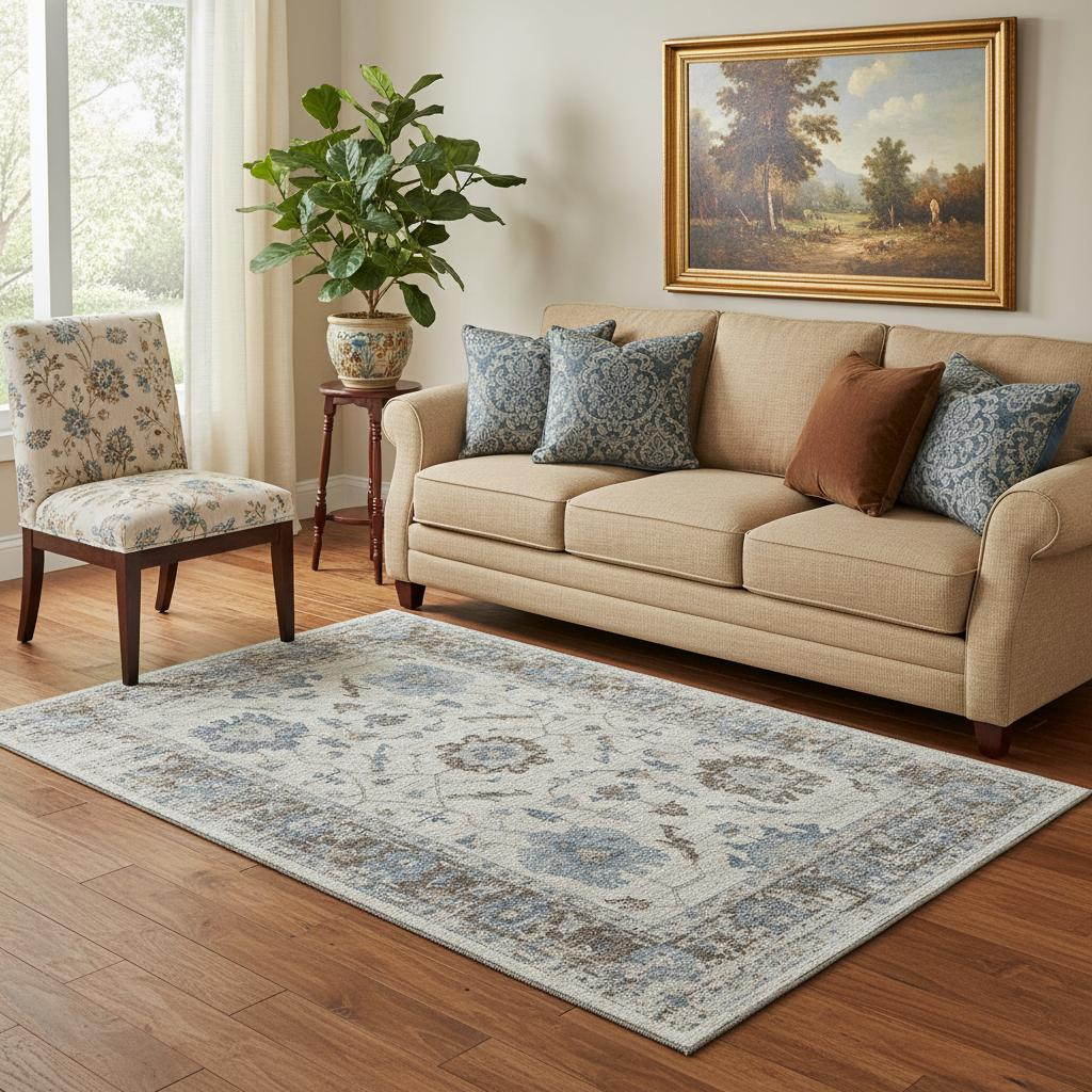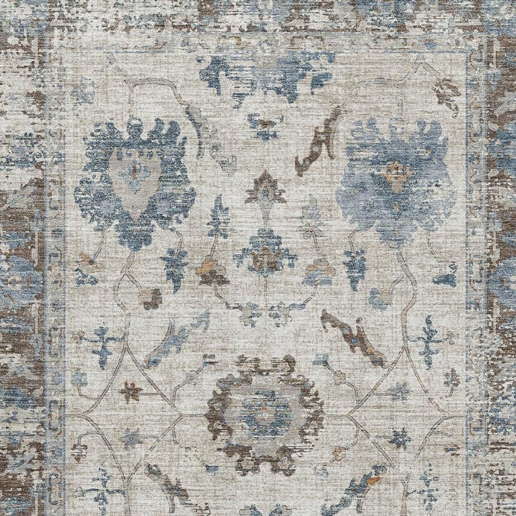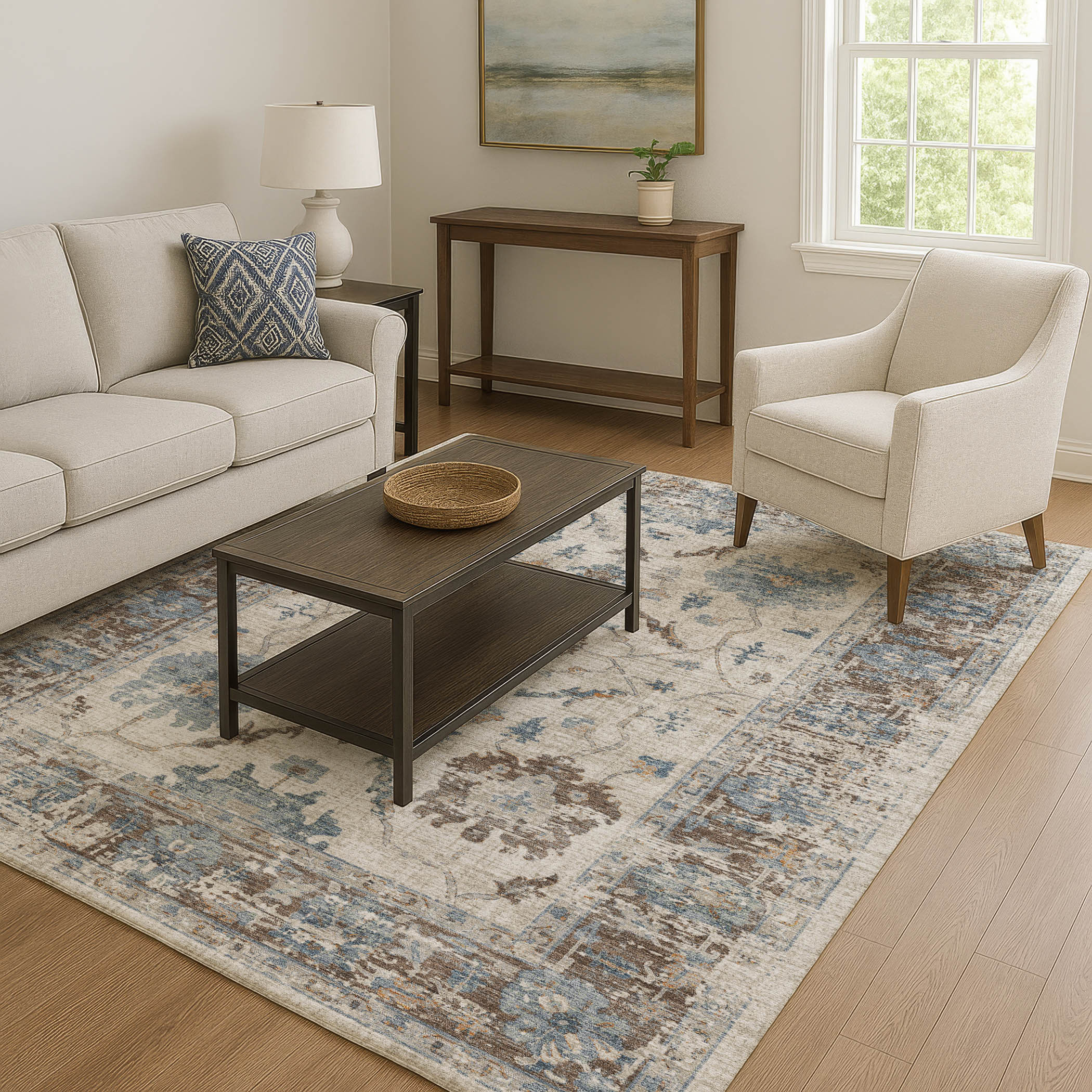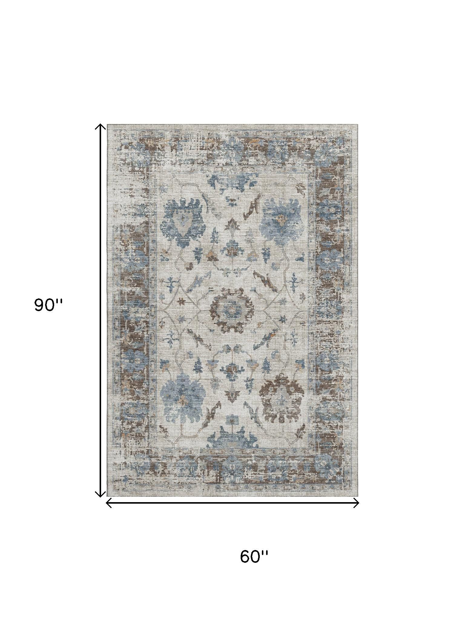 This 5-foot x 8-foot beige blue and brown oriental washable area rug with uv protection, is a great way to add warmth to a room. Ideal for spaces with kids and pets, this rug is stain resistant to help repel dirt and spilled liquids. Built to last, this rug crafted from polyester fibers is known for its durability and long lasting appeal. Rugs are a great way to showcase your style, hide imperfections, warm your home and reduce noise. This larger sized, traditional styled rug is ready to create a focal point or statement piece in your room. 60.00-inch h x 90.00-inch w x 0.39-inch d.