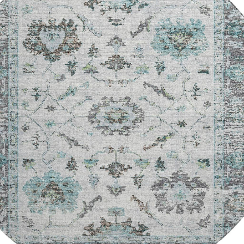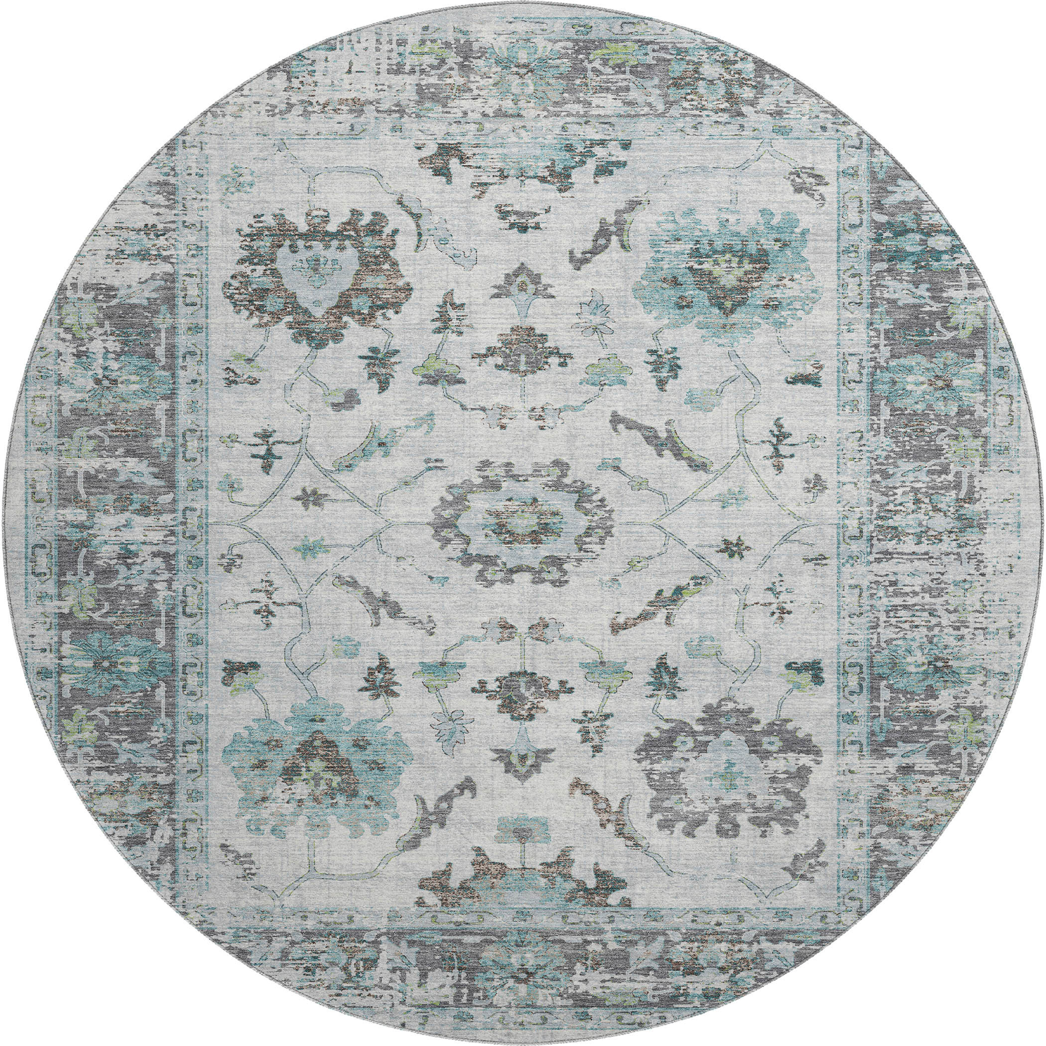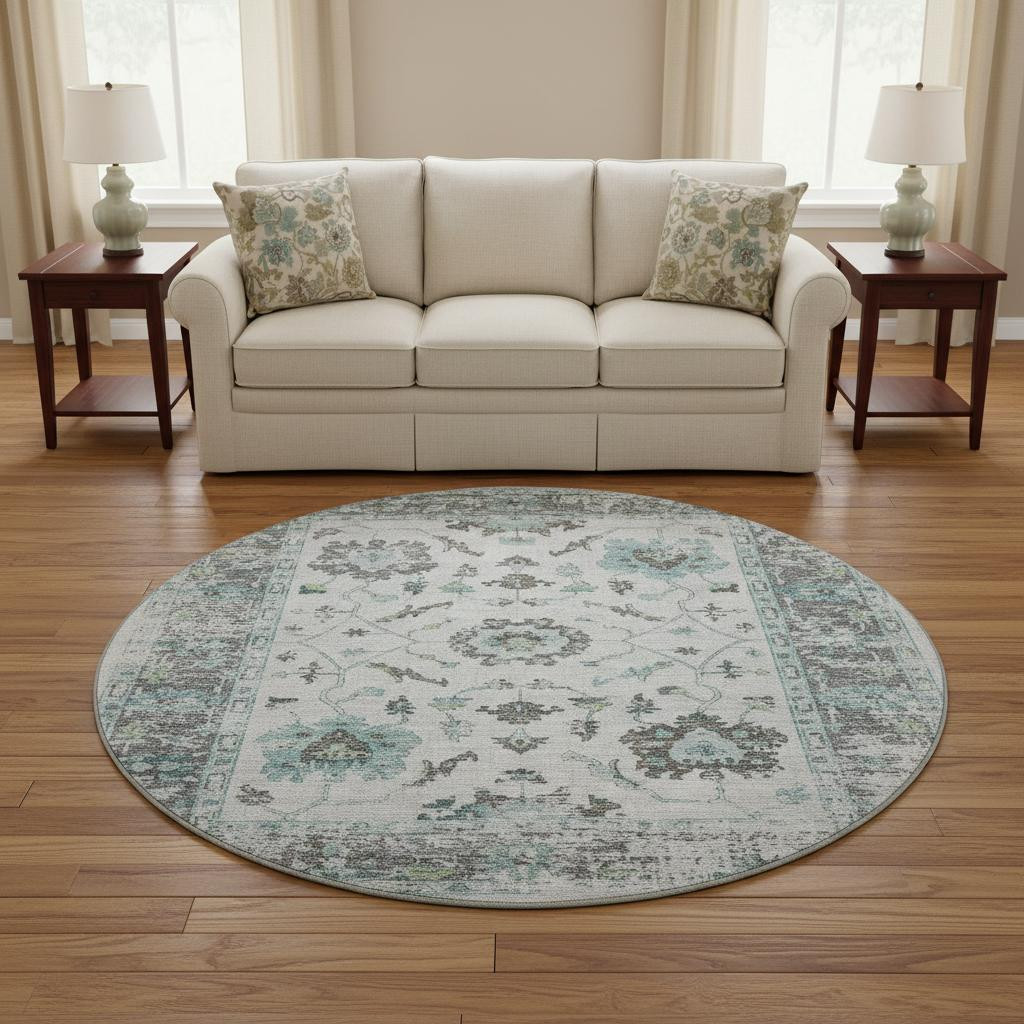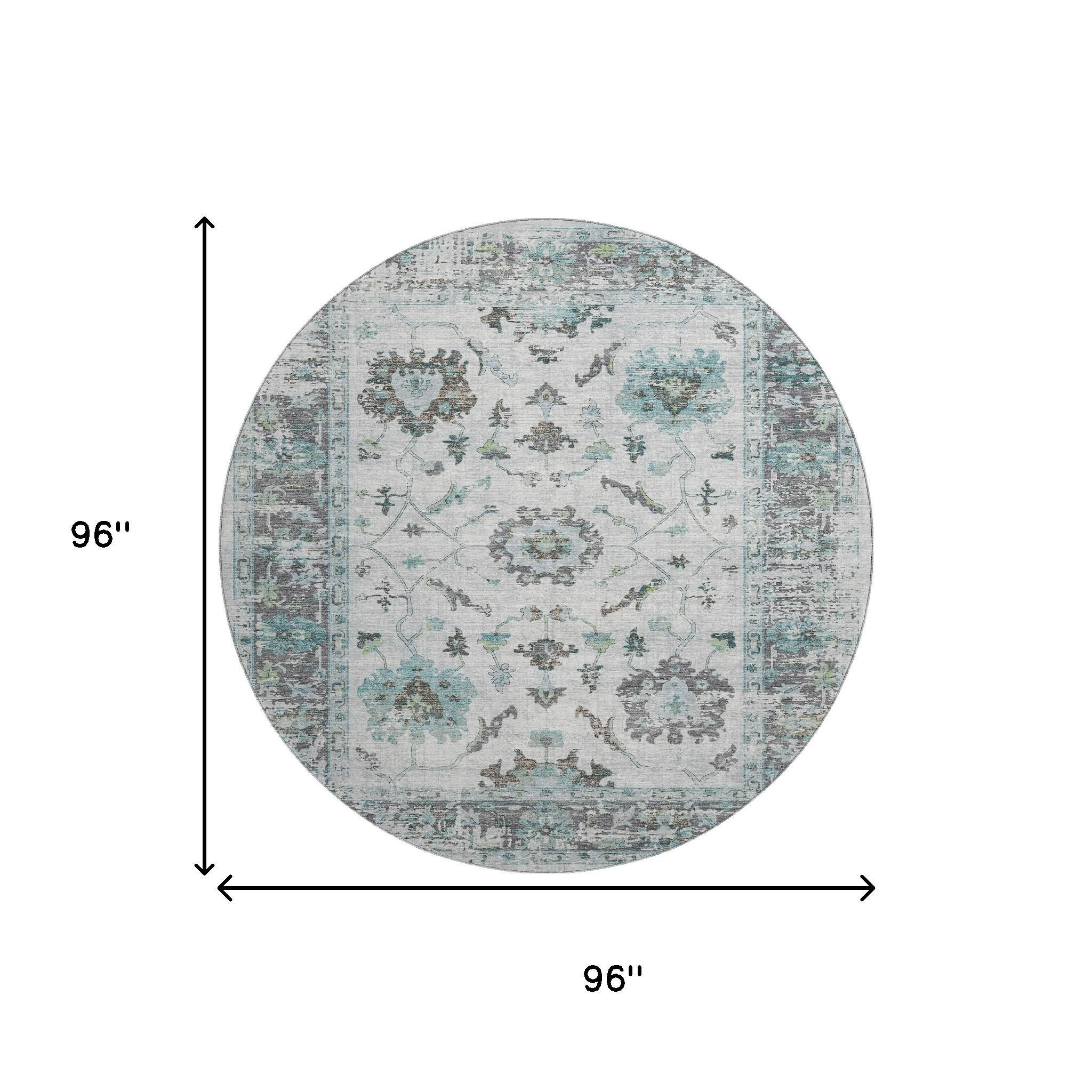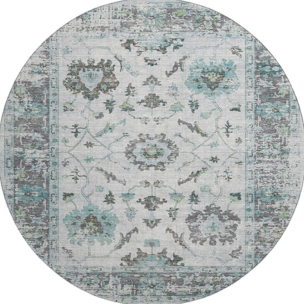 Add great coloration and comfortable texture to your space with this 8-foot teal gray and charcoal oriental washable round rug with uv protection. Ideal for spaces with kids and pets, this rug is stain resistant to help repel dirt and spilled liquids. Built to last, this rug crafted from polyester fibers is known for its durability and long lasting appeal. Rugs are a great way to showcase your style, hide imperfections, warm your home and reduce noise. This larger sized, traditional styled rug is ready to create a focal point or statement piece in your room. 96.00-inch h x 96.00-inch w x 0.39-inch d.