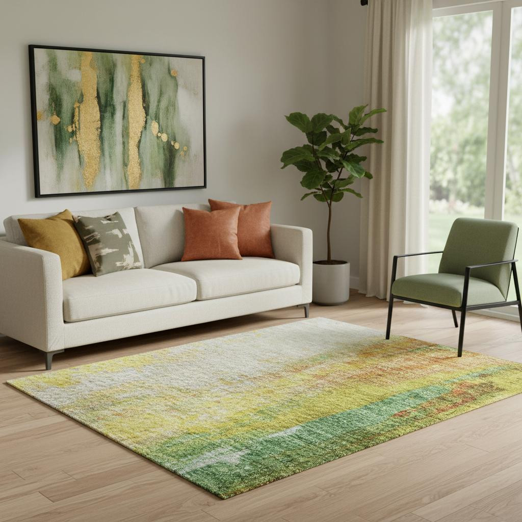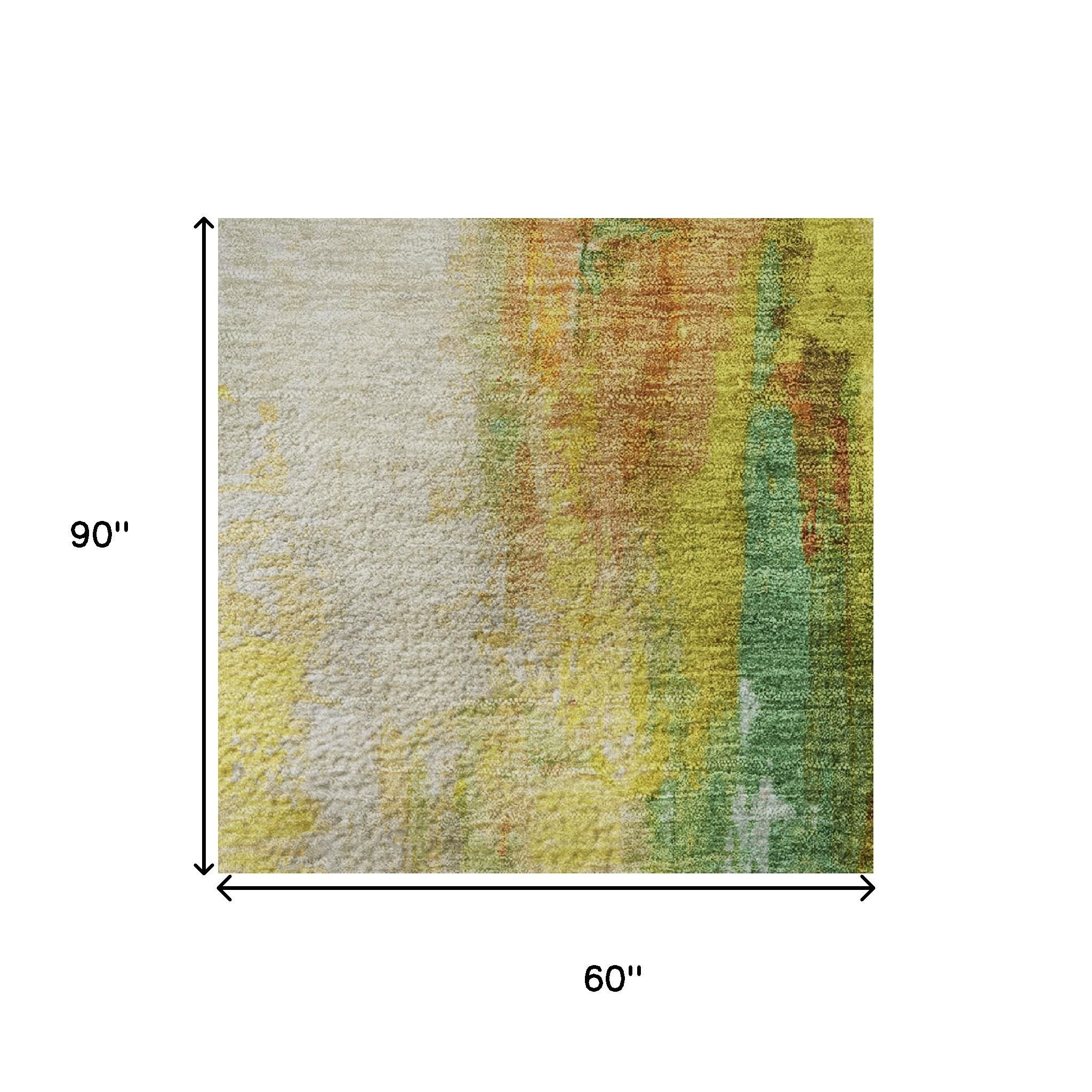 This 5-foot x 8-foot green gold and orange abstract washable area rug with uv protection, is a great way to add warmth to a room. Ideal for spaces with kids and pets, this rug is stain resistant to help repel dirt and spilled liquids. Built to last, this rug crafted from polyester fibers is known for its durability and long lasting appeal. Rugs are a great way to showcase your style, hide imperfections, warm your home and reduce noise. This larger sized, transitional styled rug is ready to create a focal point or statement piece in your room. 60.00-inch h x 90.00-inch w x 0.39-inch d.