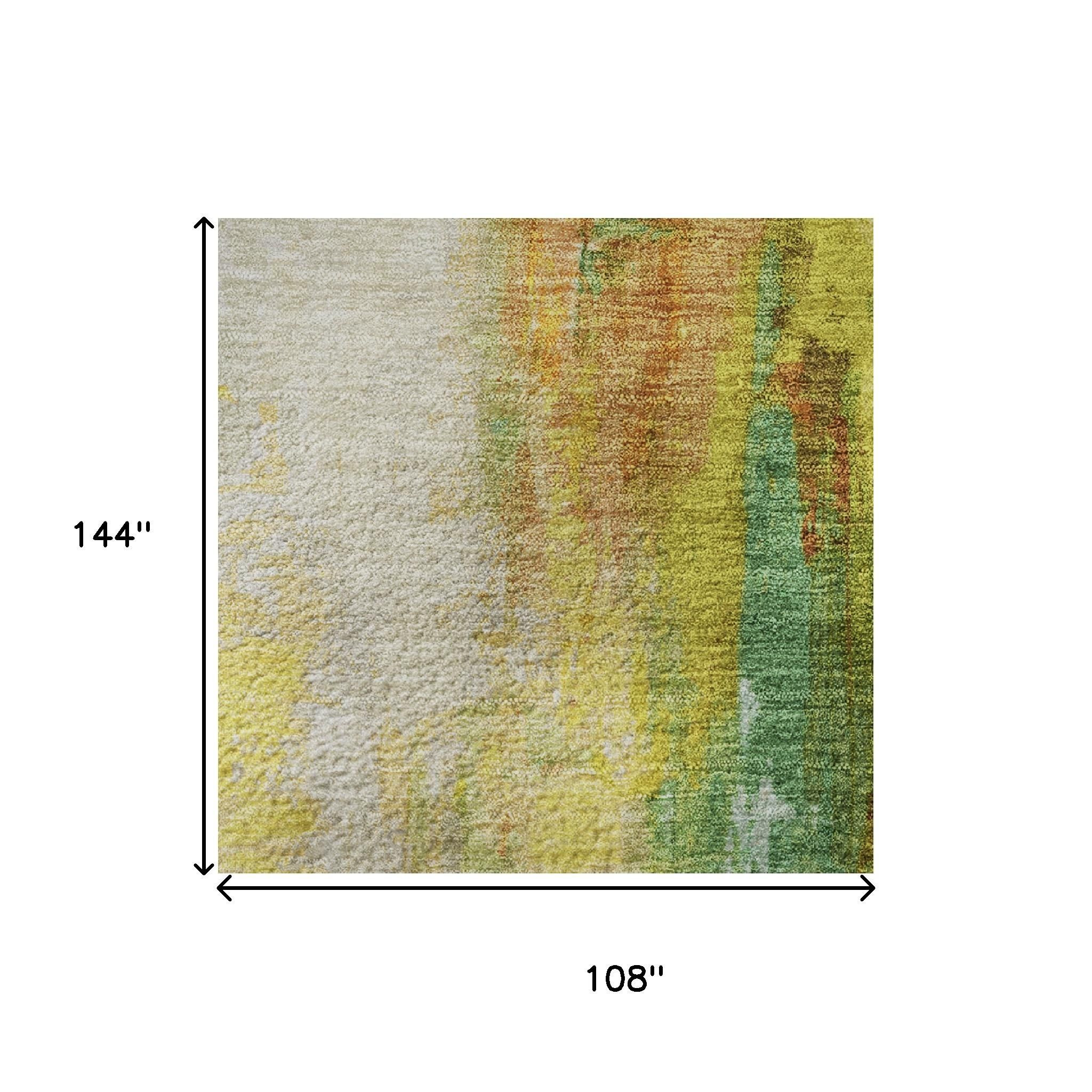 Add great coloration and comfortable texture to your space with this 9-foot x 12-foot green gold and orange abstract washable area rug with uv protection. Ideal for spaces with kids and pets, this rug is stain resistant to help repel dirt and spilled liquids. Built to last, this rug crafted from polyester fibers is known for its durability and long lasting appeal. Rugs are a great way to showcase your style, hide imperfections, warm your home and reduce noise. This larger sized, transitional styled rug is ready to create a focal point or statement piece in your room. 108.00-inch h x 144.00-inch w x 0.39-inch d.