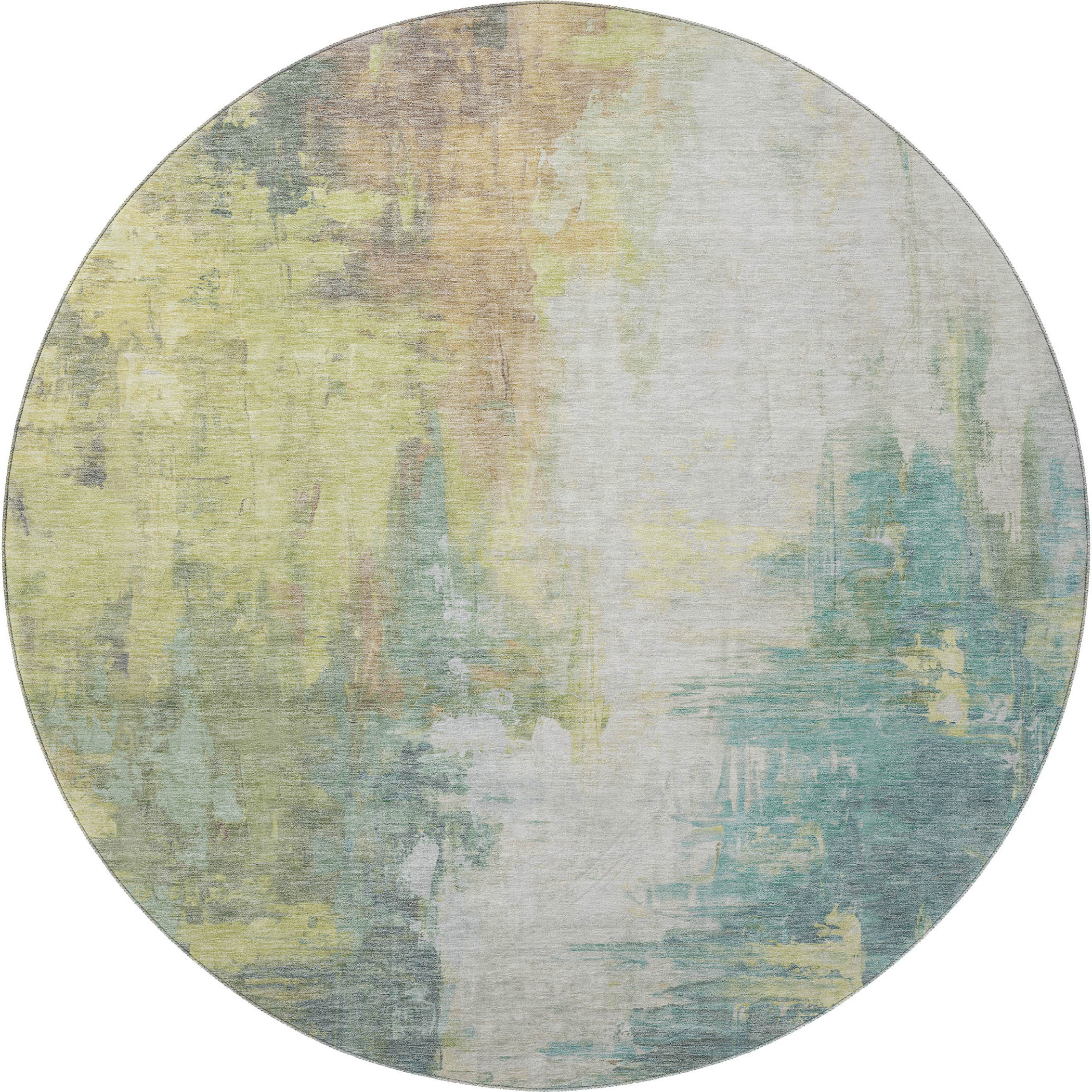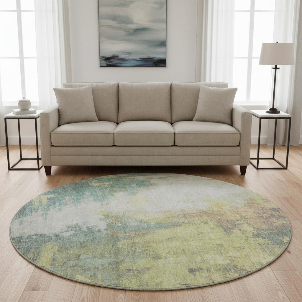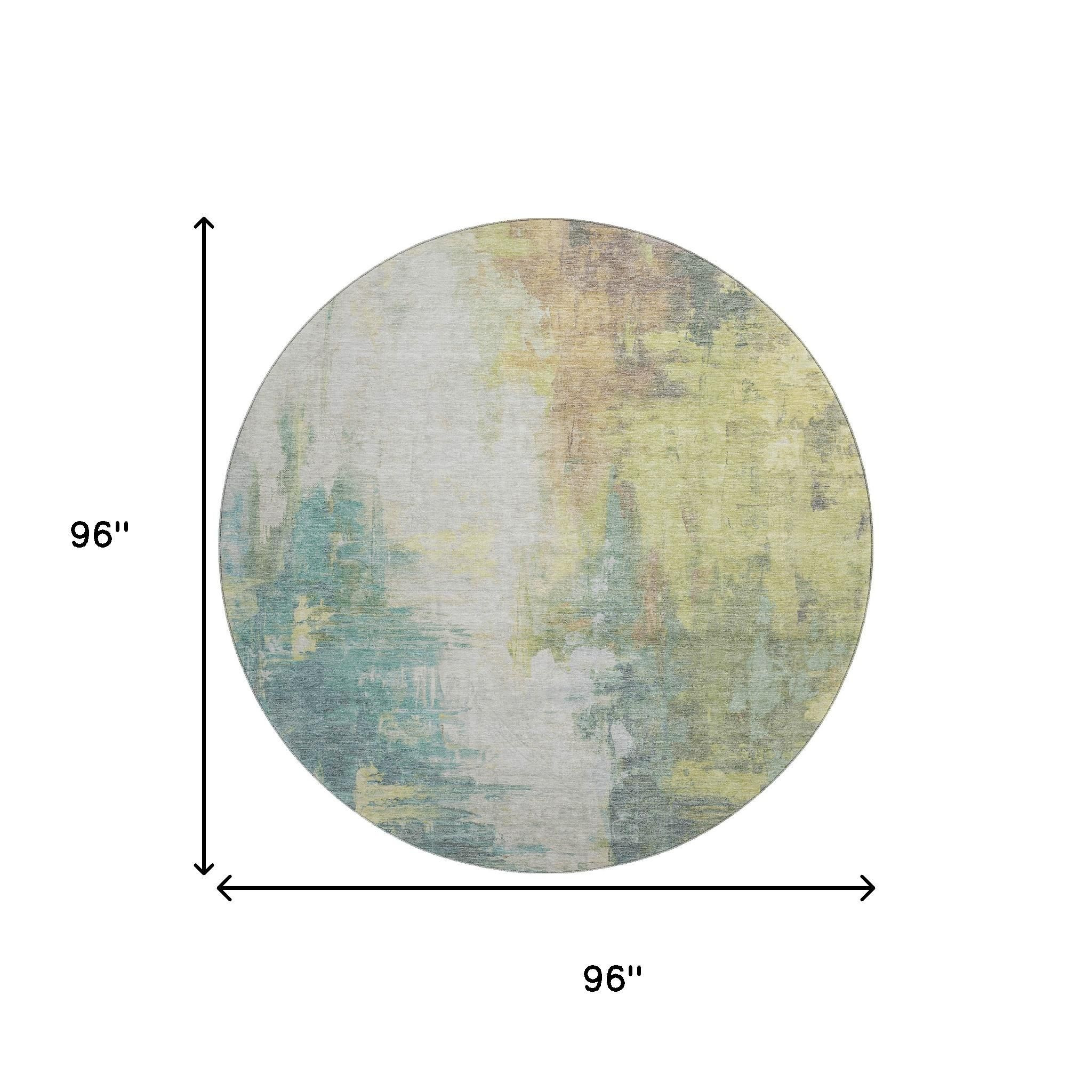 Set an inviting tone in your space with this 8-foot pale aqua ivory and teal abstract washable round rug with uv protection. Ideal for spaces with kids and pets, this rug is stain resistant to help repel dirt and spilled liquids. Built to last, this rug crafted from polyester fibers is known for its durability and long lasting appeal. Rugs are a great way to showcase your style, hide imperfections, warm your home and reduce noise. This larger sized, transitional styled rug is ready to create a focal point or statement piece in your room. 96.00-inch h x 96.00-inch w x 0.39-inch d.