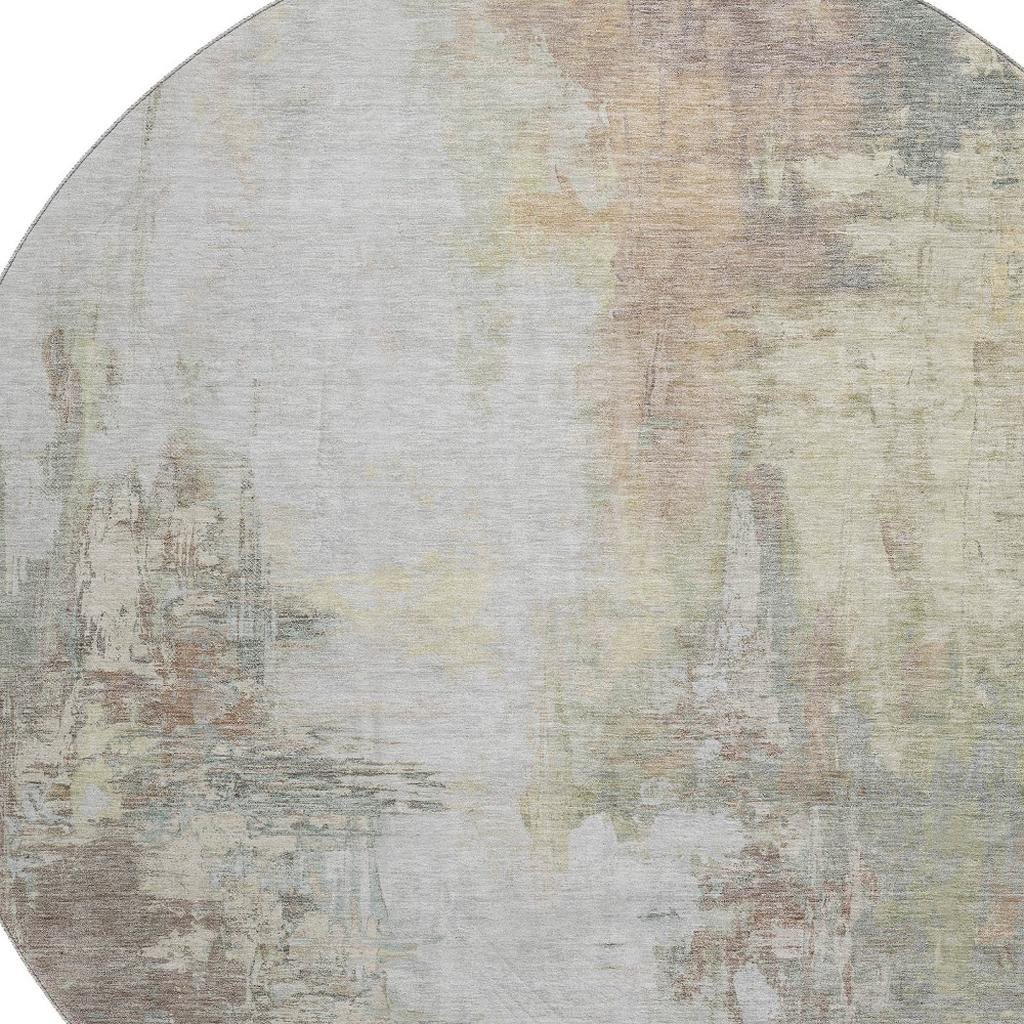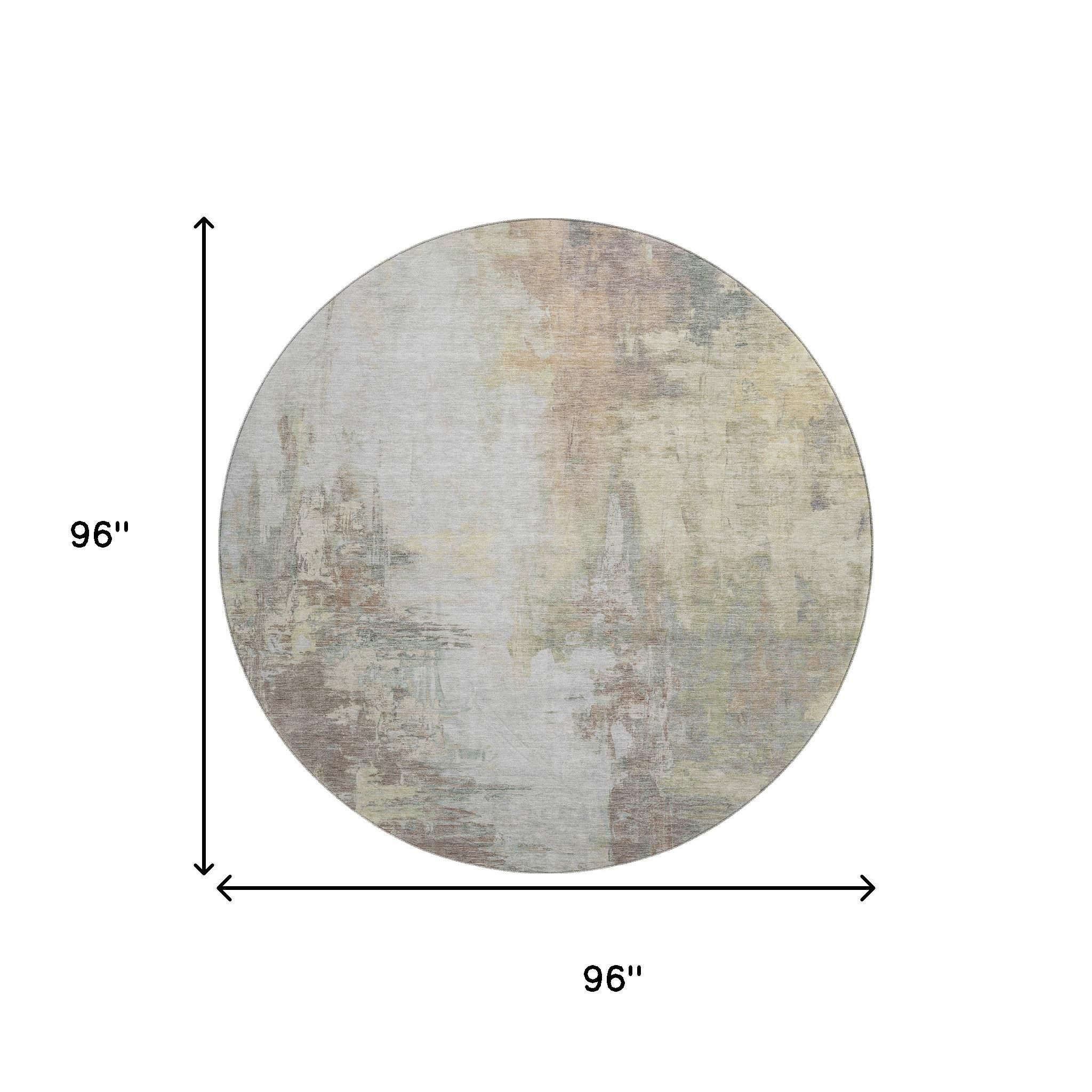 This 8-foot tan beige and gray abstract washable round rug with uv protection, is a great way to add warmth to a room. Ideal for spaces with kids and pets, this rug is stain resistant to help repel dirt and spilled liquids. Built to last, this rug crafted from polyester fibers is known for its durability and long lasting appeal. Rugs are a great way to showcase your style, hide imperfections, warm your home and reduce noise. This larger sized, transitional styled rug is ready to create a focal point or statement piece in your room. 96.00-inch h x 96.00-inch w x 0.39-inch d.