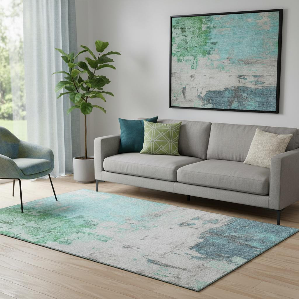 Set an inviting tone in your space with this 5-foot x 8-foot teal green and ivory abstract washable area rug with uv protection. Ideal for spaces with kids and pets, this rug is stain resistant to help repel dirt and spilled liquids. Built to last, this rug crafted from polyester fibers is known for its durability and long lasting appeal. Rugs are a great way to showcase your style, hide imperfections, warm your home and reduce noise. This larger sized, transitional styled rug is ready to create a focal point or statement piece in your room. 60.00-inch h x 90.00-inch w x 0.39-inch d.