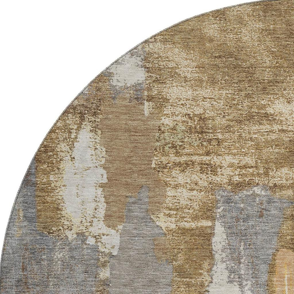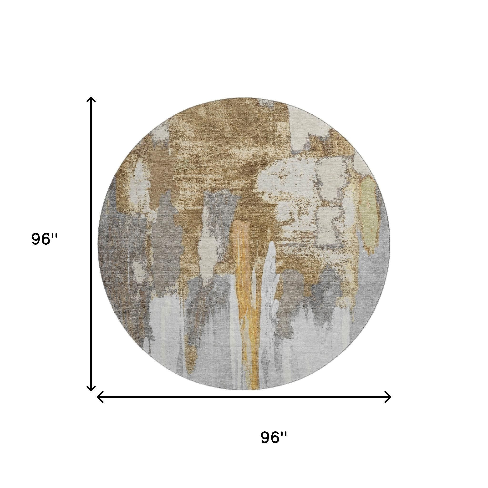 Add some artistry to your room with this 8-foot ivory brown and gray abstract washable round rug with uv protection. Ideal for spaces with kids and pets, this rug is stain resistant to help repel dirt and spilled liquids. Built to last, this rug crafted from polyester fibers is known for its durability and long lasting appeal. Rugs are a great way to showcase your style, hide imperfections, warm your home and reduce noise. This larger sized, transitional styled rug is ready to create a focal point or statement piece in your room. 96.00-inch h x 96.00-inch w x 0.39-inch d.
