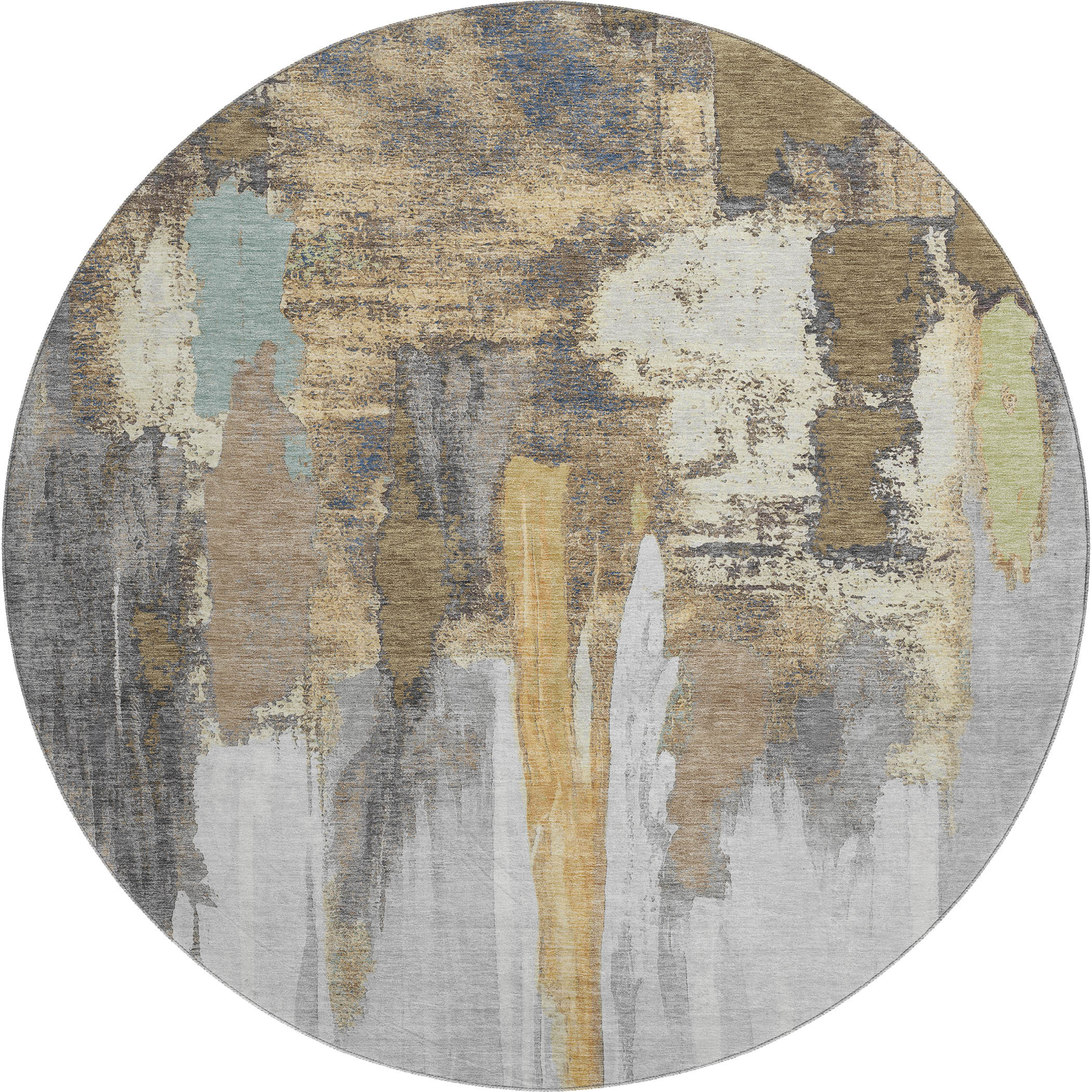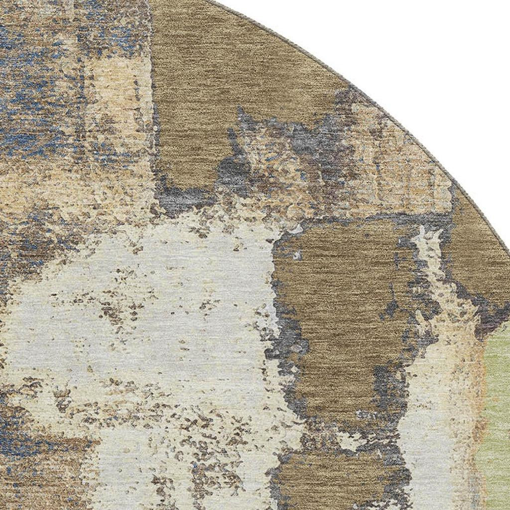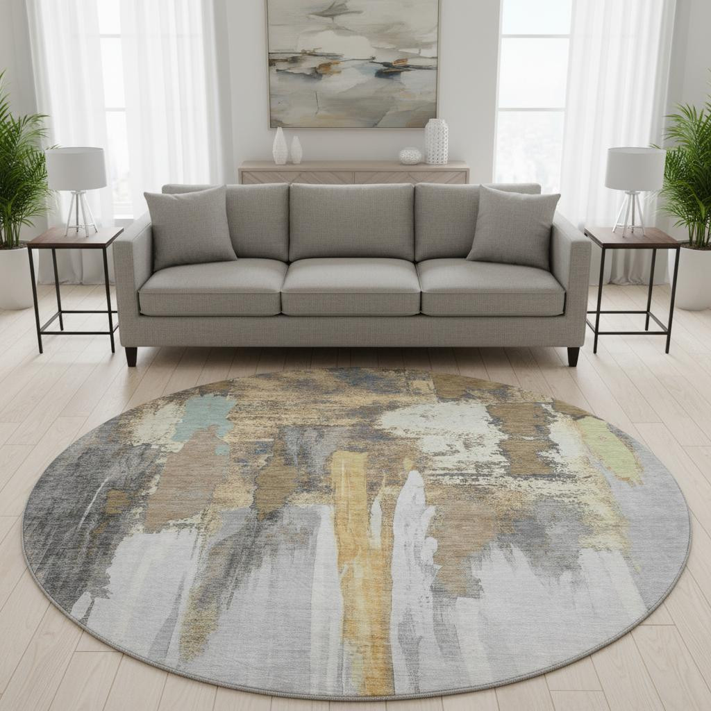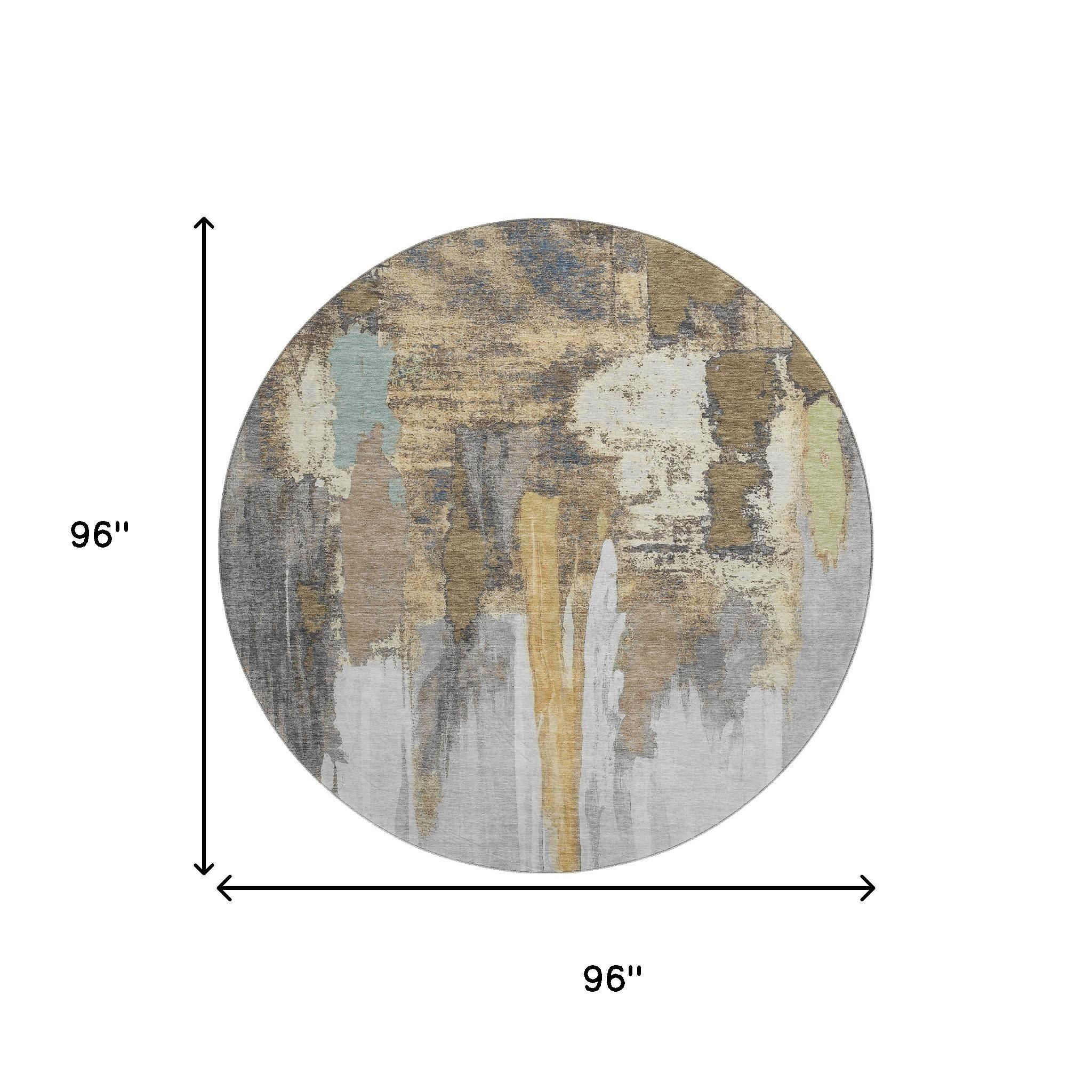 This 8-foot taupe ivory and gray abstract washable round rug with uv protection, is a great way to add warmth to a room. Ideal for spaces with kids and pets, this rug is stain resistant to help repel dirt and spilled liquids. Built to last, this rug crafted from polyester fibers is known for its durability and long lasting appeal. Rugs are a great way to showcase your style, hide imperfections, warm your home and reduce noise. This larger sized, transitional styled rug is ready to create a focal point or statement piece in your room. 96.00-inch h x 96.00-inch w x 0.39-inch d.