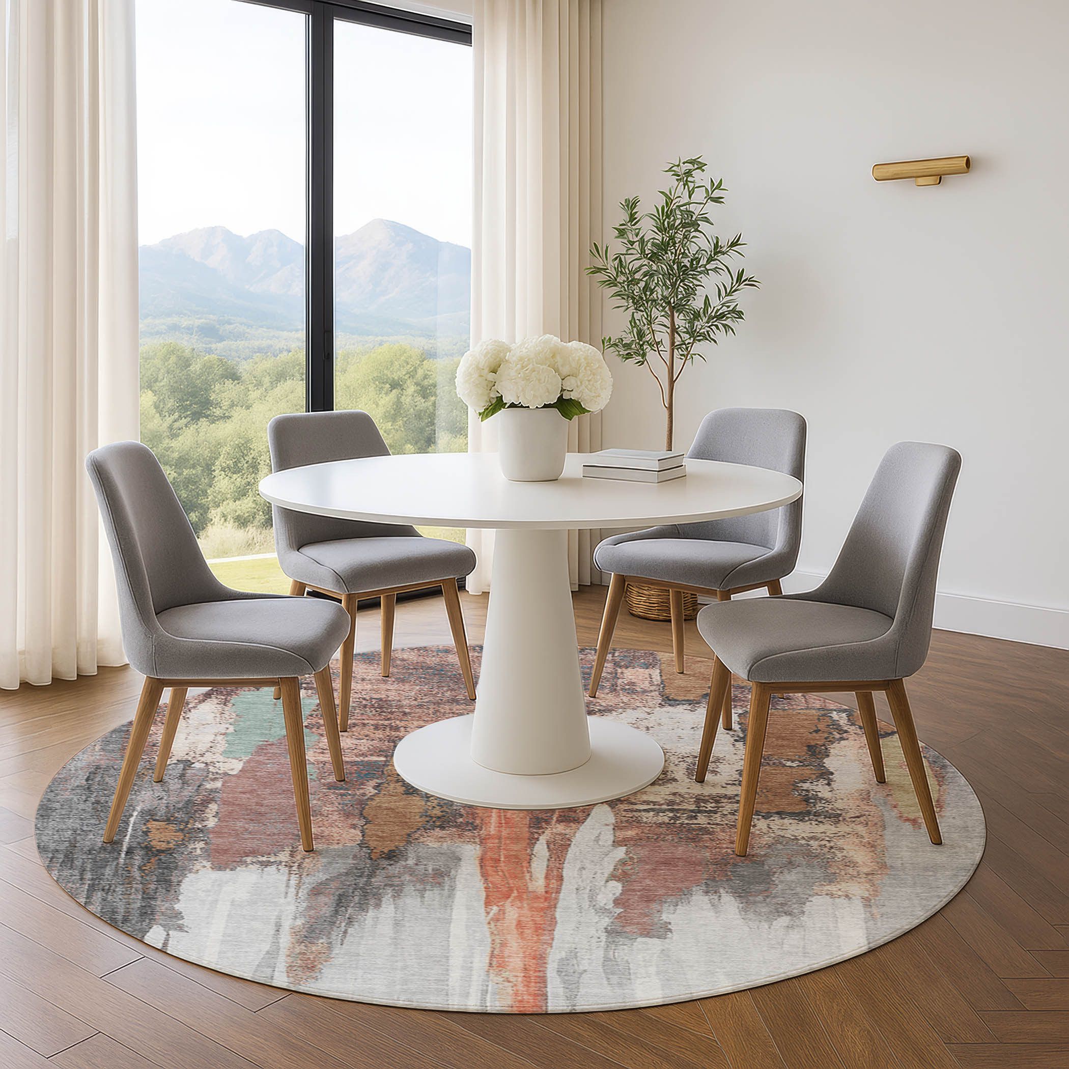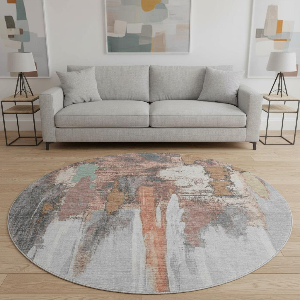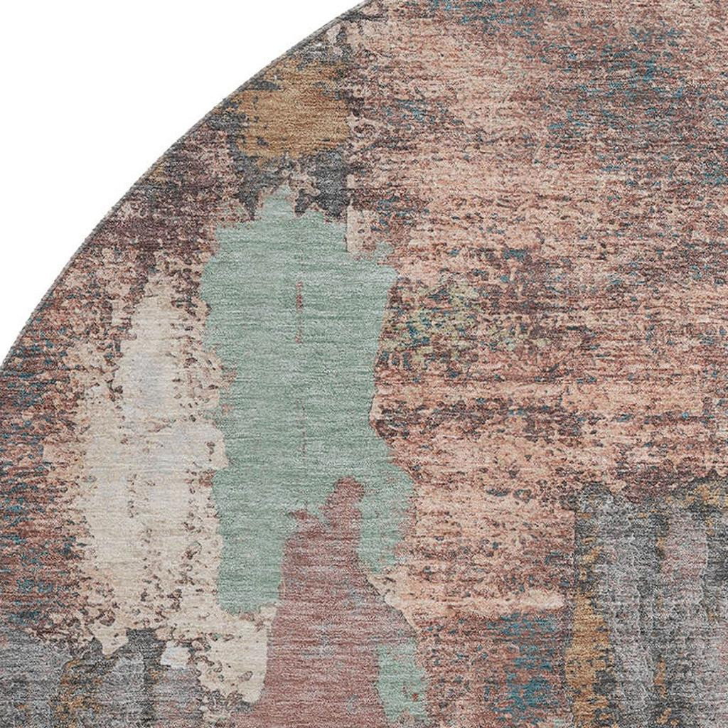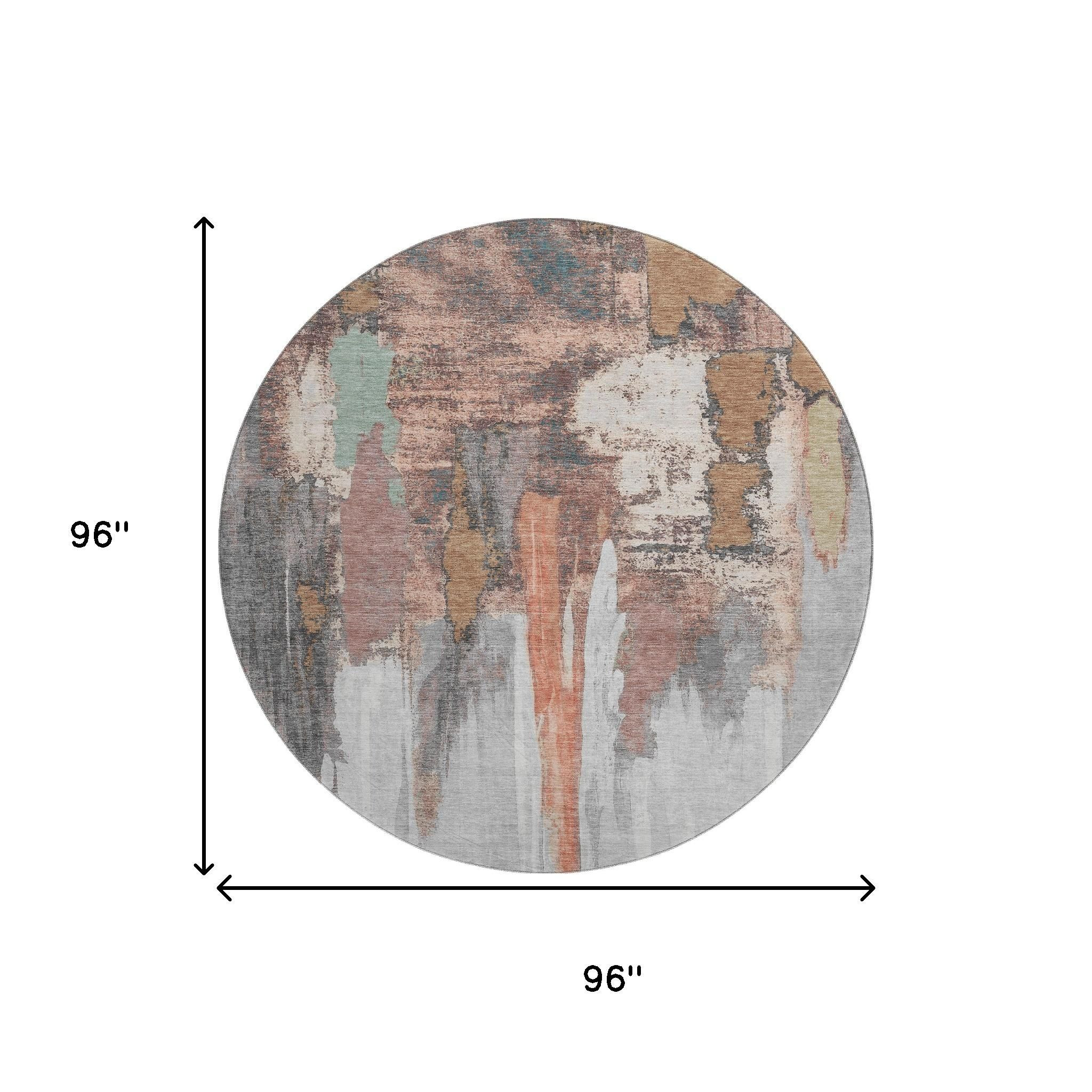 Set an inviting tone in your space with this 8-foot terra cotta ivory and gray abstract washable round rug with uv protection. Ideal for spaces with kids and pets, this rug is stain resistant to help repel dirt and spilled liquids. Built to last, this rug crafted from polyester fibers is known for its durability and long lasting appeal. Rugs are a great way to showcase your style, hide imperfections, warm your home and reduce noise. This larger sized, transitional styled rug is ready to create a focal point or statement piece in your room. 96.00-inch h x 96.00-inch w x 0.39-inch d.