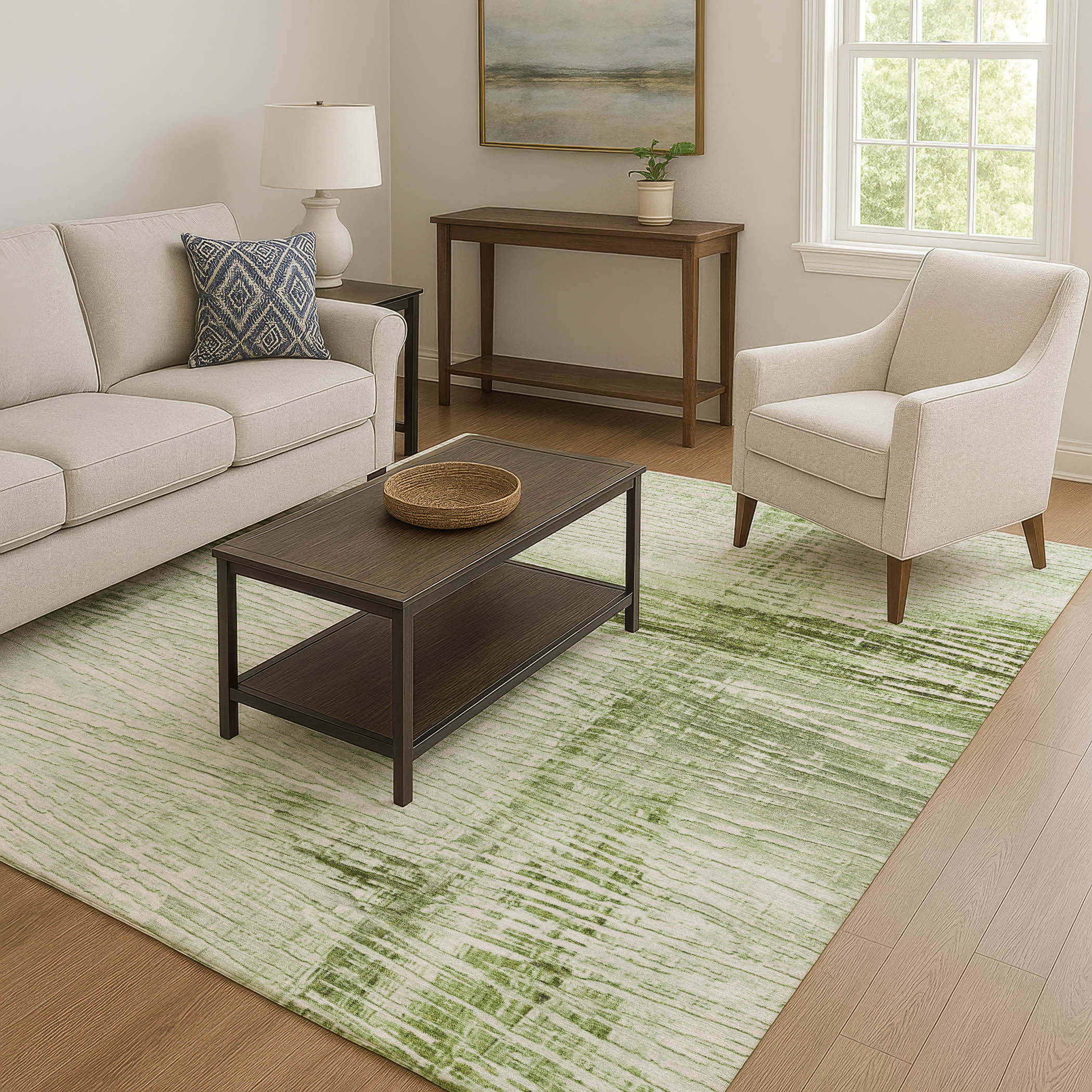 Set an inviting tone in your space with this 8-foot x 10-foot artichoke green and ivory striped washable area rug with uv protection. Ideal for spaces with kids and pets, this rug is stain resistant to help repel dirt and spilled liquids. Built to last, this rug crafted from polyester fibers is known for its durability and long lasting appeal. Rugs are a great way to showcase your style, hide imperfections, warm your home and reduce noise. This larger sized, transitional styled rug is ready to create a focal point or statement piece in your room. 96.00-inch h x 120.00-inch w x 0.39-inch d.