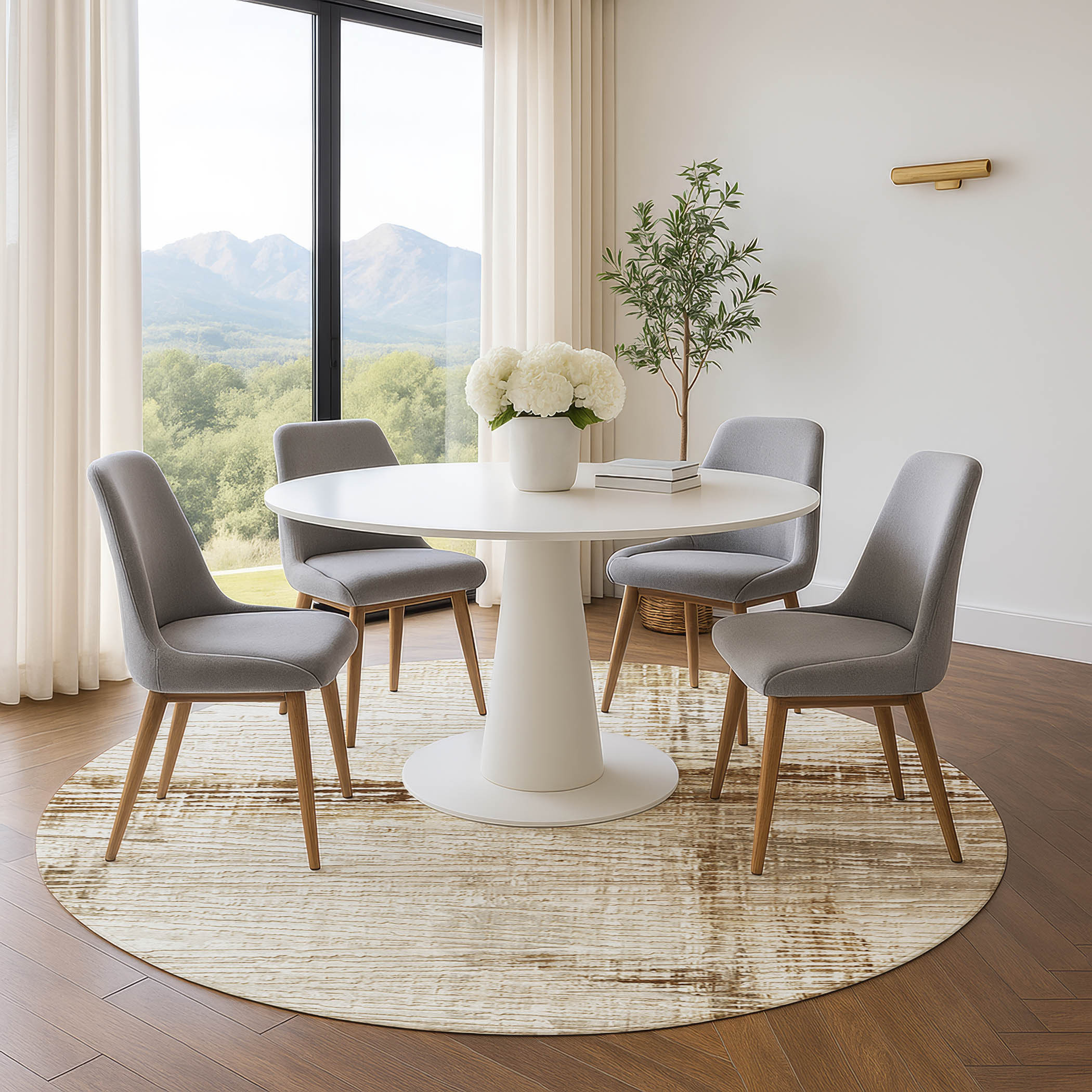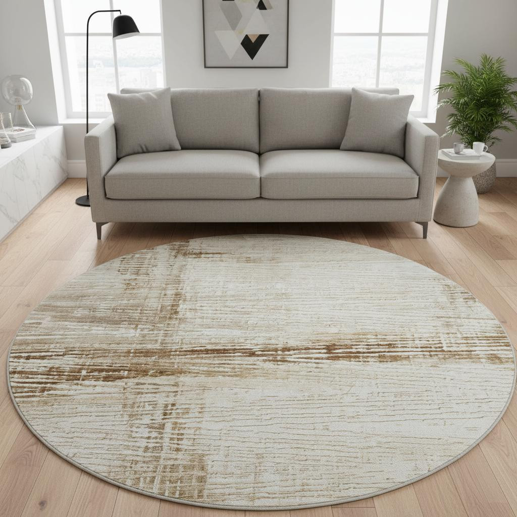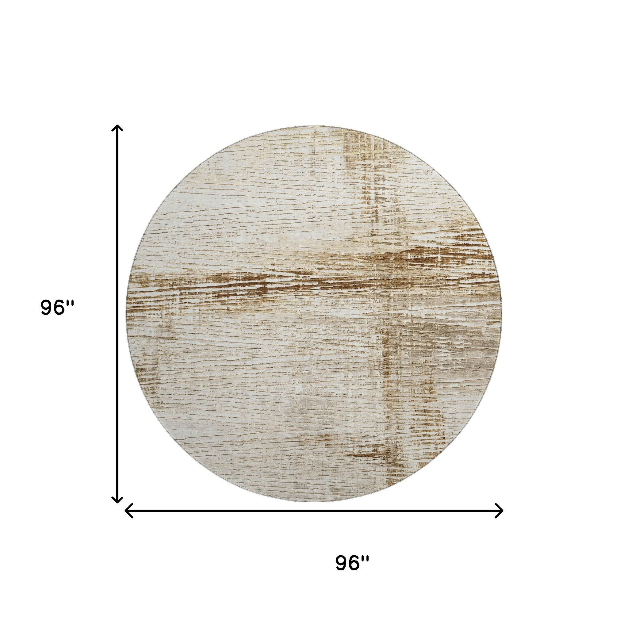 This 8-foot ivory and brown striped washable round rug with uv protection, is a great way to add warmth to a room. Ideal for spaces with kids and pets, this rug is stain resistant to help repel dirt and spilled liquids. Built to last, this rug crafted from polyester fibers is known for its durability and long lasting appeal. Rugs are a great way to showcase your style, hide imperfections, warm your home and reduce noise. This larger sized, transitional styled rug is ready to create a focal point or statement piece in your room. 96.00-inch h x 96.00-inch w x 0.39-inch d.