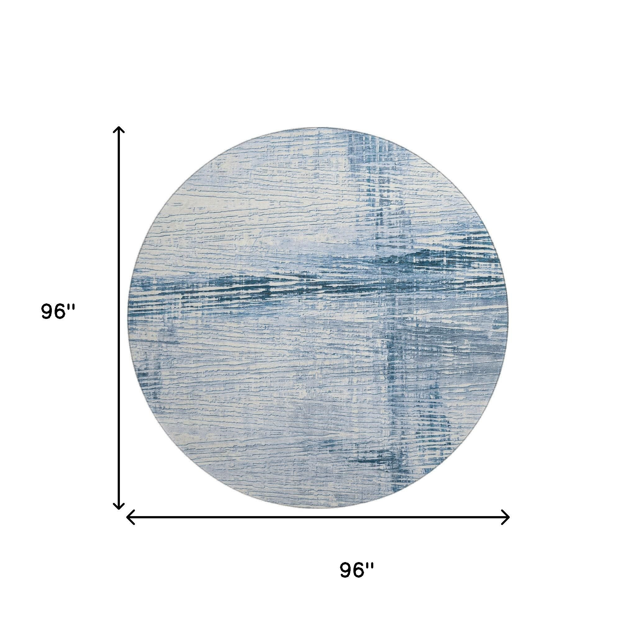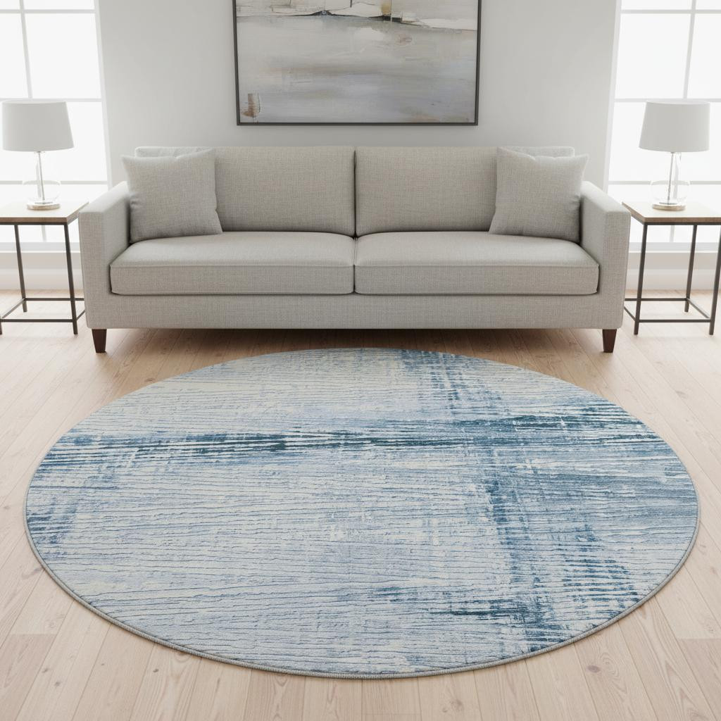 Set an inviting tone in your space with this 8-foot sky blue and ivory striped washable round rug with uv protection. Ideal for spaces with kids and pets, this rug is stain resistant to help repel dirt and spilled liquids. Built to last, this rug crafted from polyester fibers is known for its durability and long lasting appeal. Rugs are a great way to showcase your style, hide imperfections, warm your home and reduce noise. This larger sized, transitional styled rug is ready to create a focal point or statement piece in your room. 96.00-inch h x 96.00-inch w x 0.39-inch d.