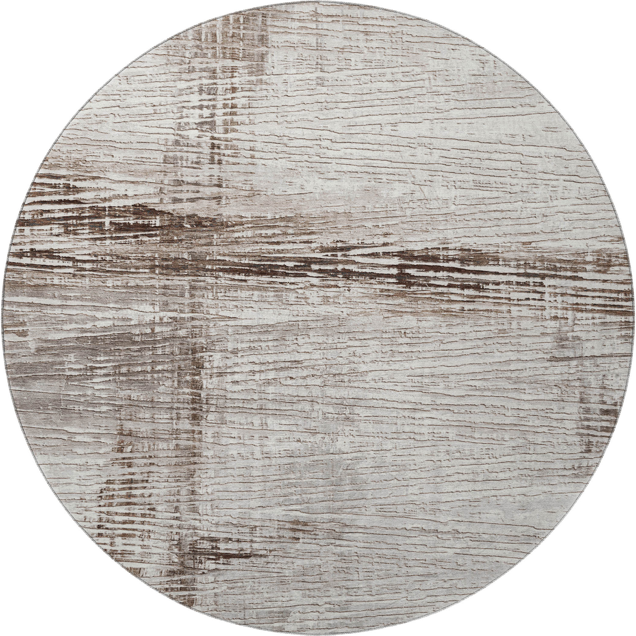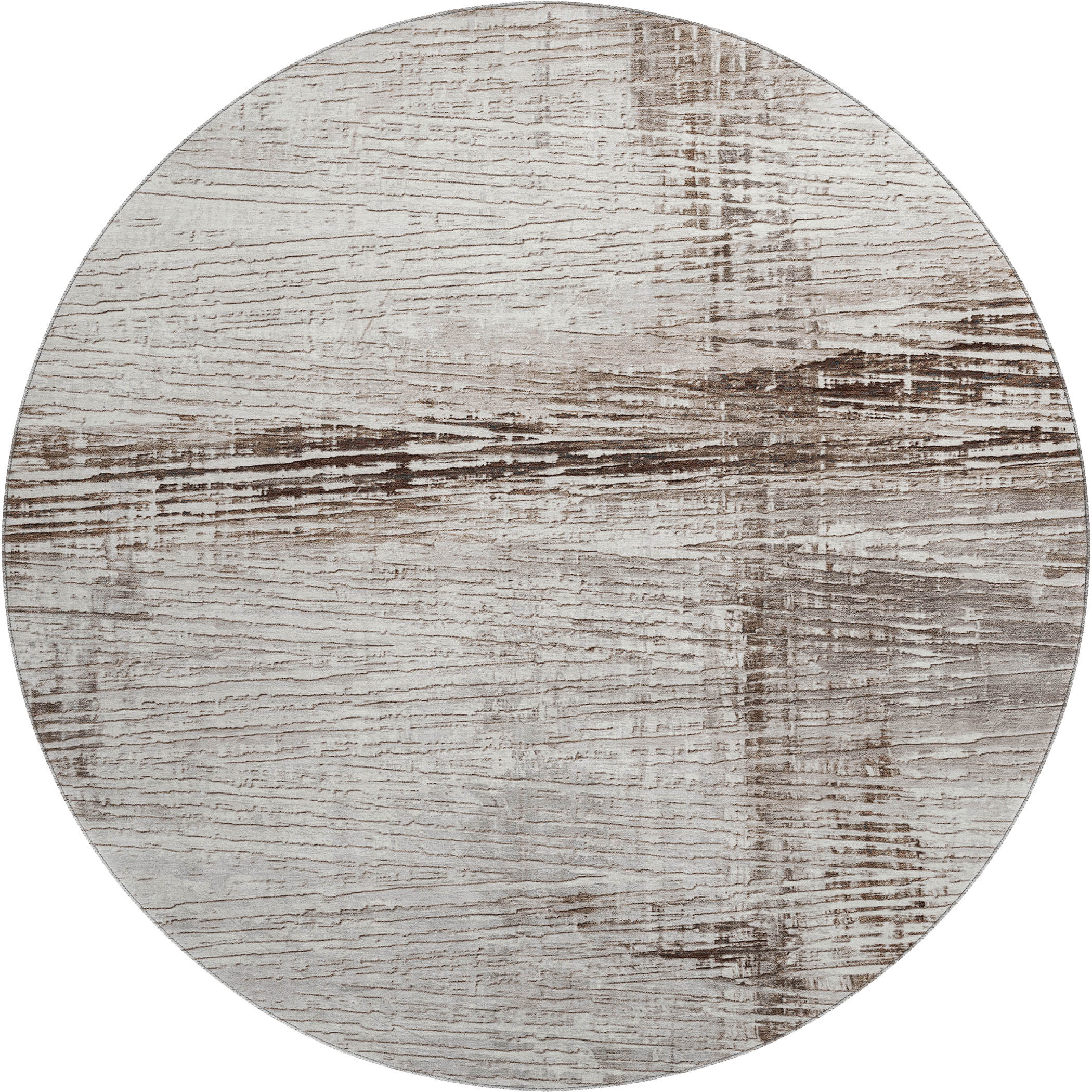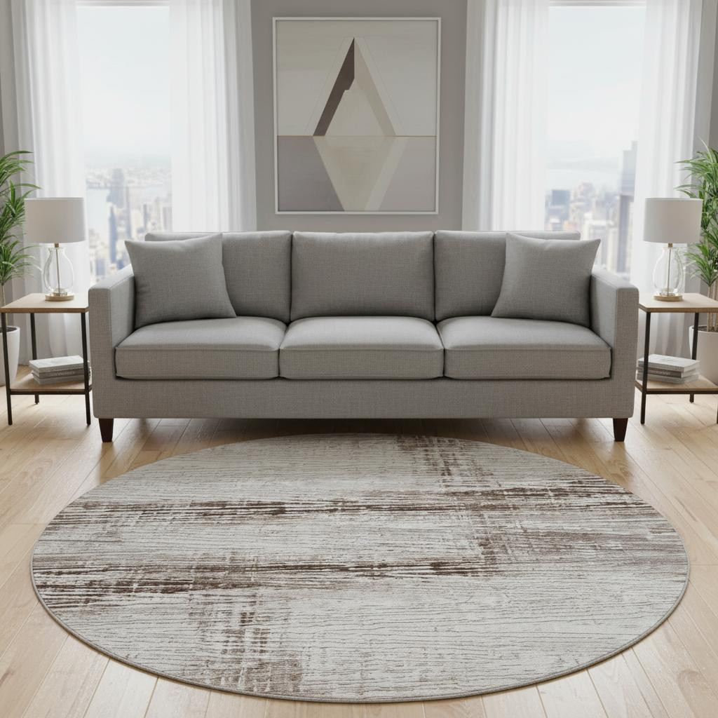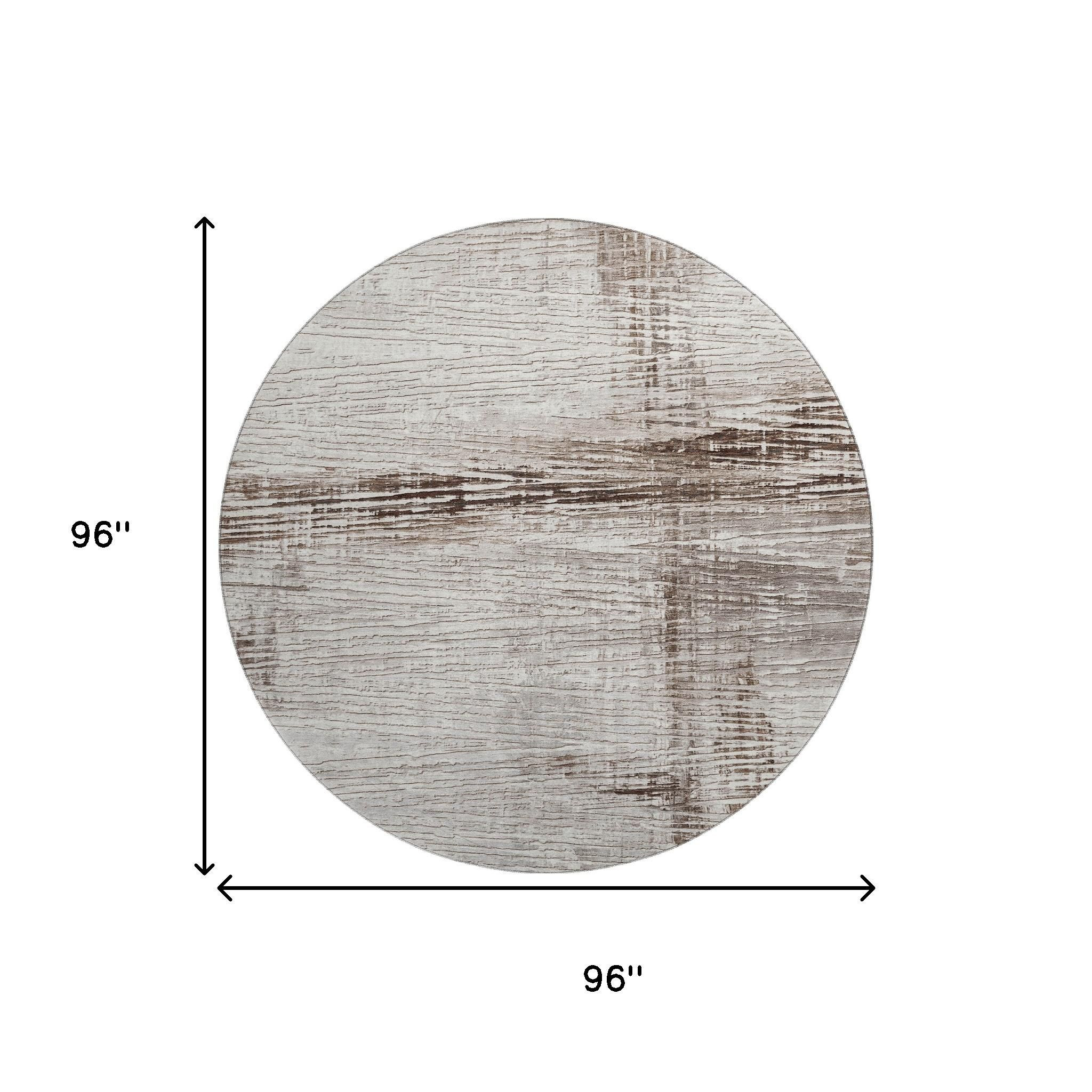 Add some artistry to your room with this 8-foot taupe and ivory striped washable round rug with uv protection. Ideal for spaces with kids and pets, this rug is stain resistant to help repel dirt and spilled liquids. Built to last, this rug crafted from polyester fibers is known for its durability and long lasting appeal. Rugs are a great way to showcase your style, hide imperfections, warm your home and reduce noise. This larger sized, transitional styled rug is ready to create a focal point or statement piece in your room. 96.00-inch h x 96.00-inch w x 0.39-inch d.