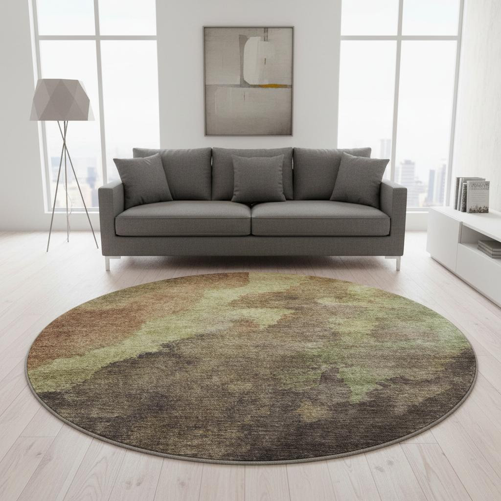 This 8-foot coffee and taupe abstract washable round rug with uv protection, is a great way to add warmth to a room. Ideal for spaces with kids and pets, this rug is stain resistant to help repel dirt and spilled liquids. Built to last, this rug crafted from polyester fibers is known for its durability and long lasting appeal. Rugs are a great way to showcase your style, hide imperfections, warm your home and reduce noise. This larger sized, transitional styled rug is ready to create a focal point or statement piece in your room. 96.00-inch h x 96.00-inch w x 0.39-inch d.
